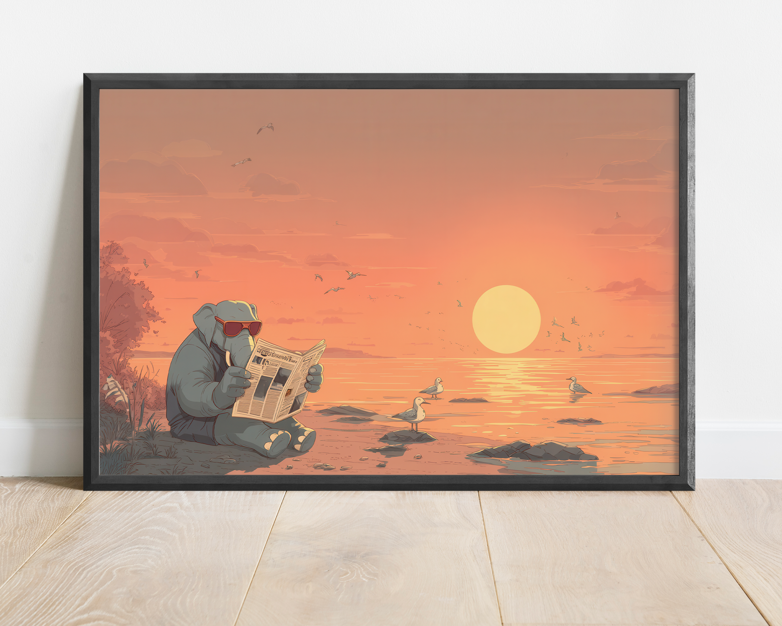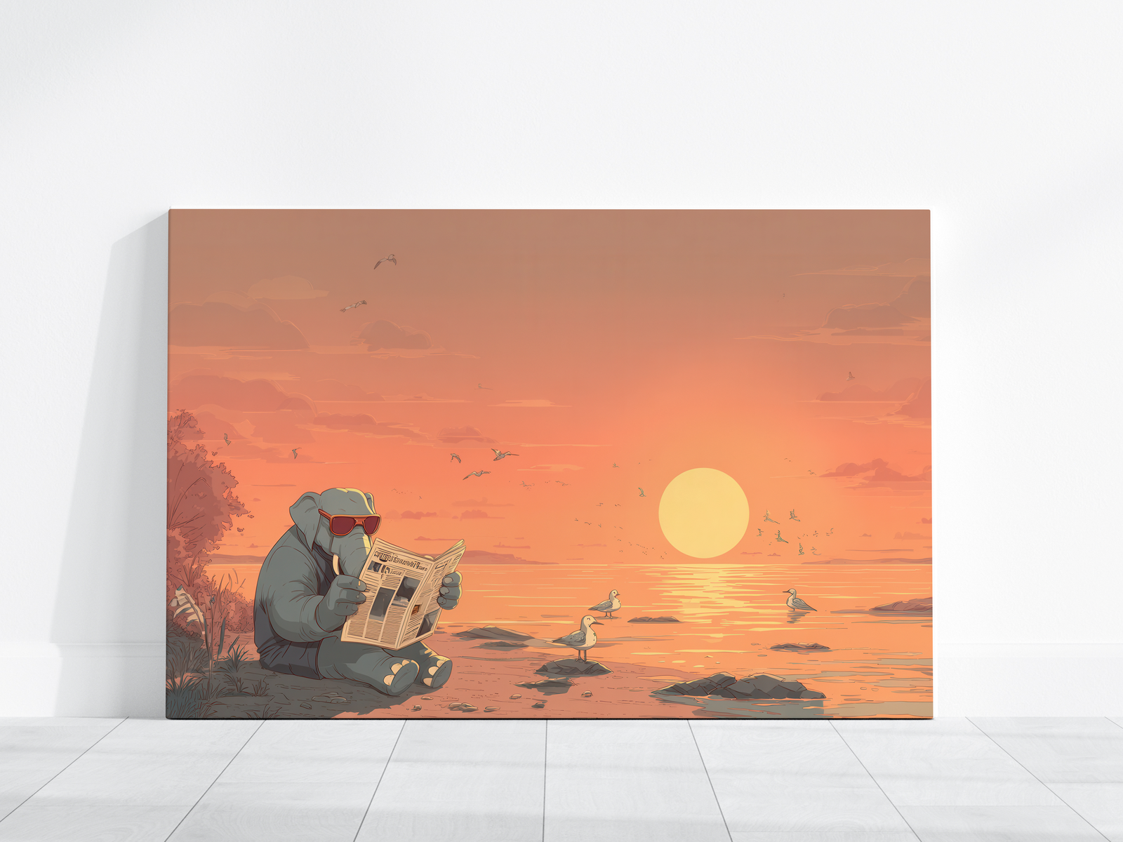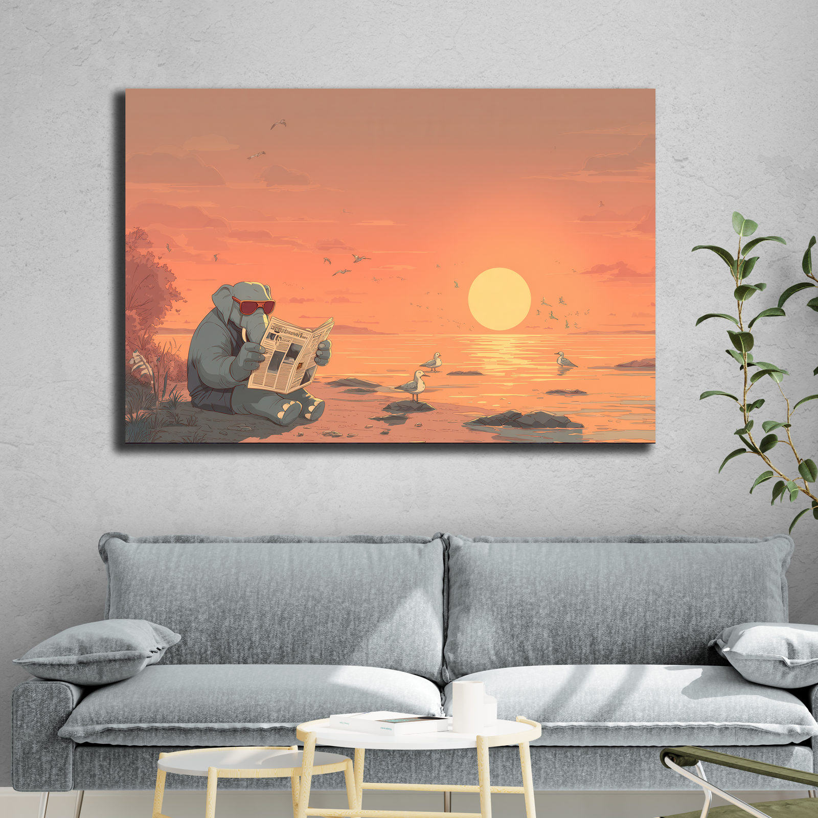 Funny Elephant Poster, Elephant Reading Newspaper on Beach at Sunset, Cute Animal Wall Art Print, Nursery Living Room Painting Canvas