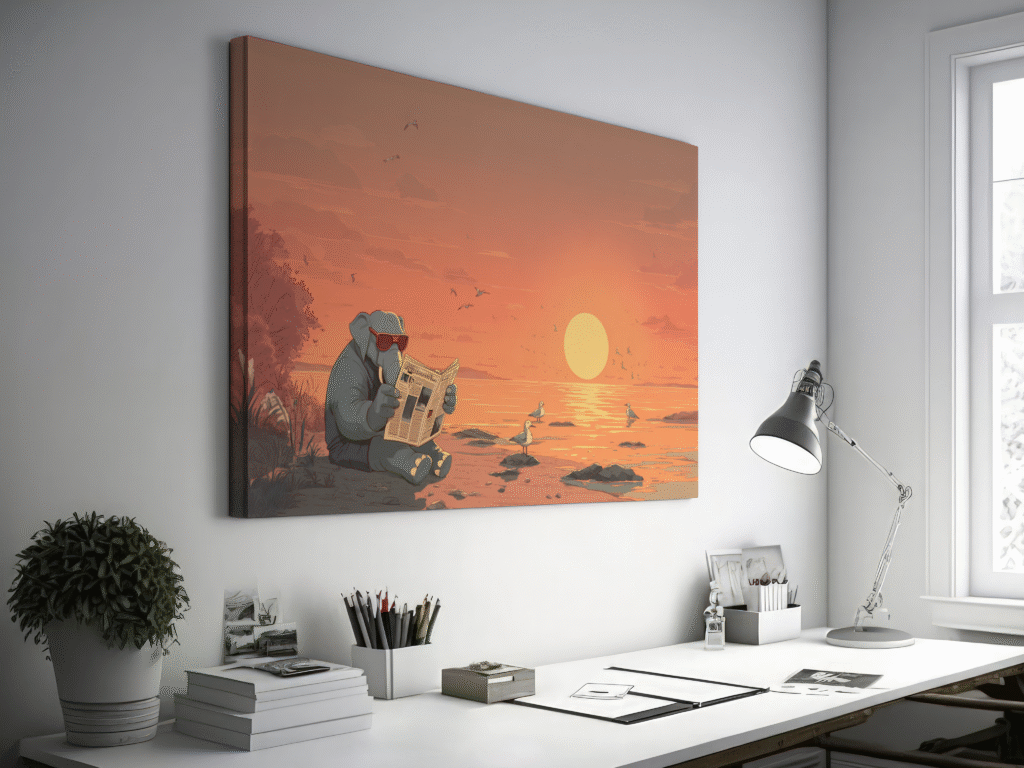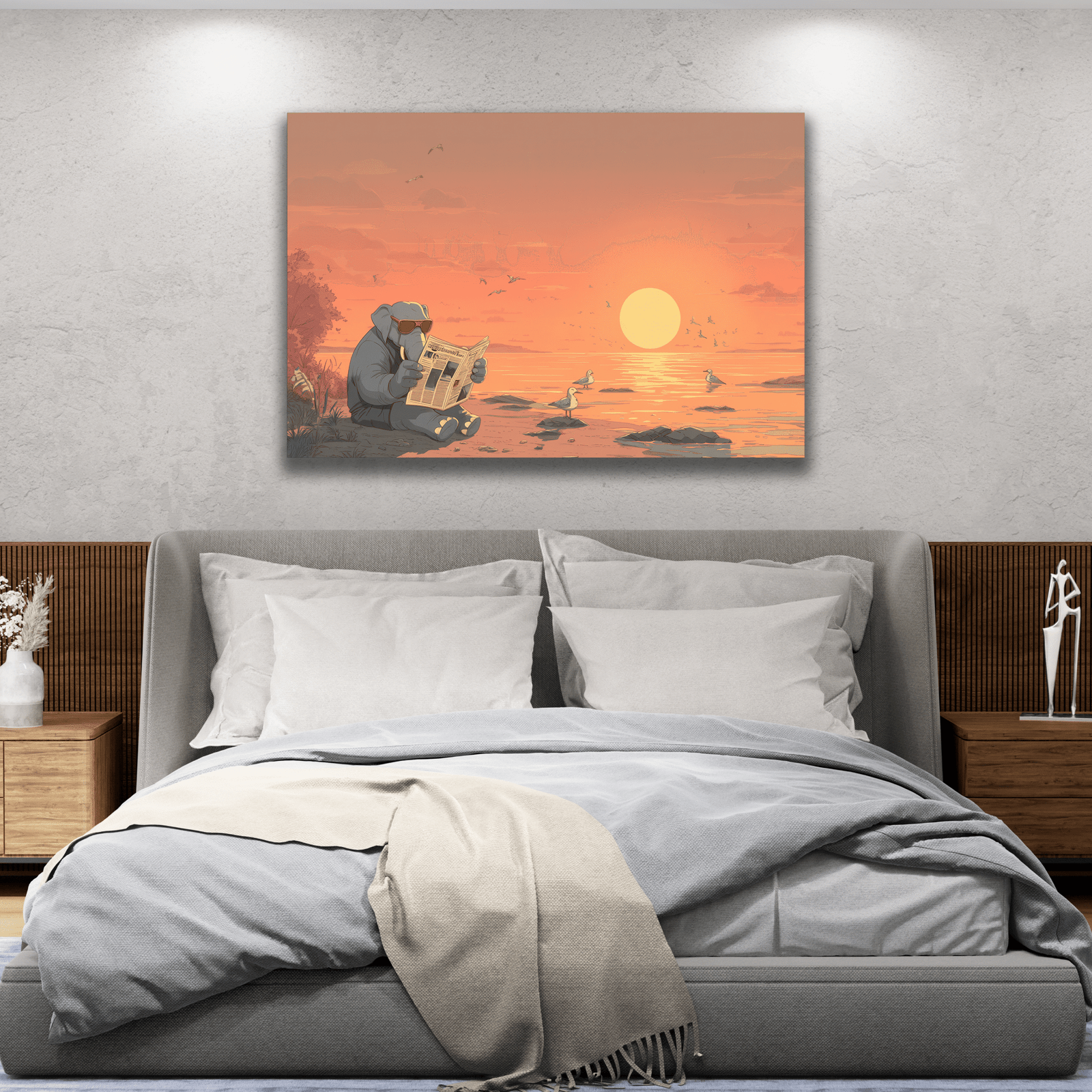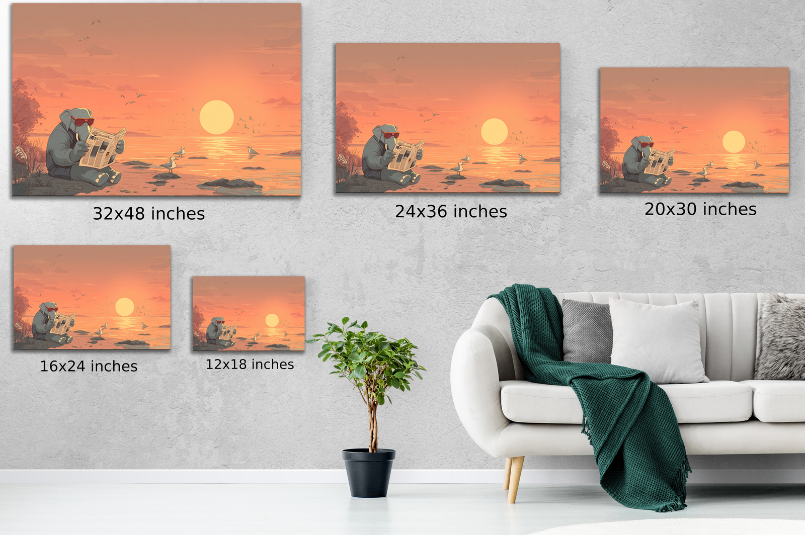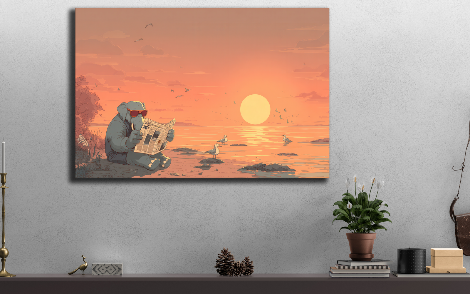 Funny Elephant Poster, Elephant Reading Newspaper on Beach at Sunset, Cute Animal Wall Art Print, Nursery Living Room Painting Canvas