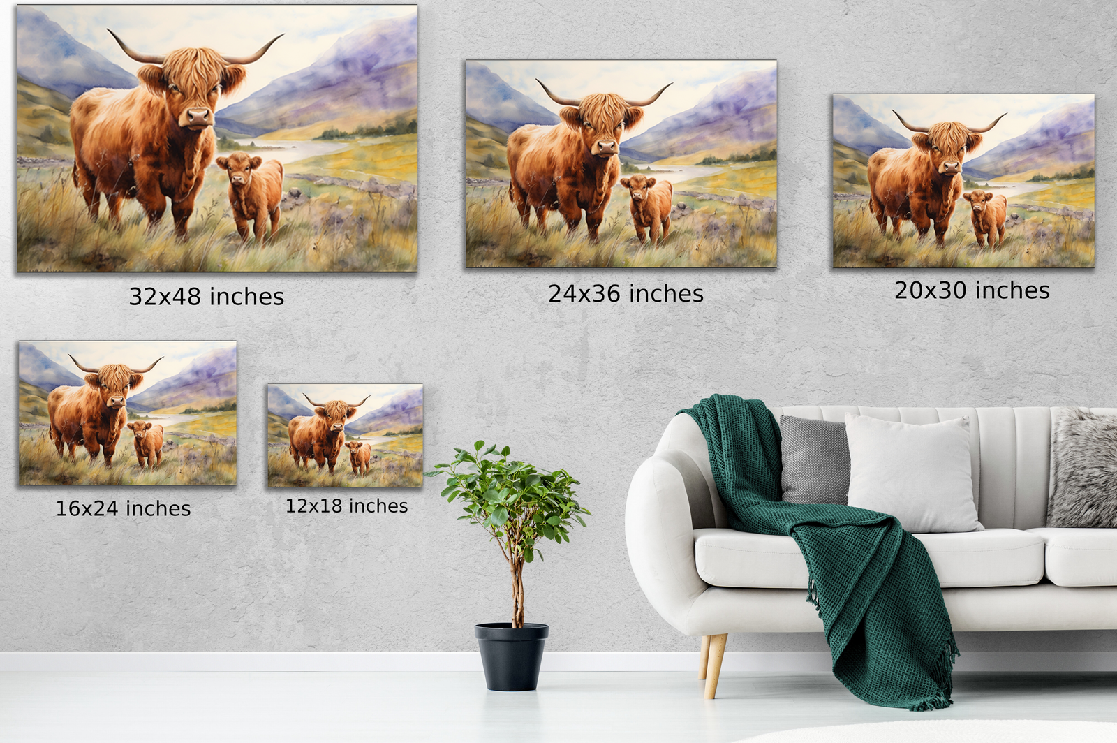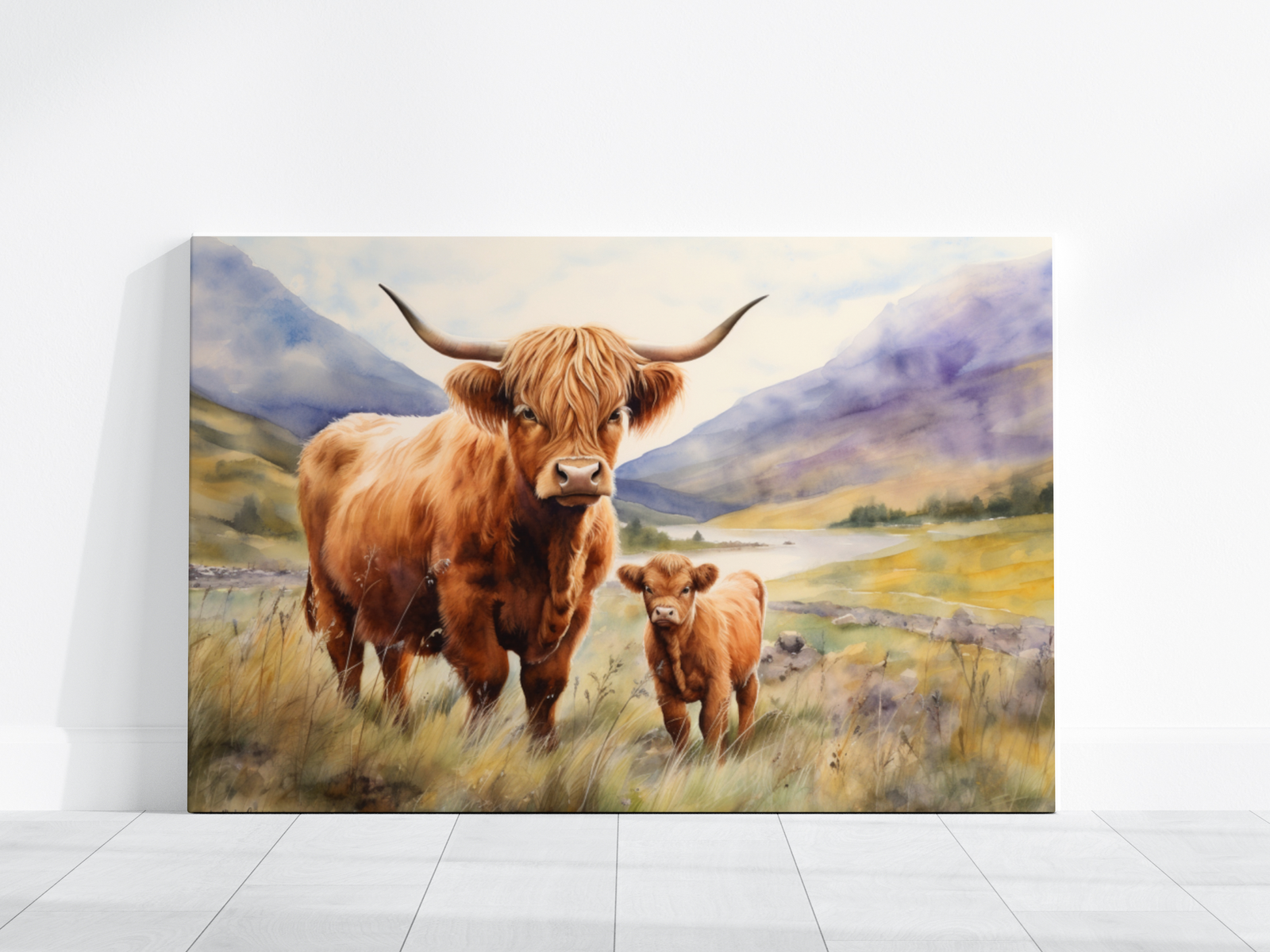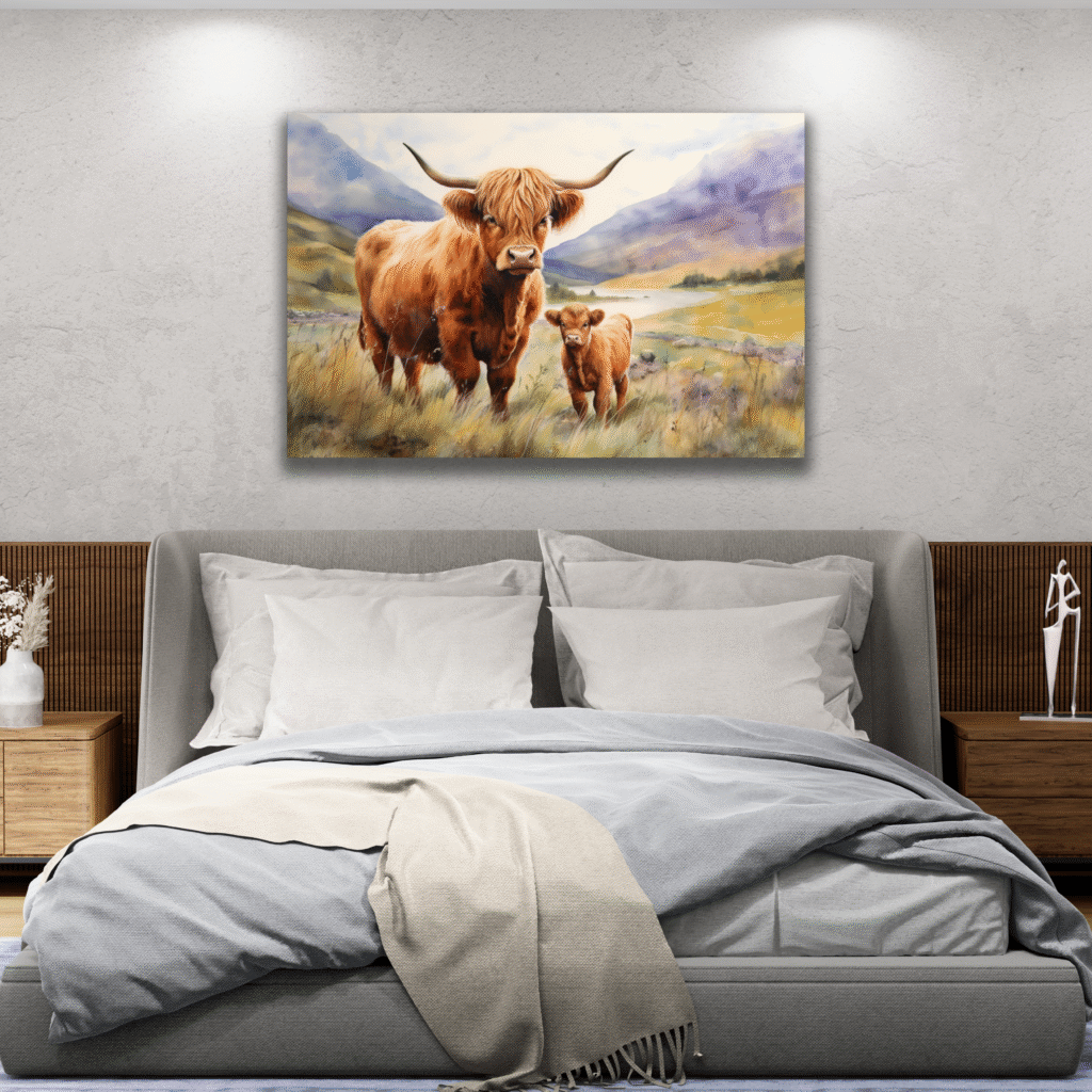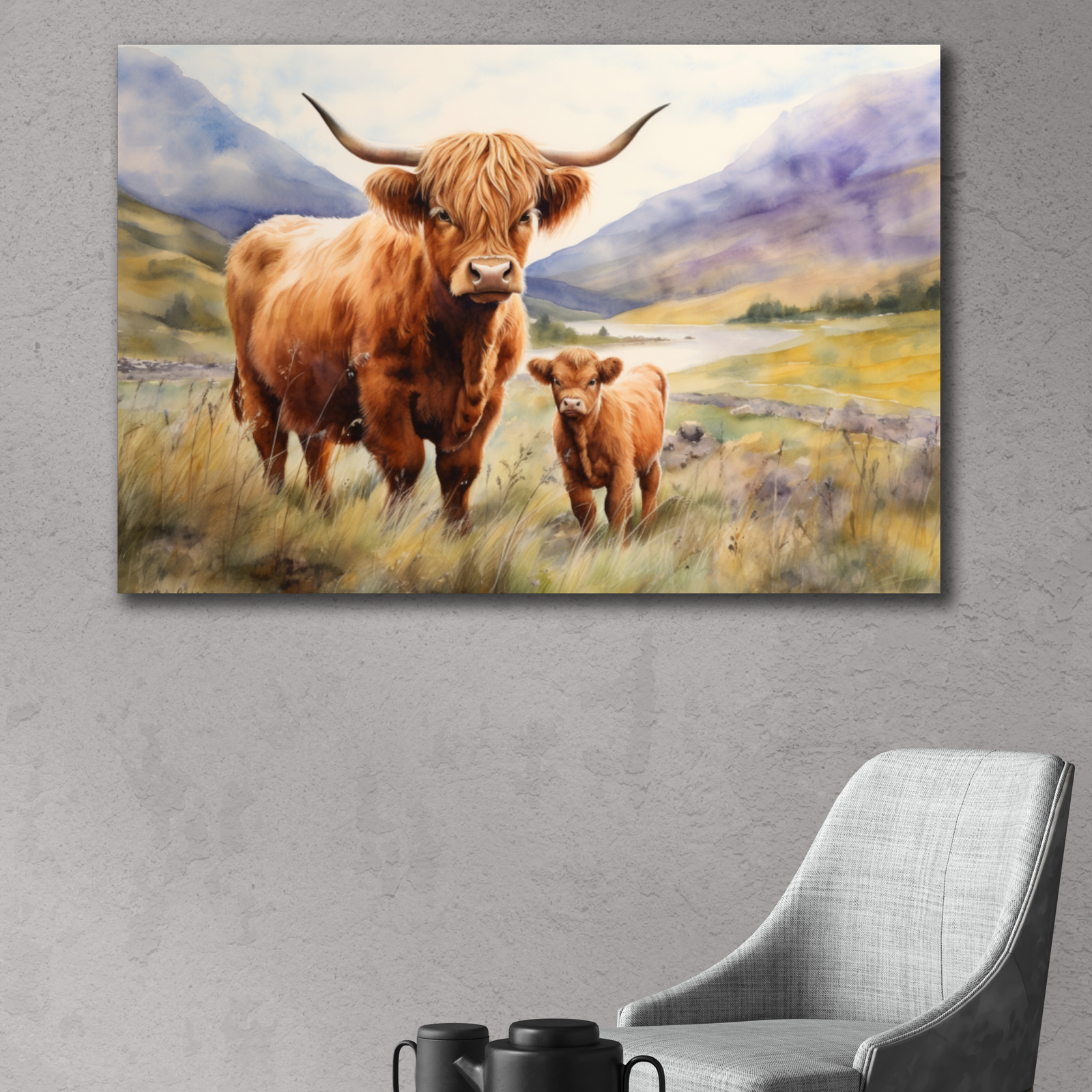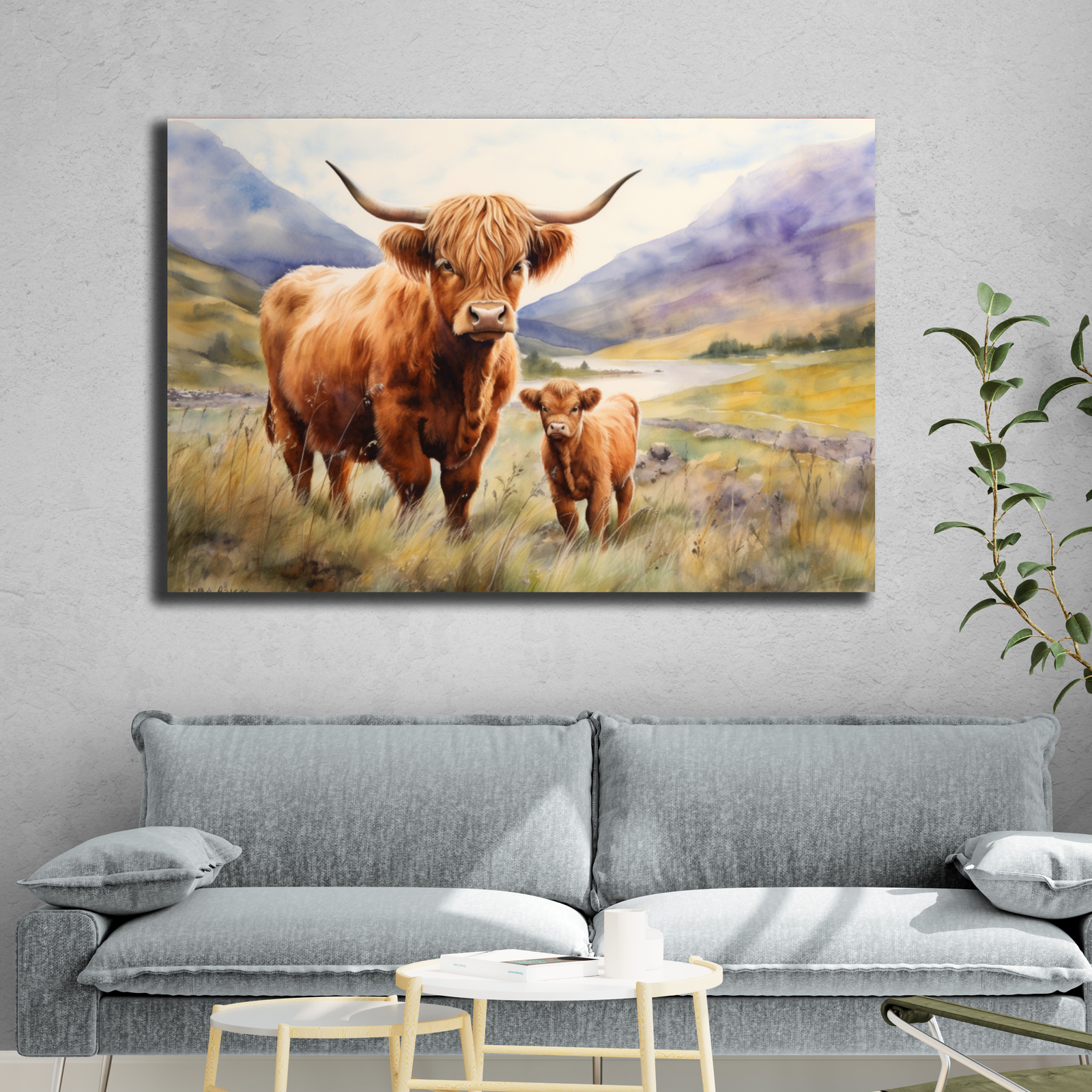 Highland Cow Wall Art | Scottish Highland Cow and Calf Print | Rustic Farmhouse Animal Painting | Country Wall Decor for Living Room & Home