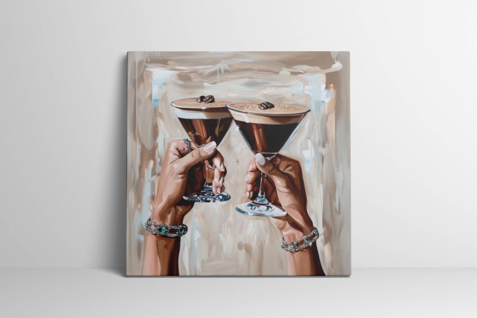 This painting showcases two espresso martinis side by side inviting you to savor their rich colors and tempting froth. Perfect for a bar cart, kitchen, or dining room decor!
