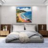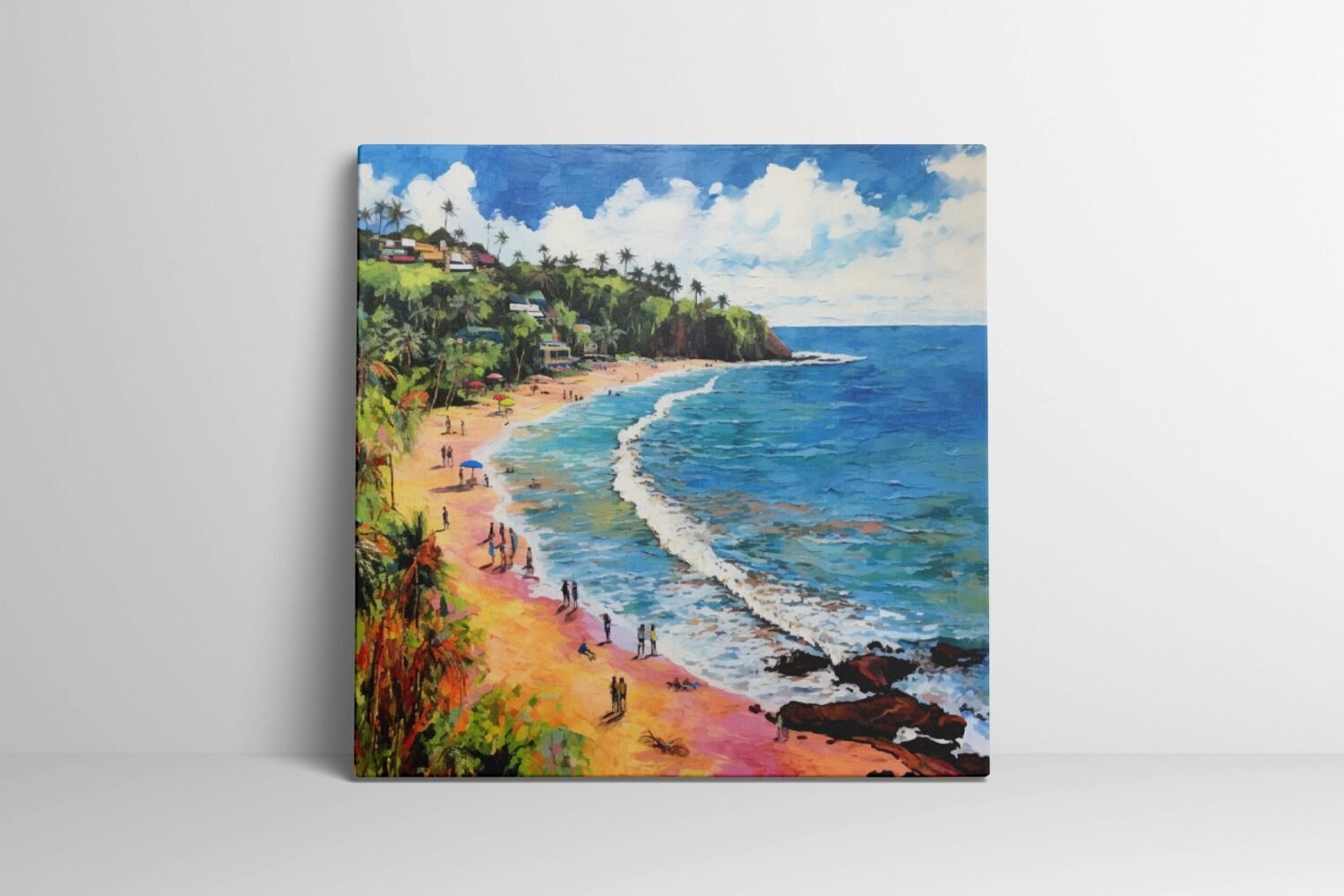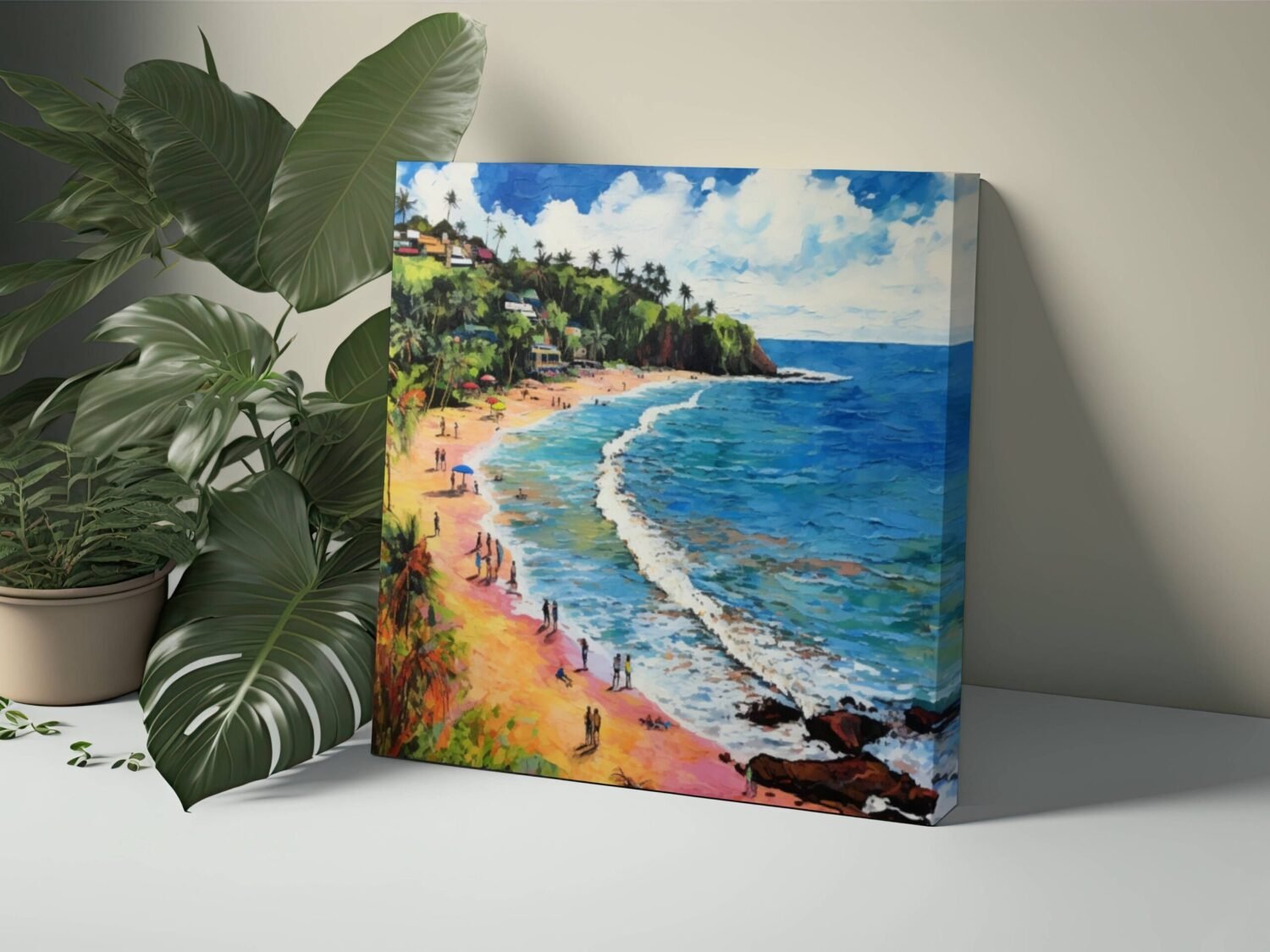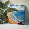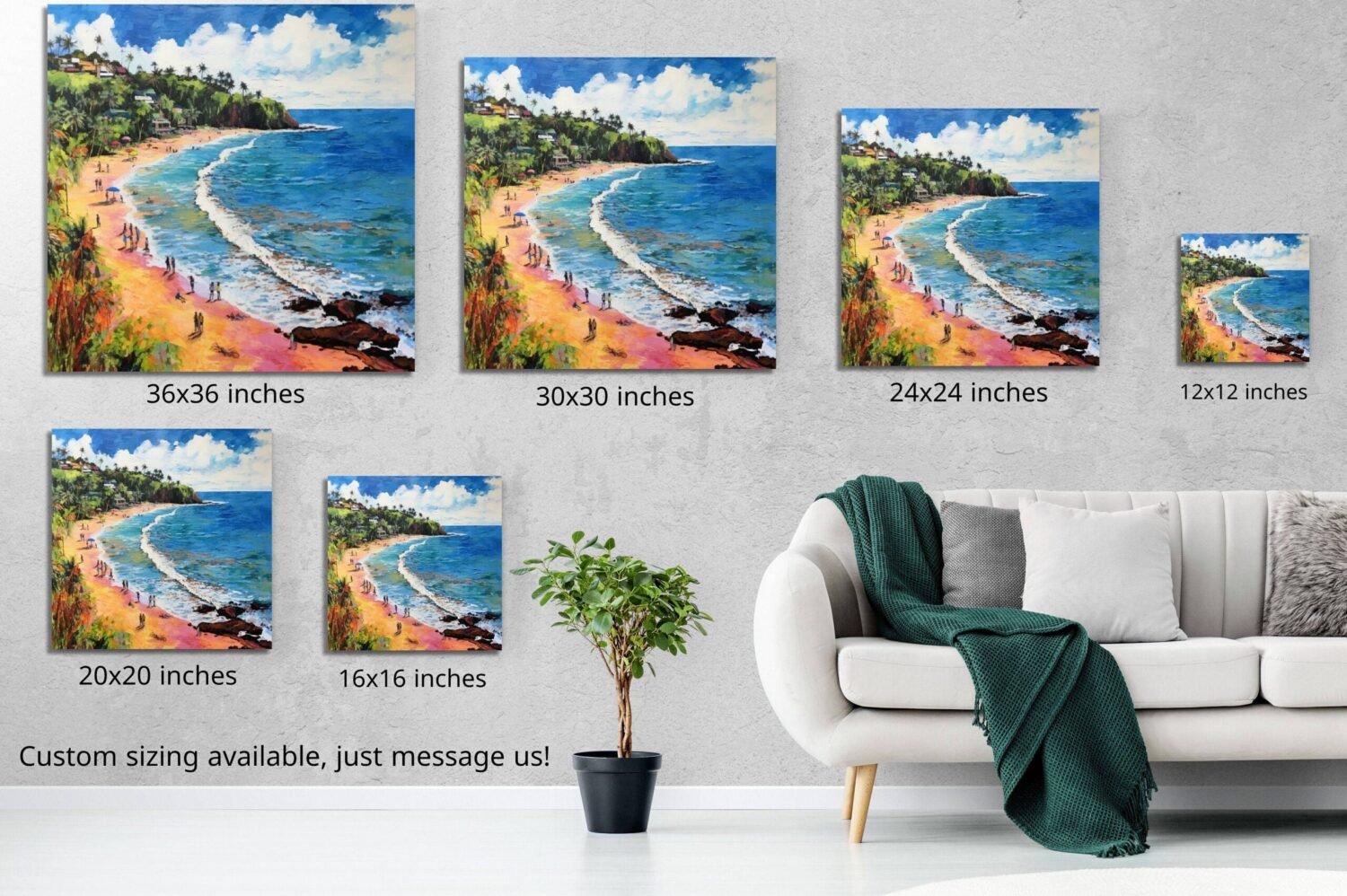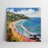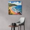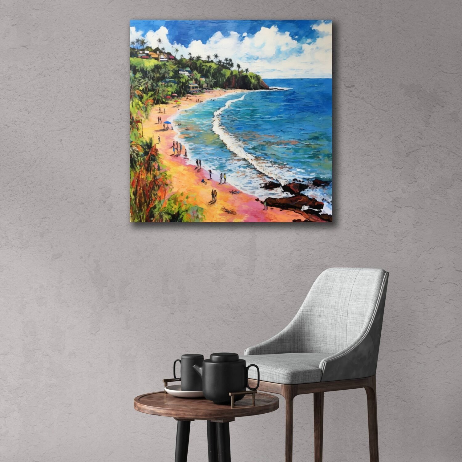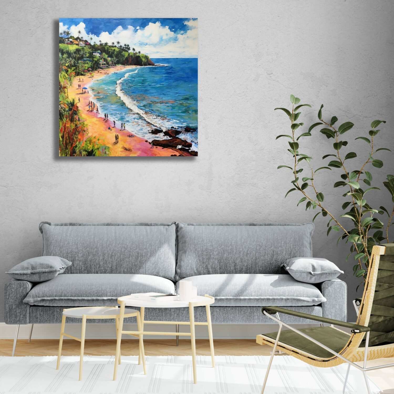 Capture the serene beauty of a coastal paradise with this stunning aerial painting. A panoramic view of a sun-kissed beach, adorned with people strolling along the shore, while lush trees and vibrant nature paint a picturesque backdrop. A perfect piece to bring the tranquility and warmth of the seaside into any space.