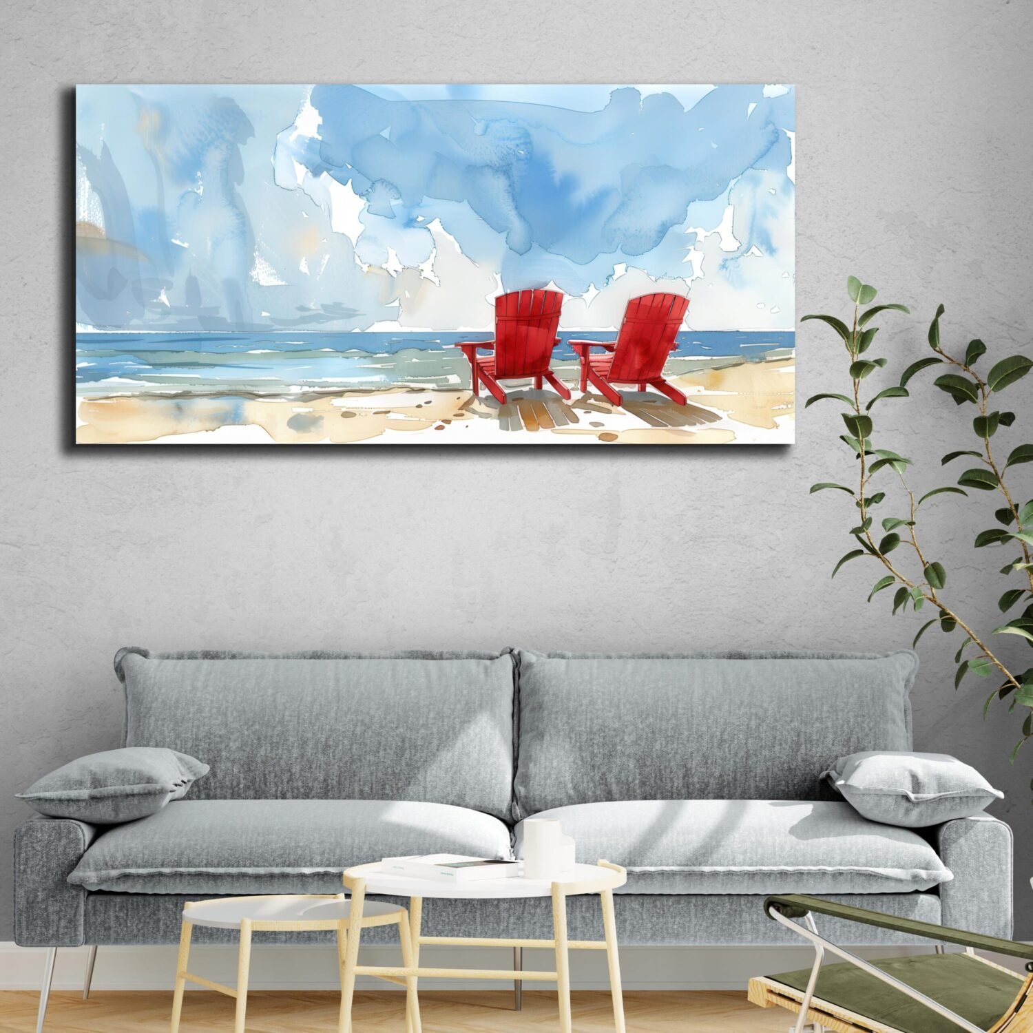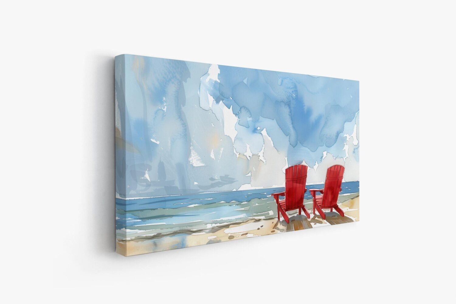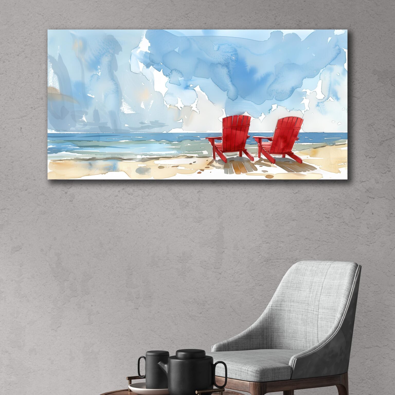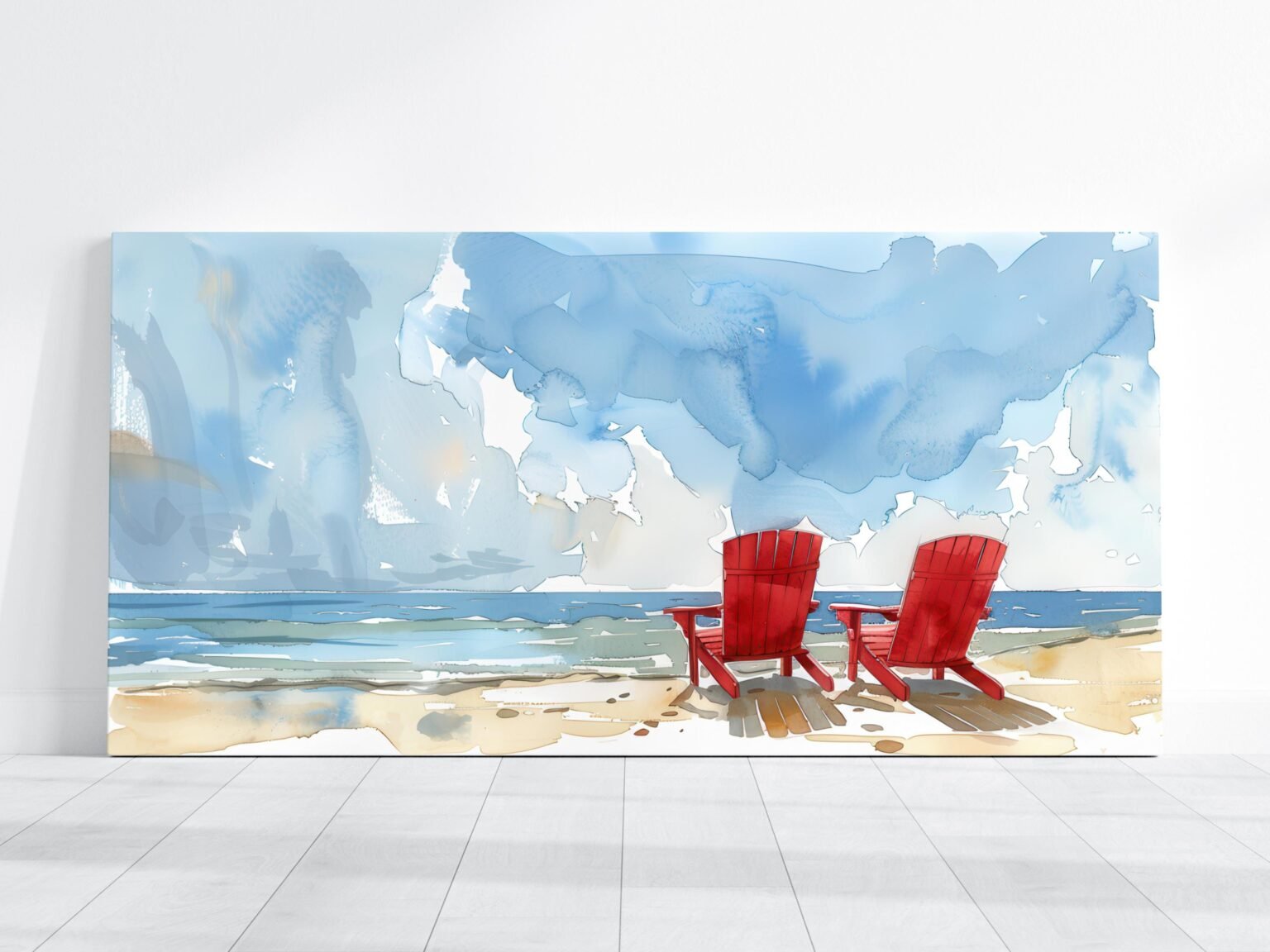 Escape to the shore with this stunning watercolor of two red adirondack chairs overlooking a peaceful beach. The soft, airy brushstrokes capture the serenity of ocean waves and a breezy sky, making it the perfect coastal-inspired decor for any space.