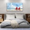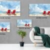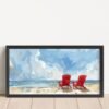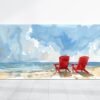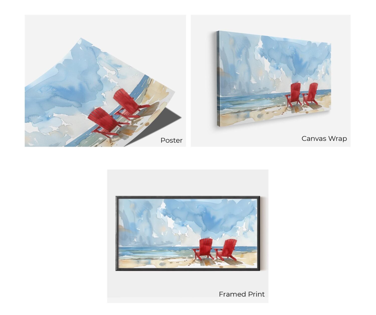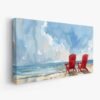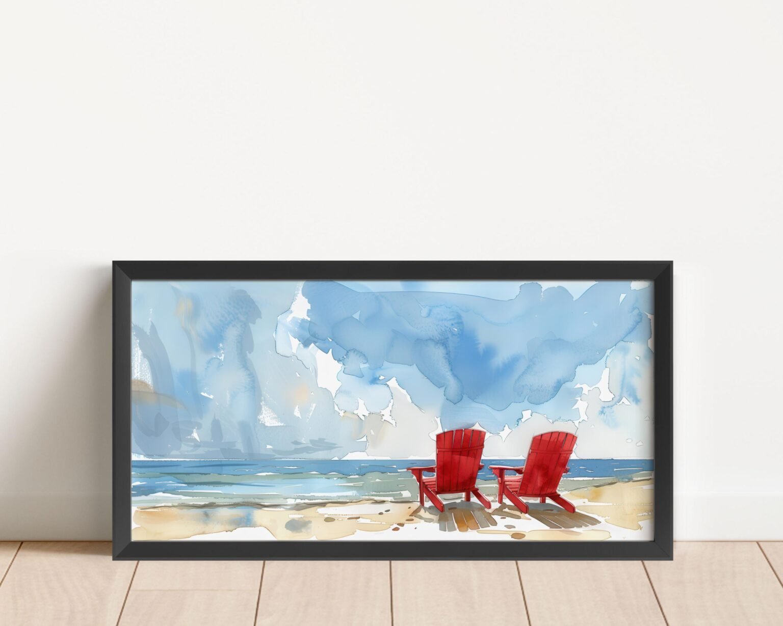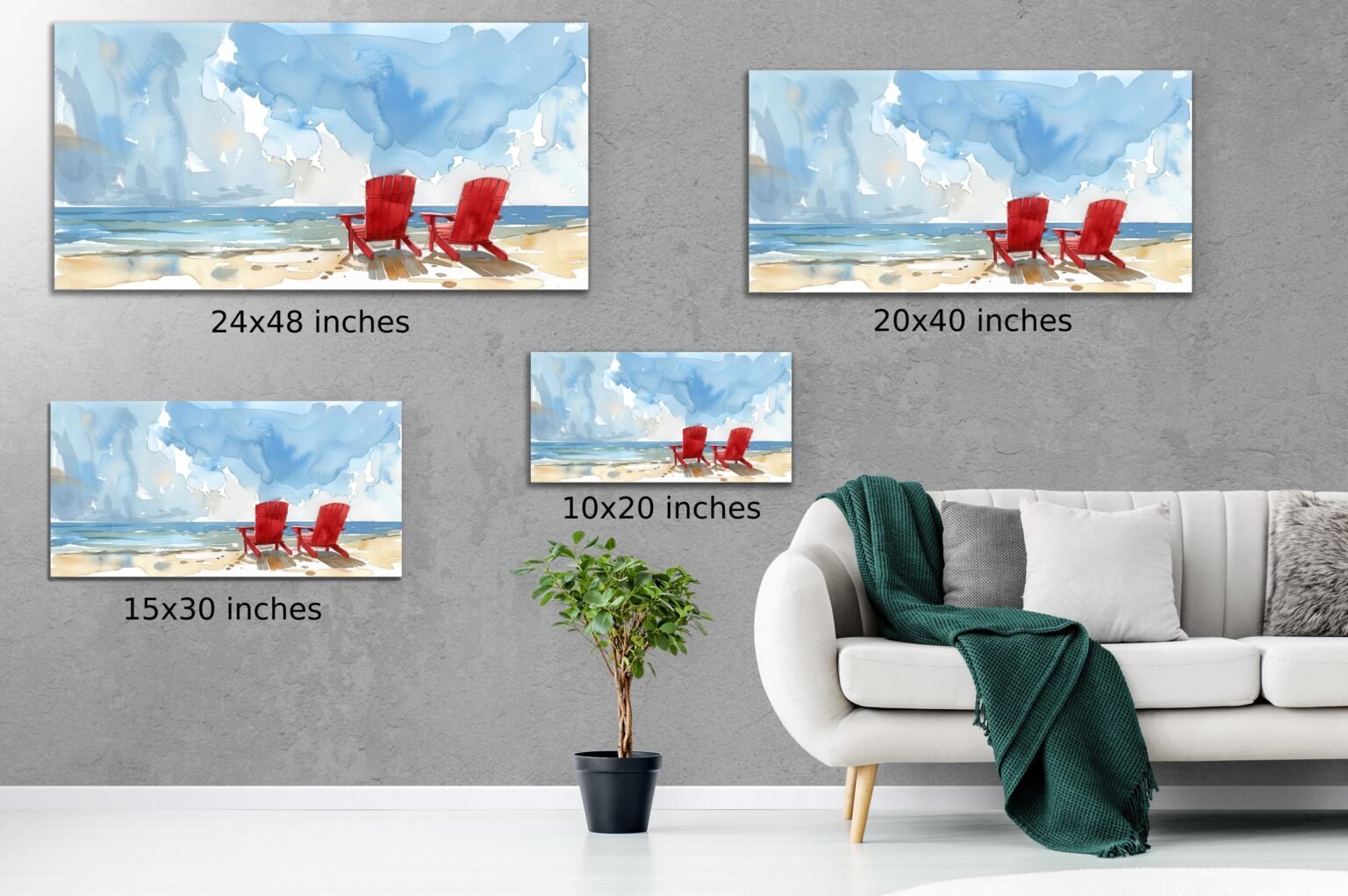 Escape to the shore with this stunning watercolor of two red adirondack chairs overlooking a peaceful beach. The soft, airy brushstrokes capture the serenity of ocean waves and a breezy sky, making it the perfect coastal-inspired decor for any space.