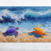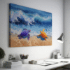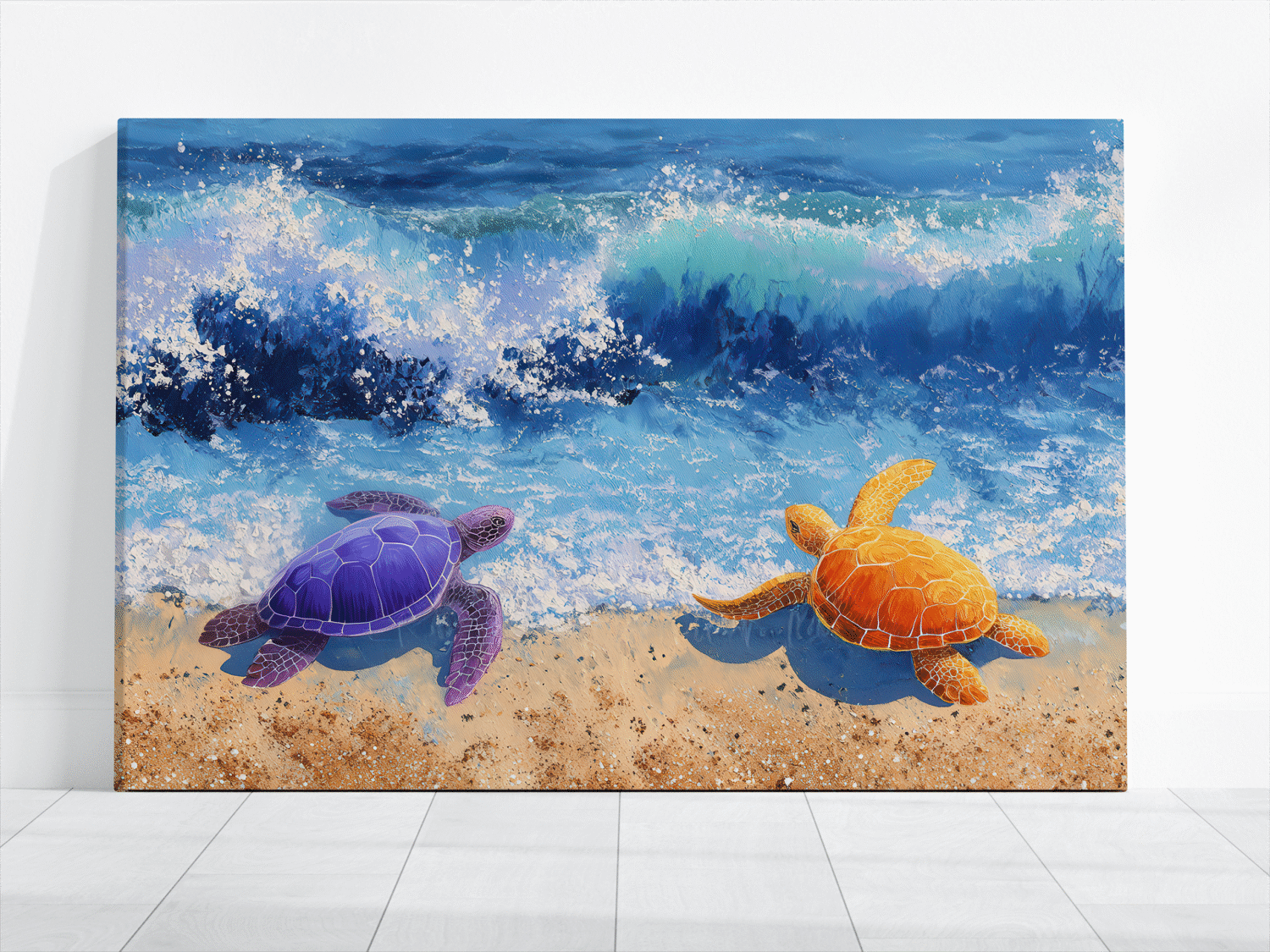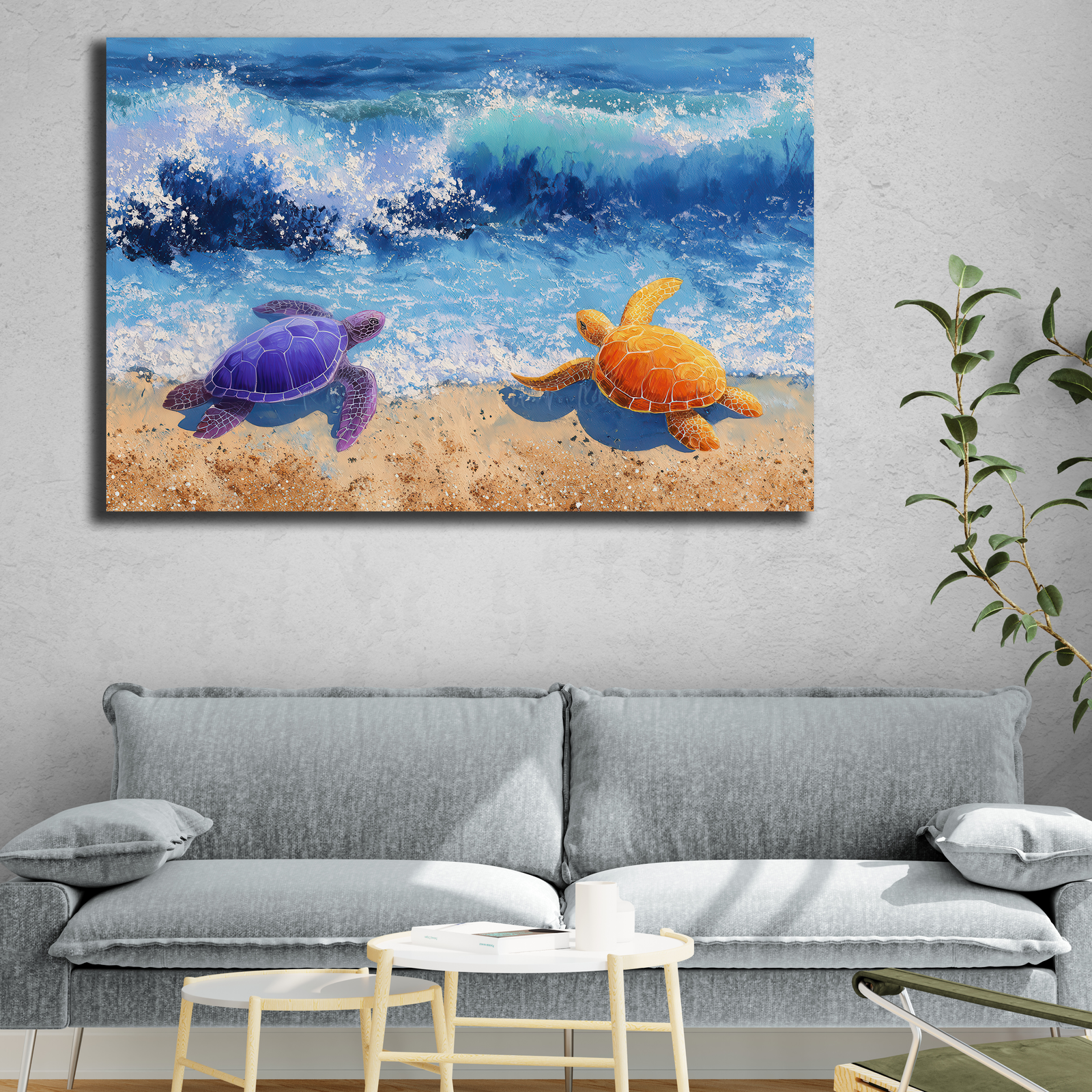 A stunning and cheerful ocean scene featuring a purple and orange sea turtle resting near crashing waves on a sandy beach. This vibrant and textured painting captures the playfulness of marine life and the tranquility of the sea. A perfect addition to any beach-themed space or ocean lover’s collection!