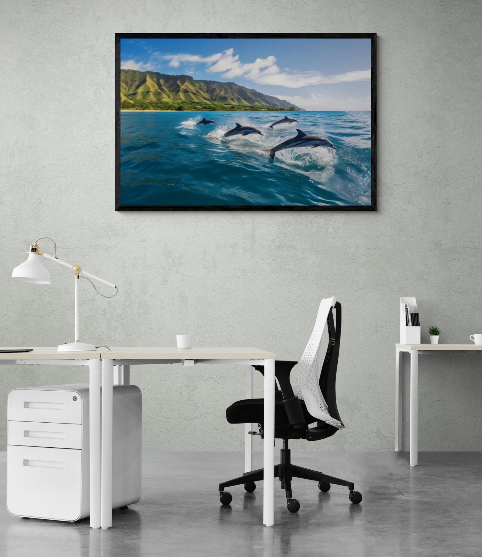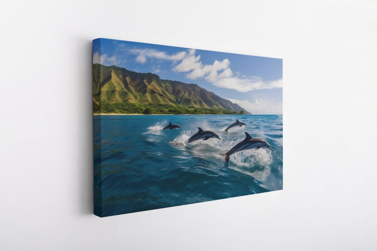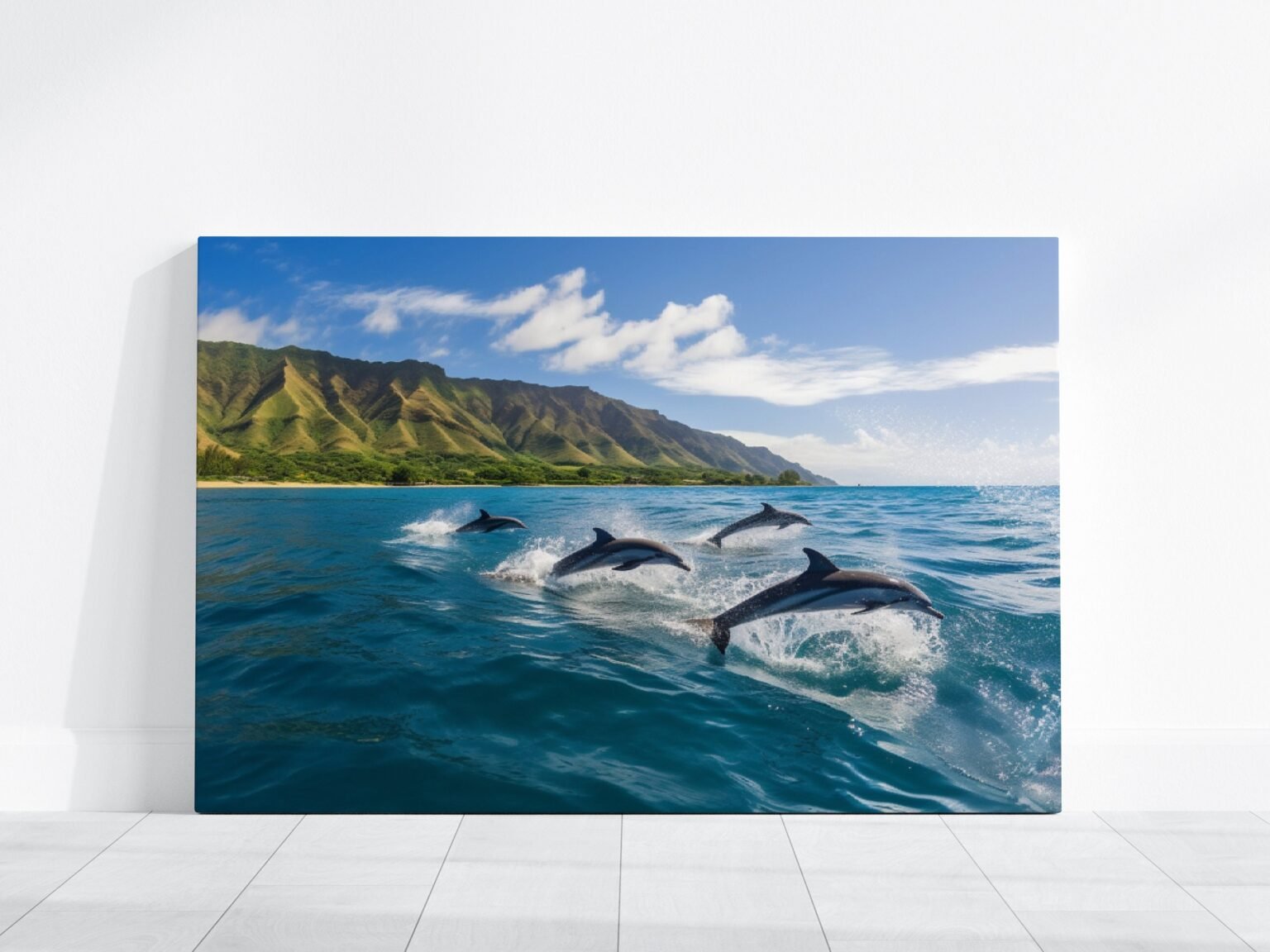 In the breathtaking Hawaiian seascape, multiple dolphins joyously leap out of the glistening turquoise water, their sleek bodies soaring gracefully against the backdrop of majestic volcanic islands and lush, verdant landscapes. Their playful dance creates a symphony of splashes amidst the stunning natural beauty of Hawaii, evoking a sense of awe and wonderment at the harmonious connection between these intelligent creatures and the picturesque environment they call home.