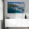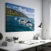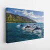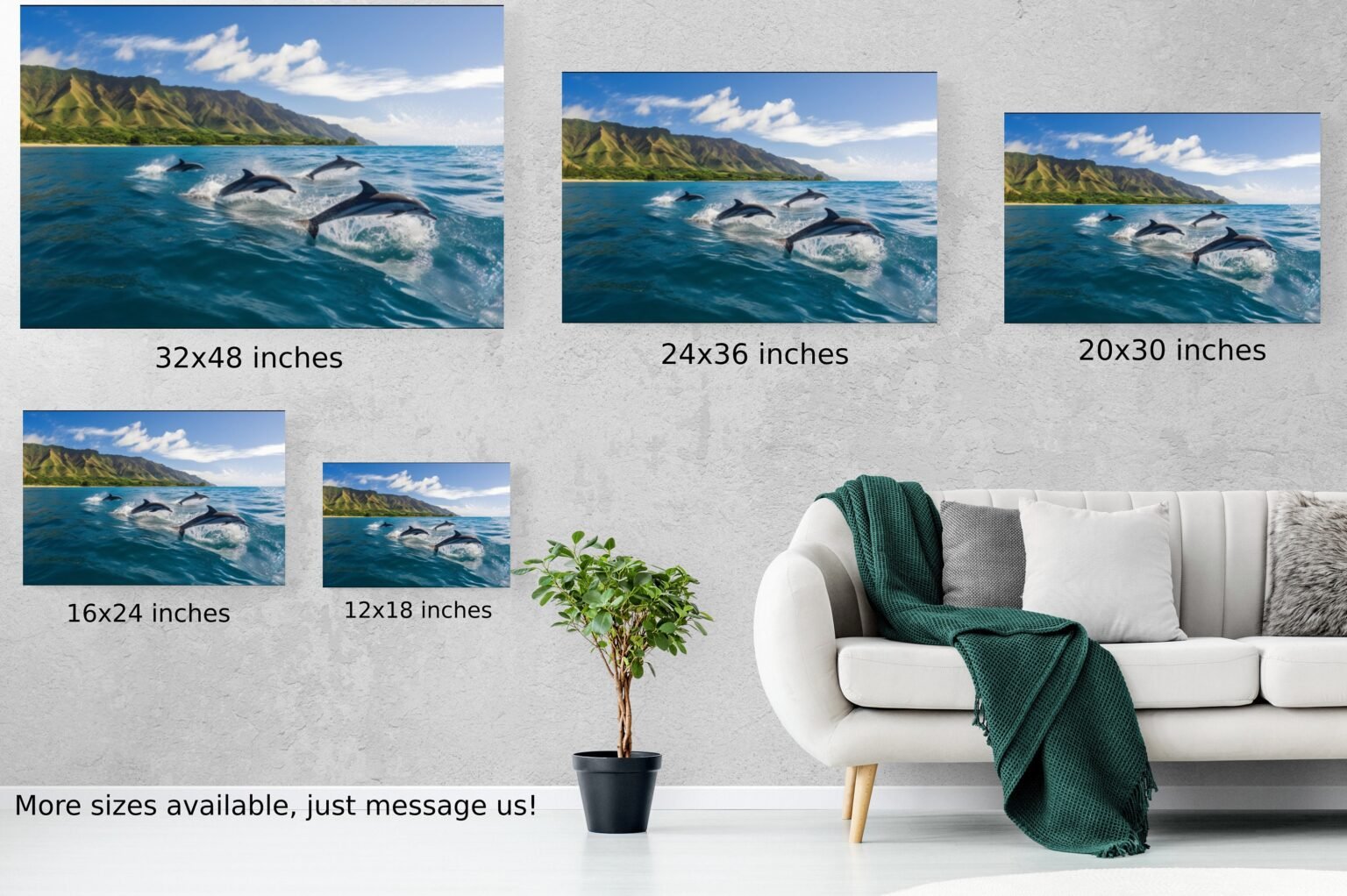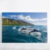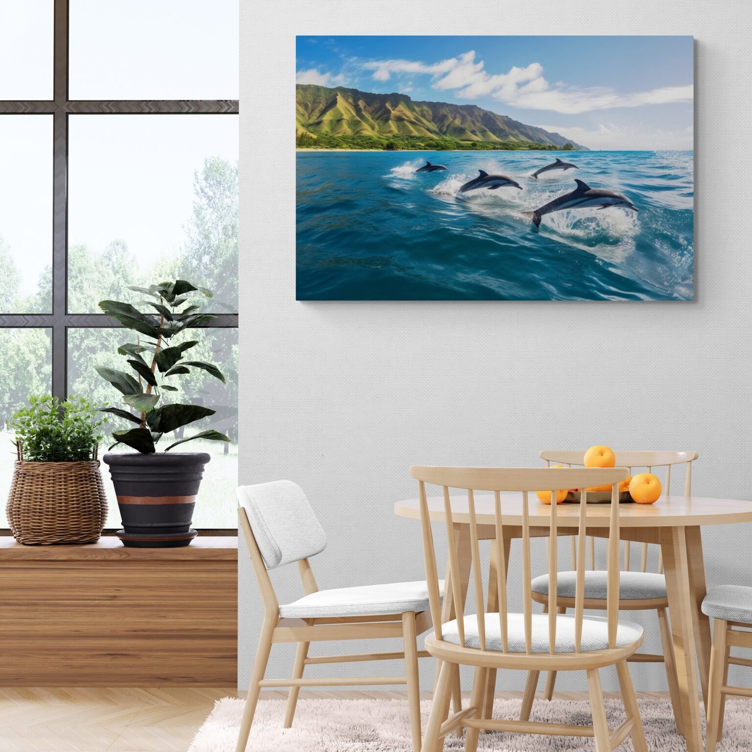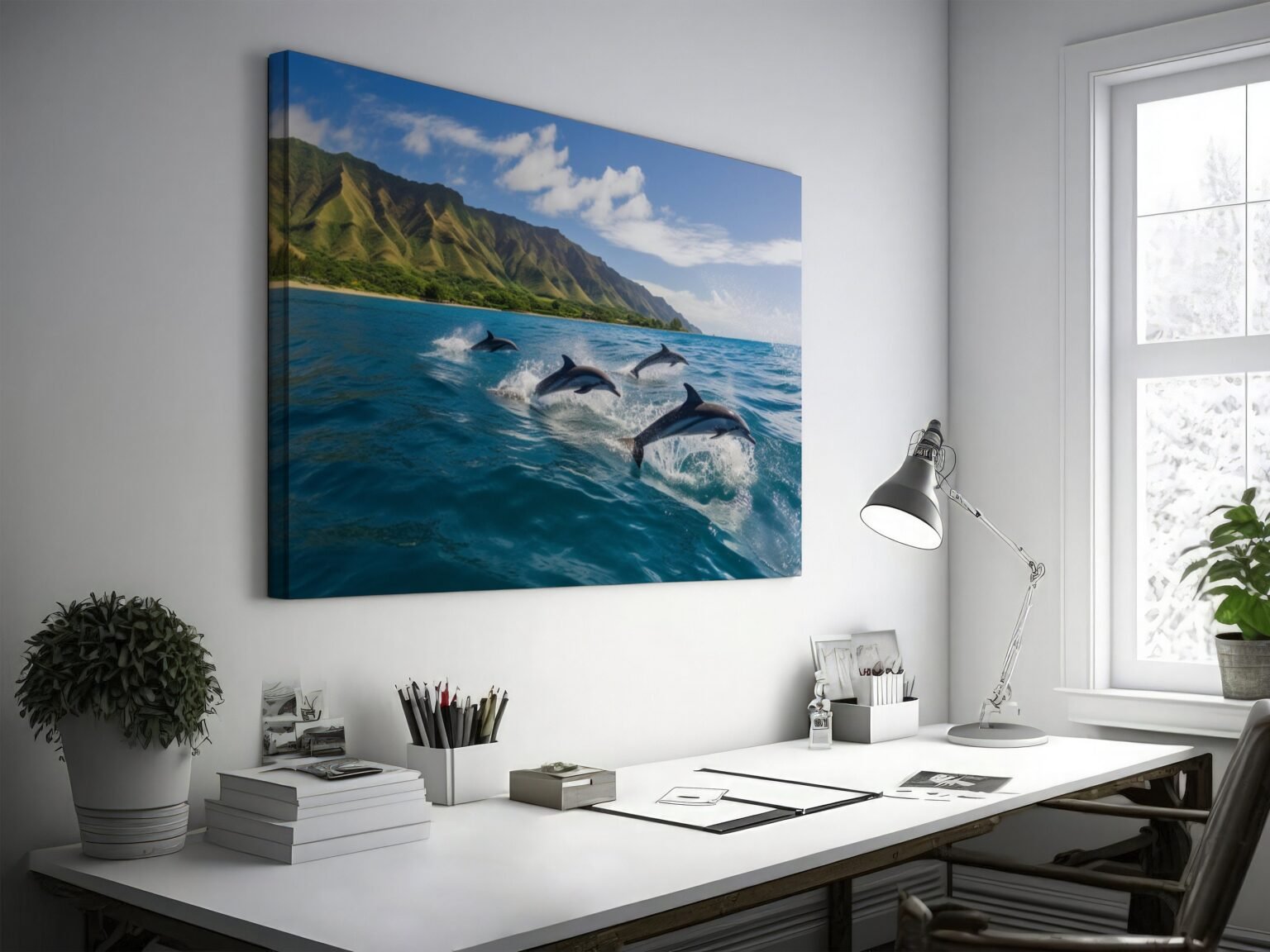 In the breathtaking Hawaiian seascape, multiple dolphins joyously leap out of the glistening turquoise water, their sleek bodies soaring gracefully against the backdrop of majestic volcanic islands and lush, verdant landscapes. Their playful dance creates a symphony of splashes amidst the stunning natural beauty of Hawaii, evoking a sense of awe and wonderment at the harmonious connection between these intelligent creatures and the picturesque environment they call home.