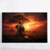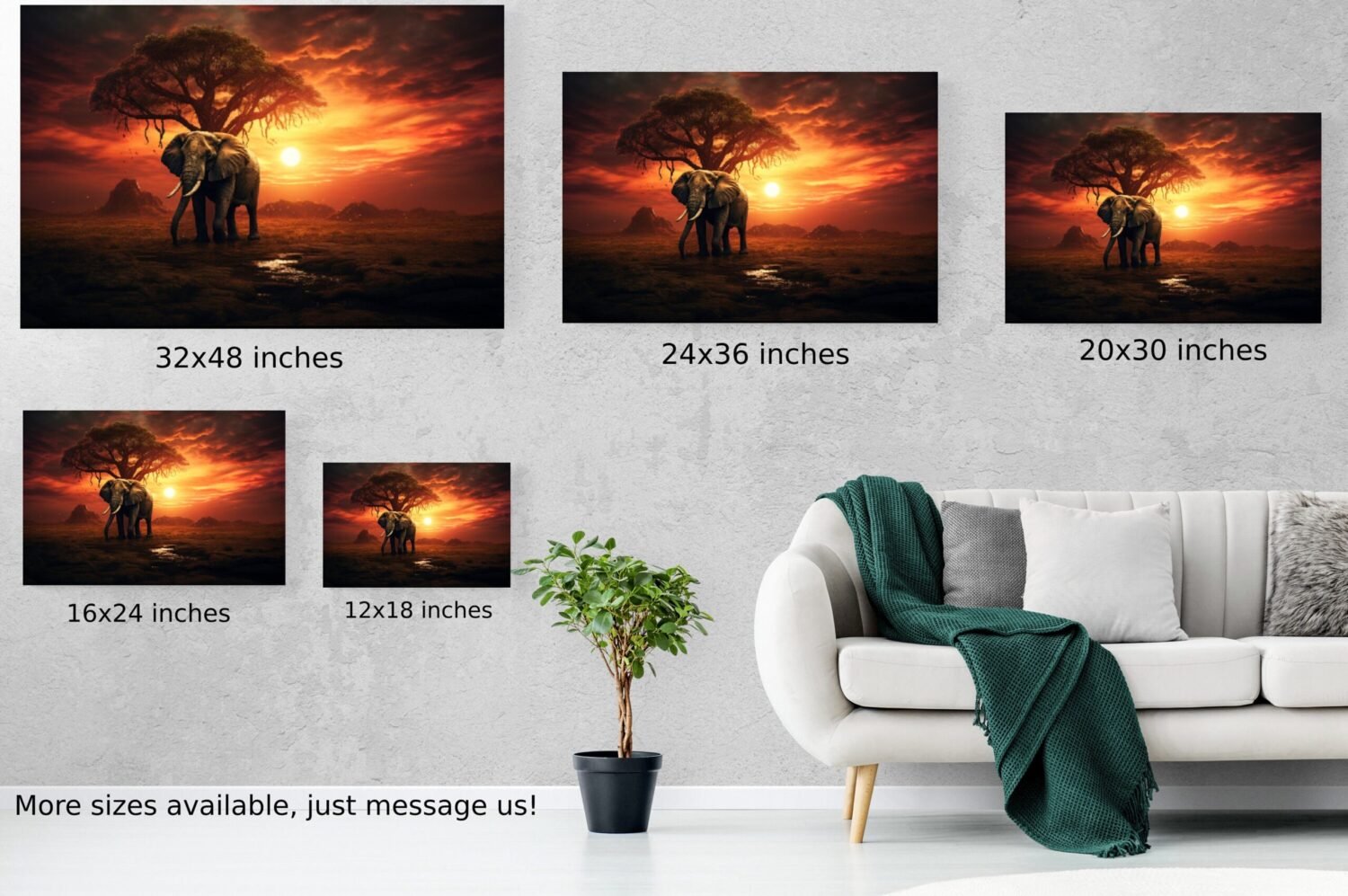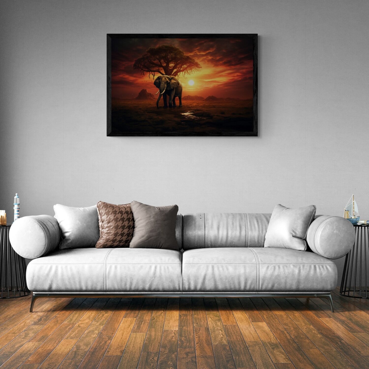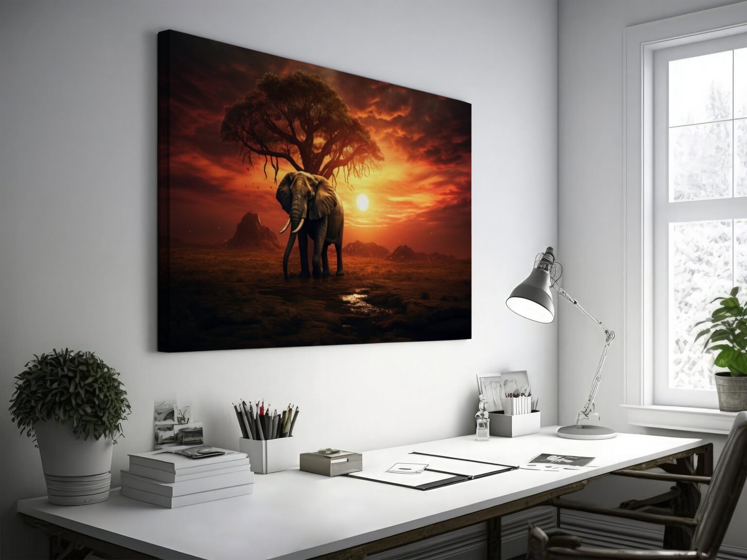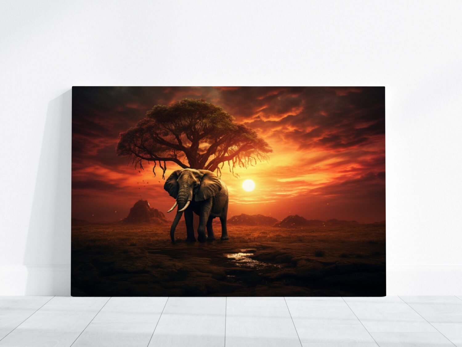 In the golden hues of a setting sun, a magnificent elephant stands tall and regal in the heart of a vast safari landscape. Its massive form casts an impressive silhouette against the horizon, while the gentle glow of dusk bathes the surroundings in a warm embrace. Behind the majestic creature, a grand and ancient tree stretches its branches towards the darkening sky, providing a serene backdrop to this awe-inspiring scene.
