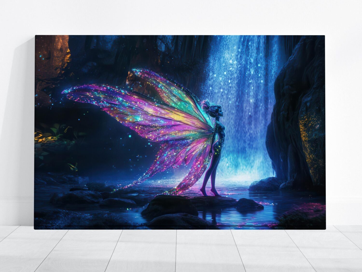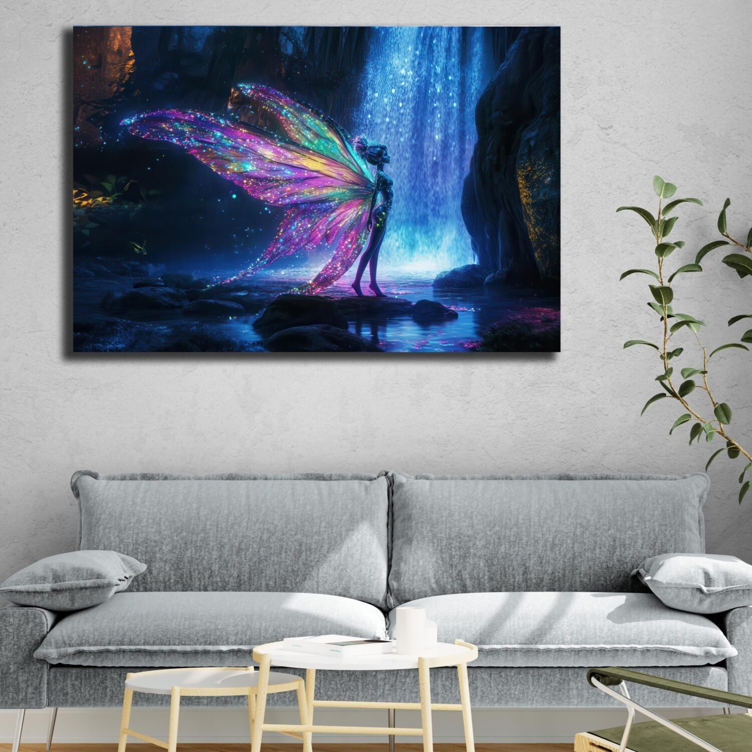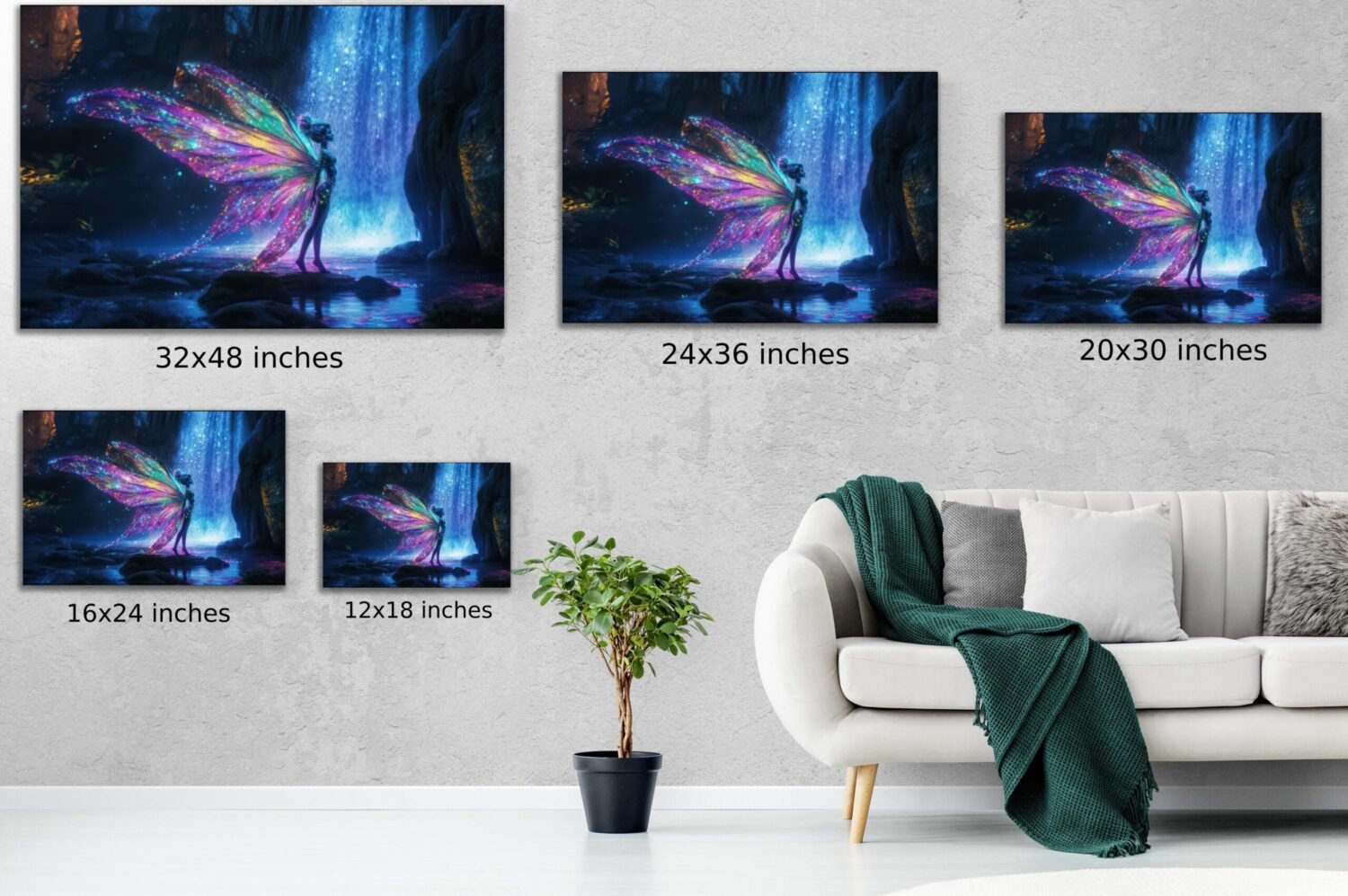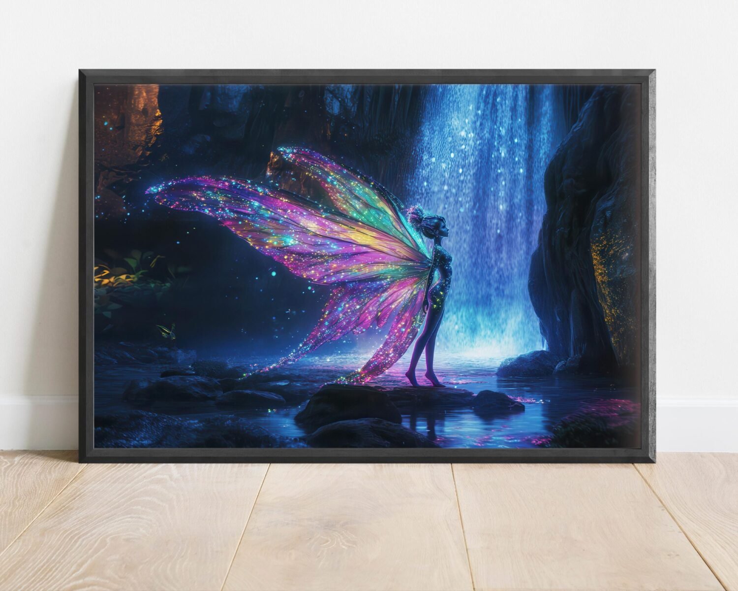 Enchant your space with this delicate fairy with large, colorful wings shimmering in vibrant hues. The fairy gracefully stands before a cascading waterfall, surrounded by soft glowing light evoking a sense of magic and serenity. The intricate details in the wings and the gentle flow of the water create a mesmerizing visual experience.