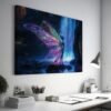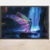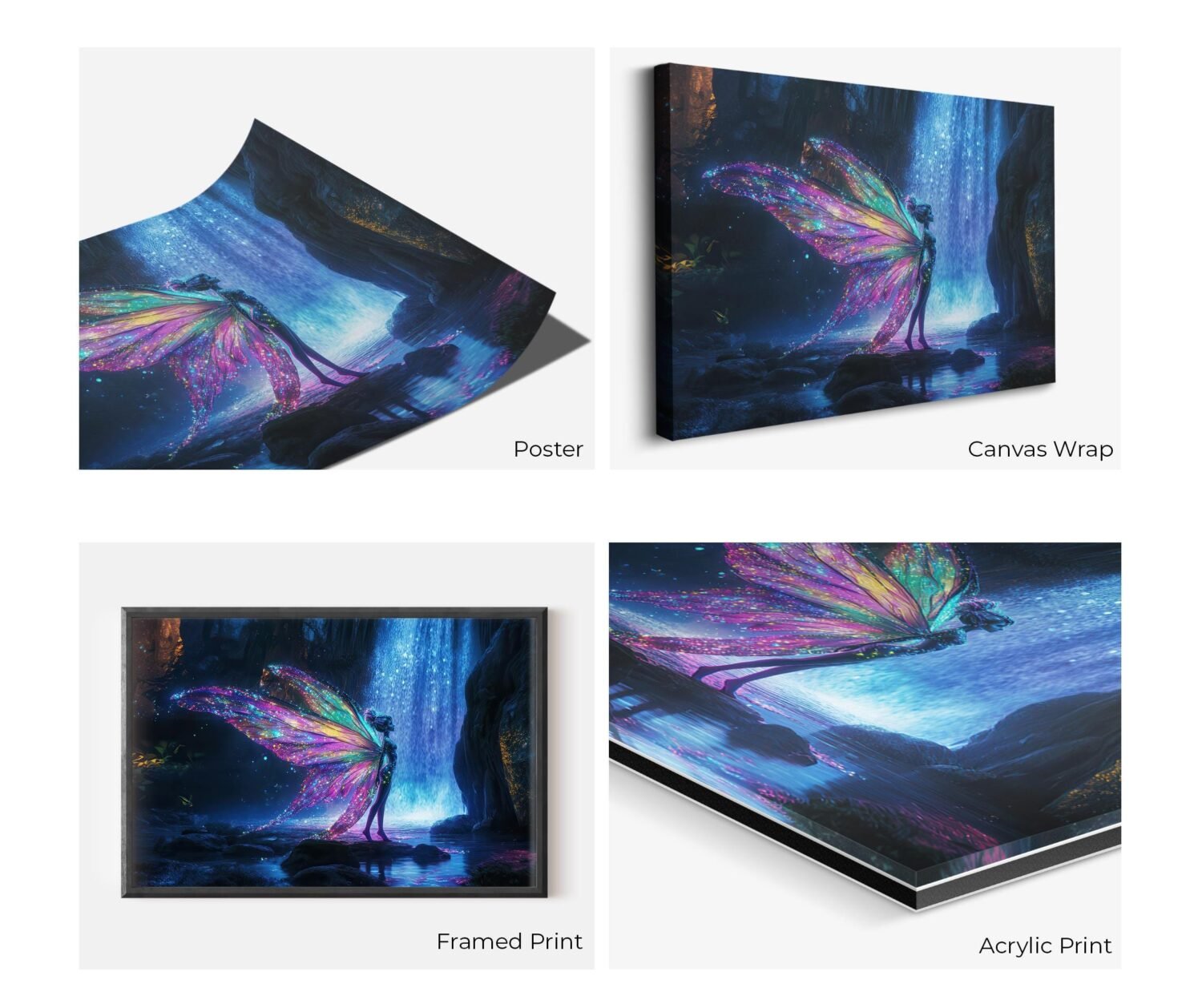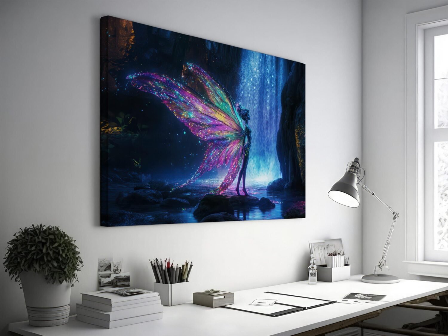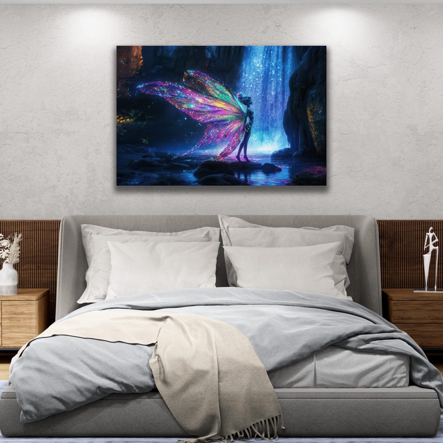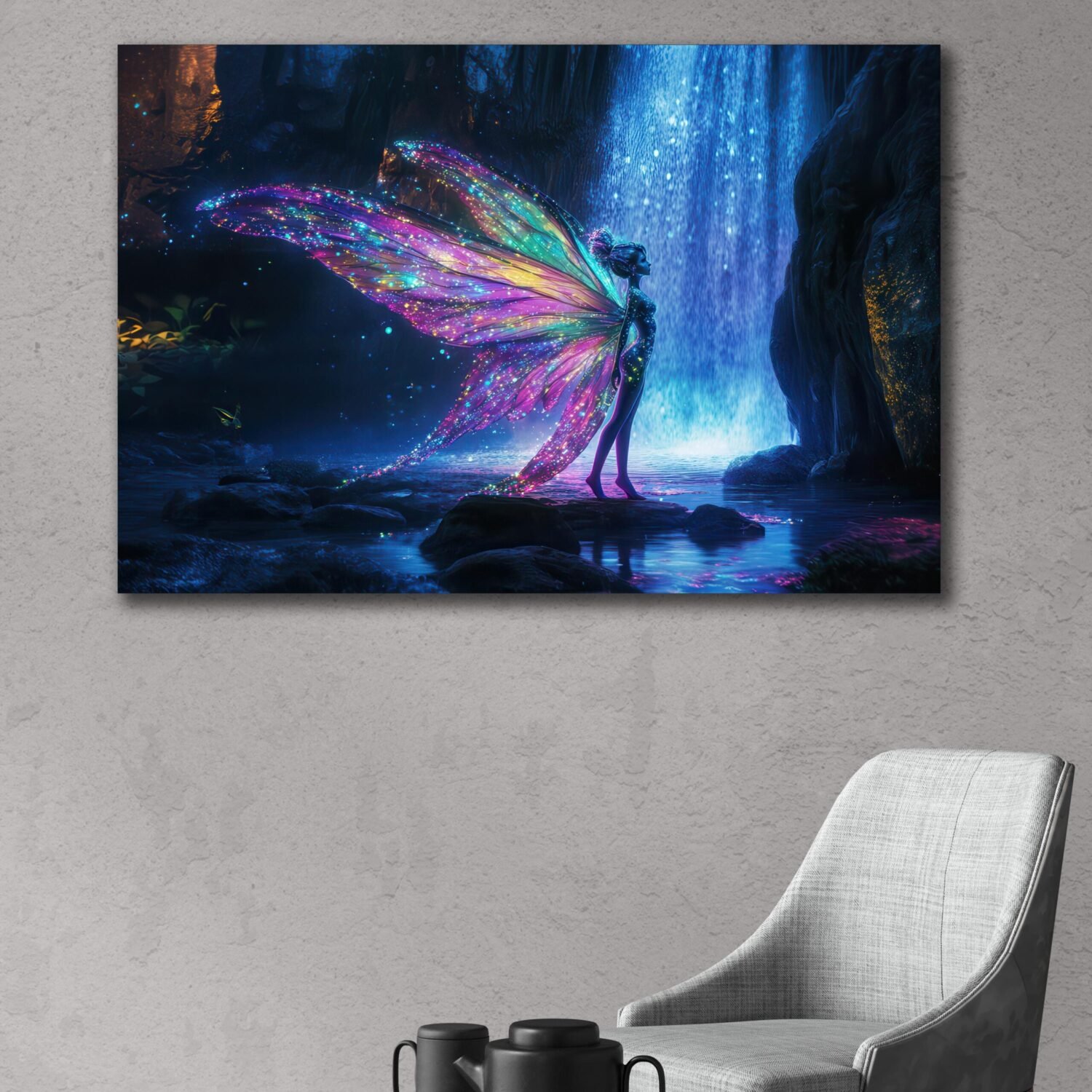 Enchant your space with this delicate fairy with large, colorful wings shimmering in vibrant hues. The fairy gracefully stands before a cascading waterfall, surrounded by soft glowing light evoking a sense of magic and serenity. The intricate details in the wings and the gentle flow of the water create a mesmerizing visual experience.