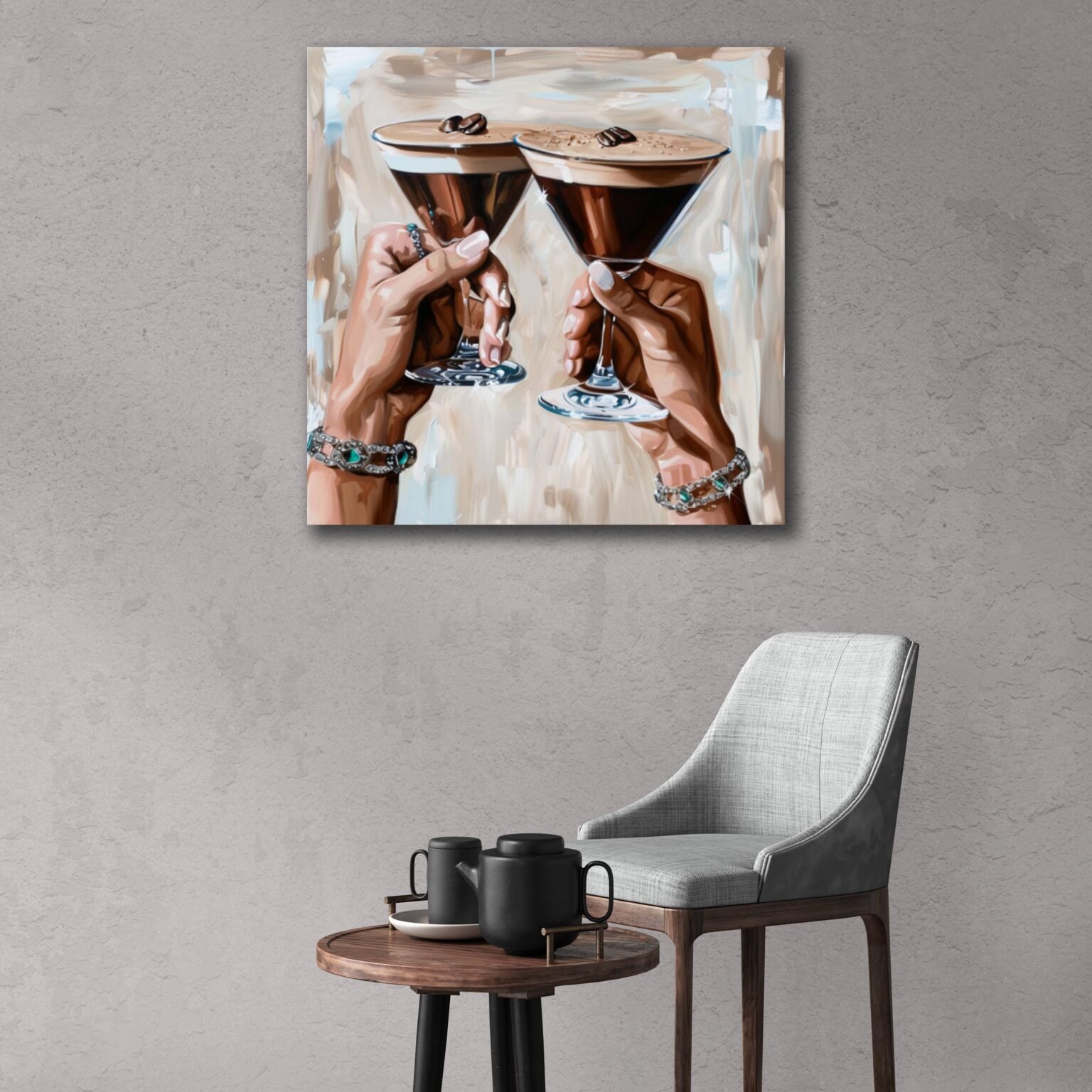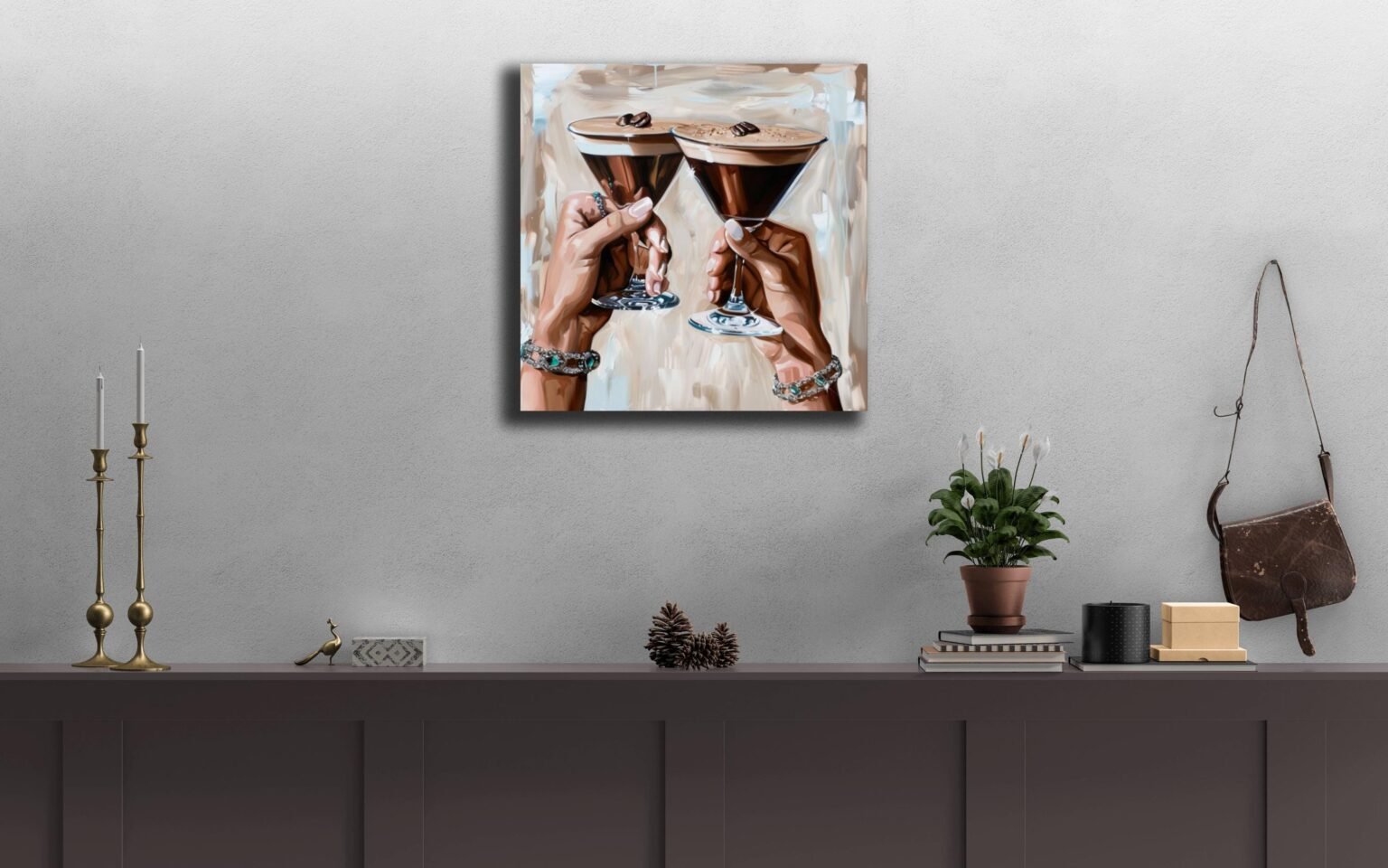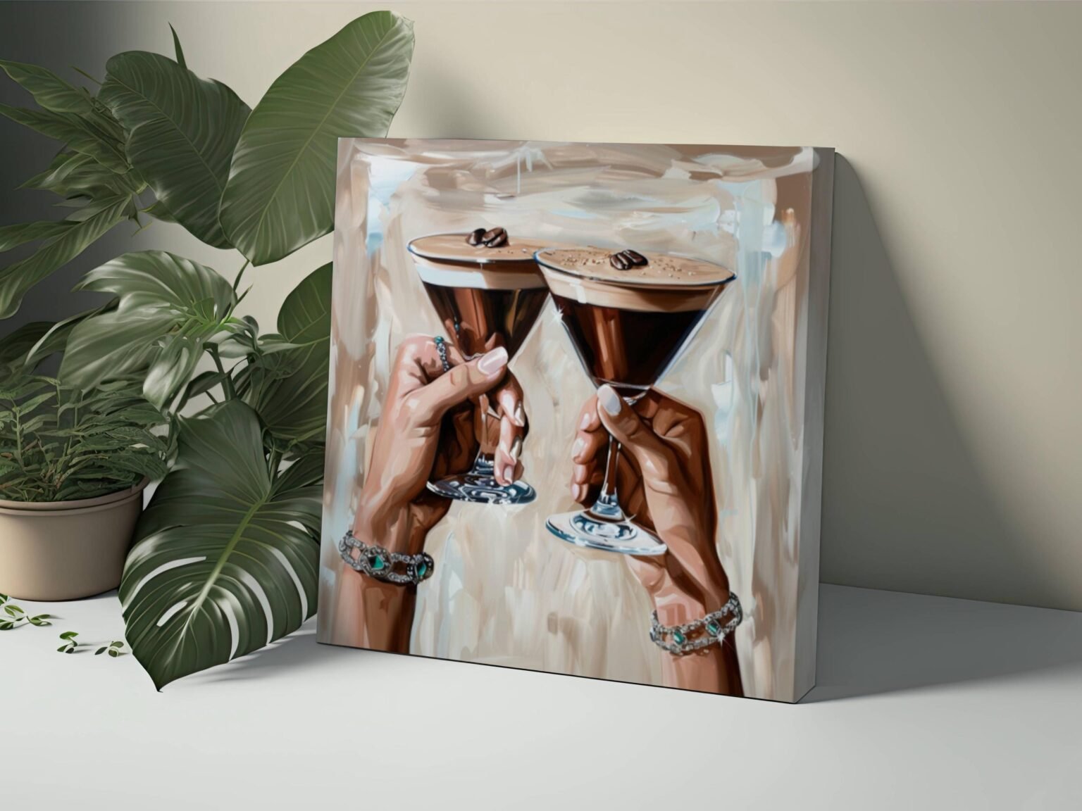 This painting showcases two espresso martinis side by side inviting you to savor their rich colors and tempting froth. Perfect for a bar cart, kitchen, or dining room decor!