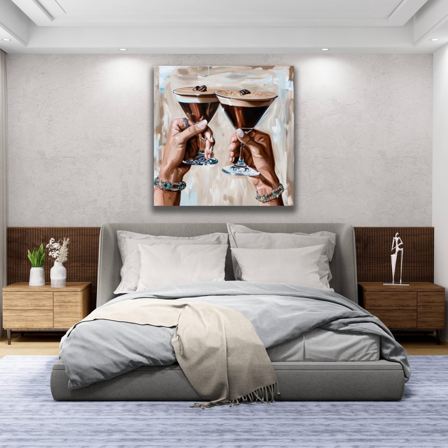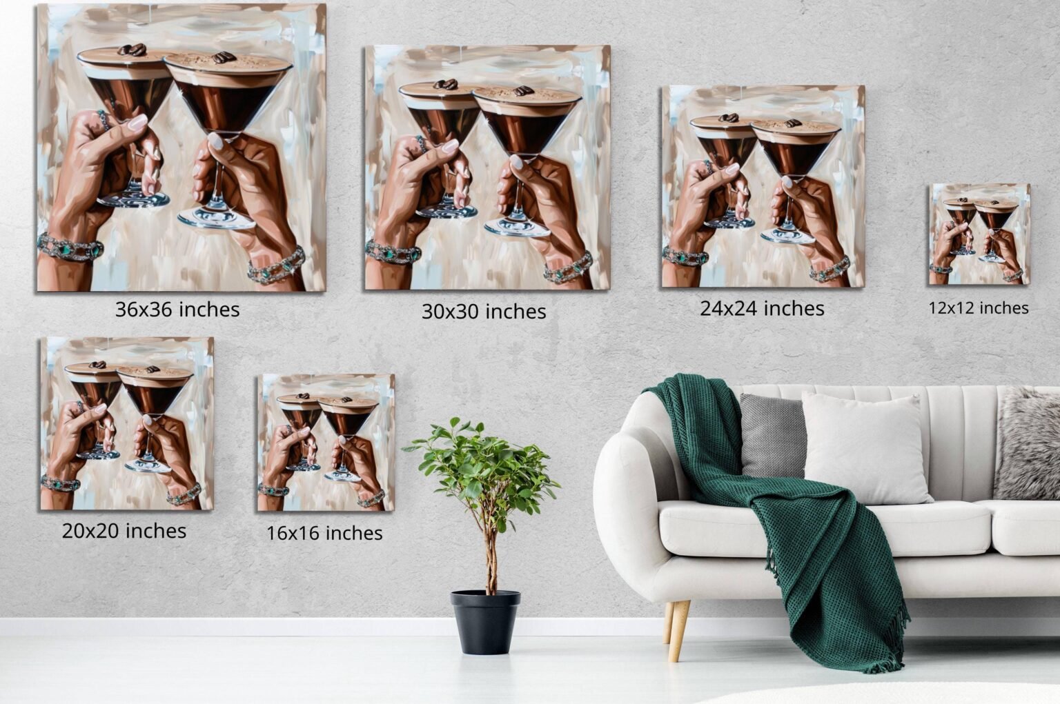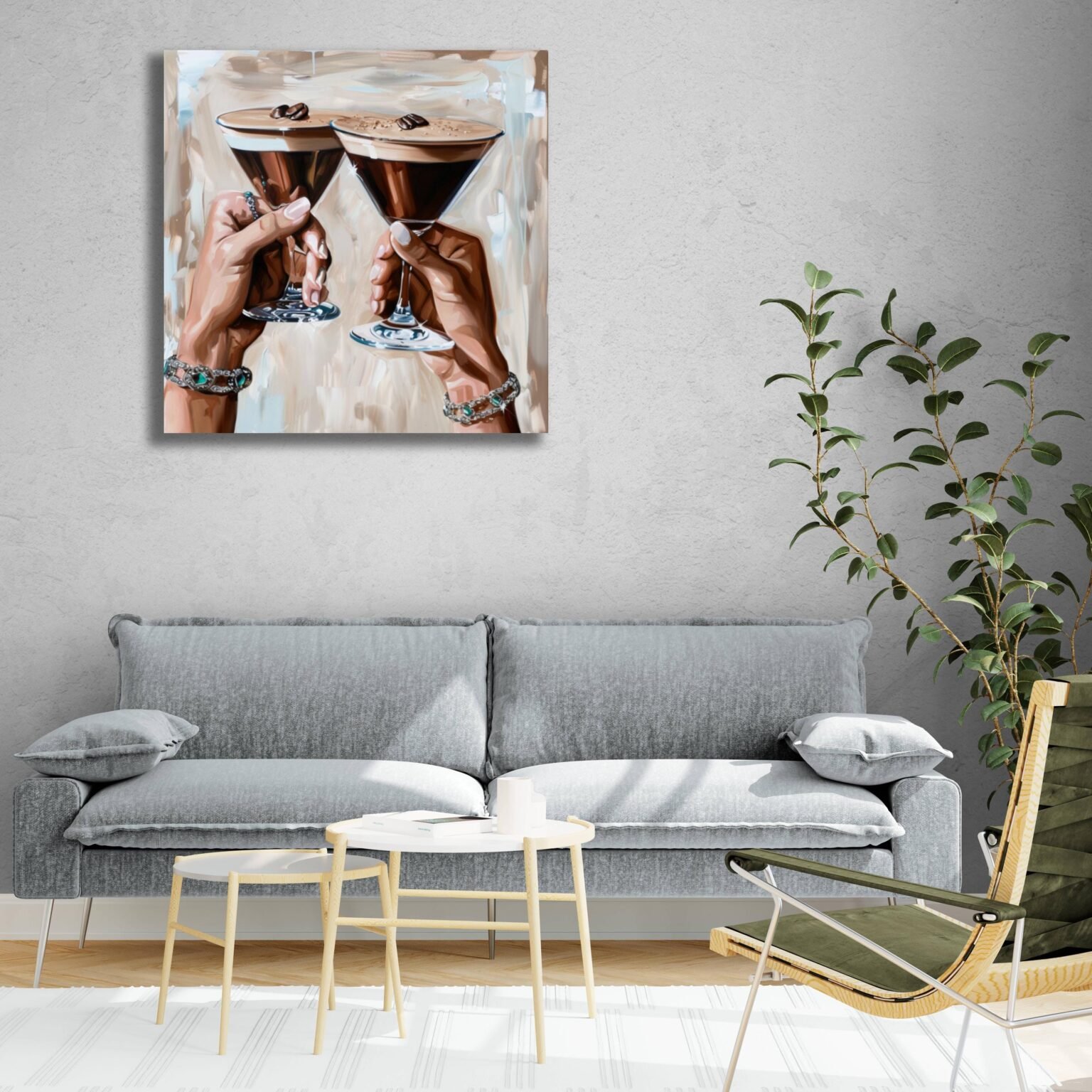 This painting showcases two espresso martinis side by side inviting you to savor their rich colors and tempting froth. Perfect for a bar cart, kitchen, or dining room decor!