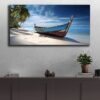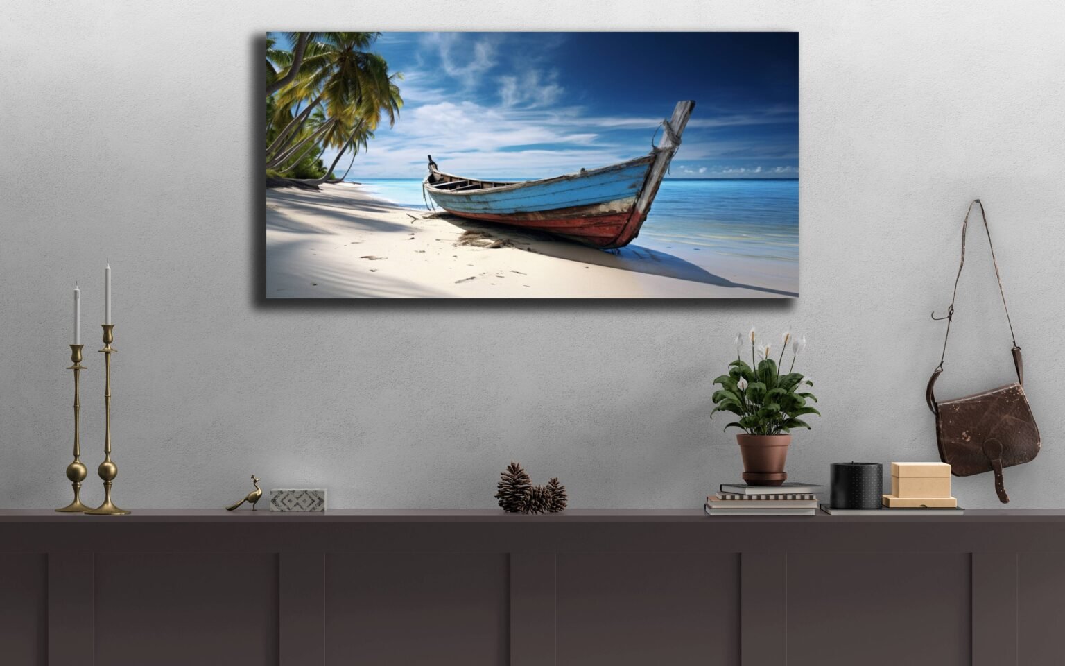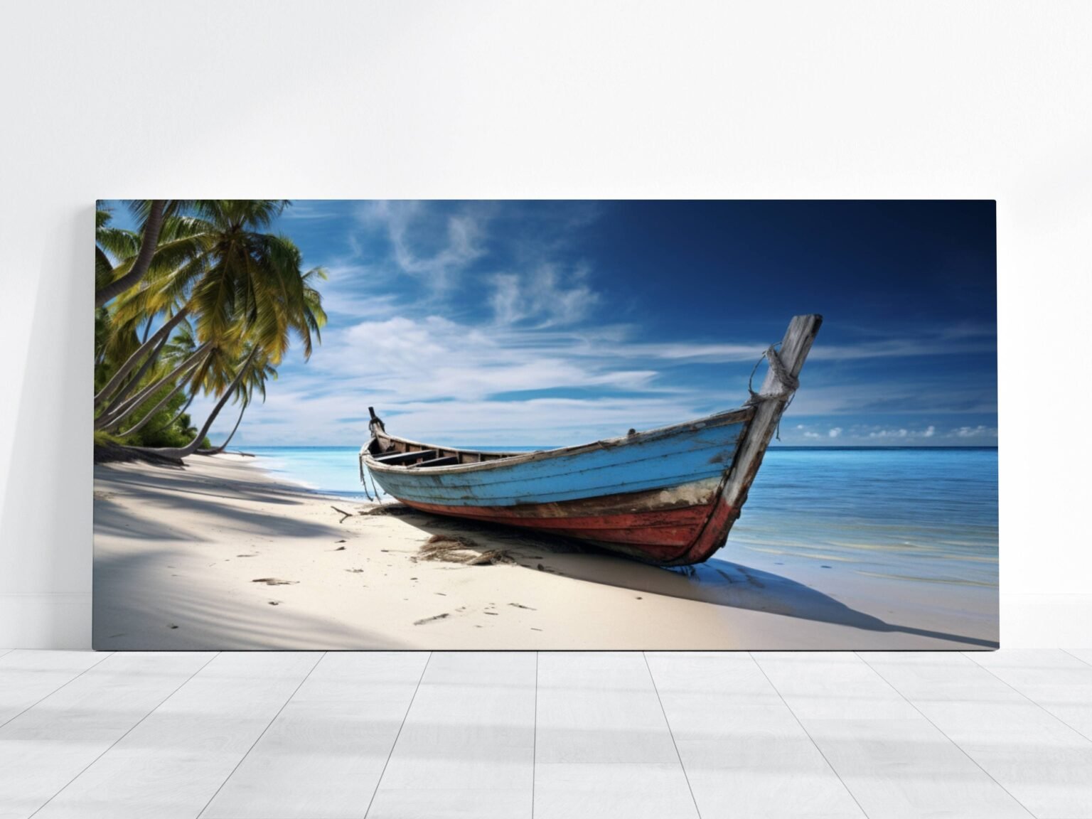 Nestled on the soft, sun-kissed sand, the row boat is positioned in a way that invites contemplation and serenity. The play of natural light and shadows adds depth and dimension to the photograph, emphasizing the boat's presence and creating a sense of peaceful solitude.