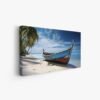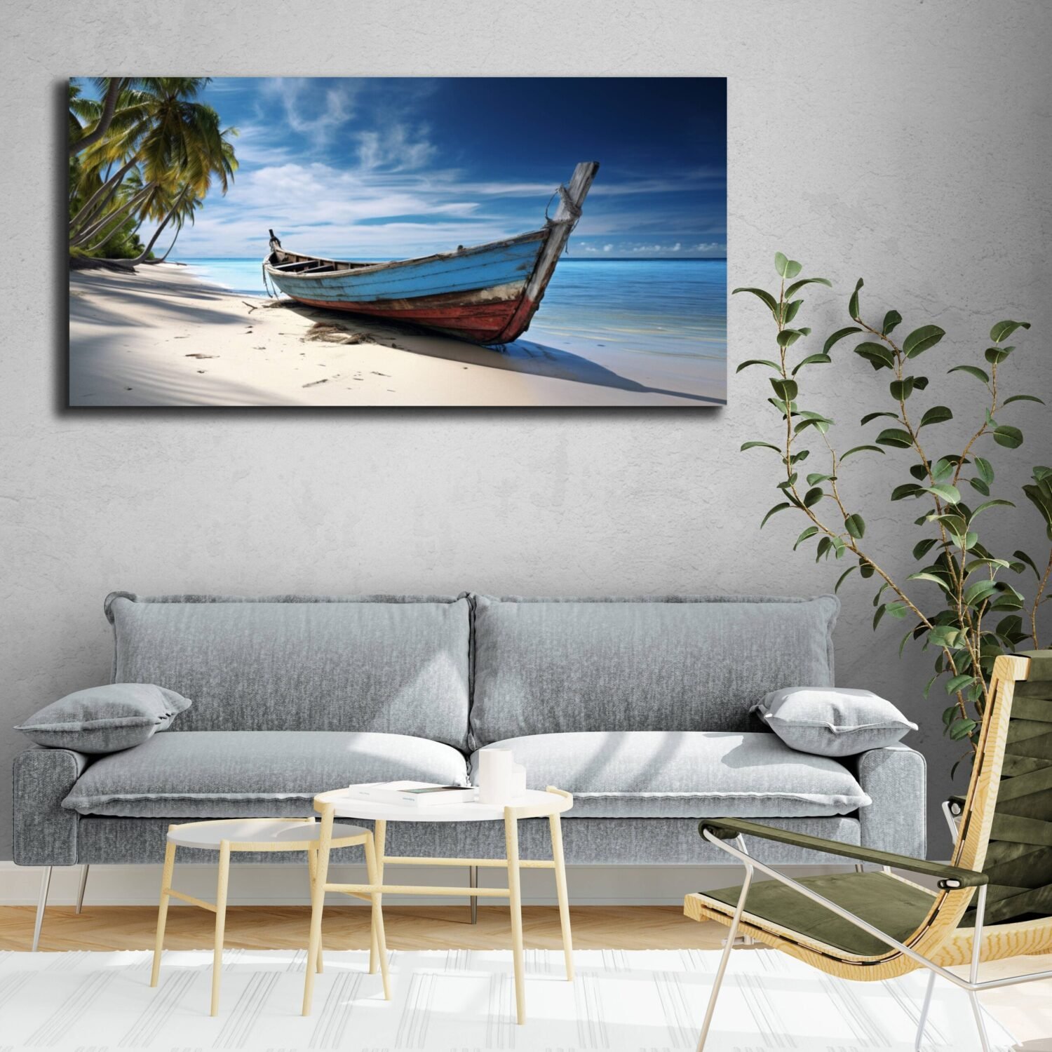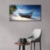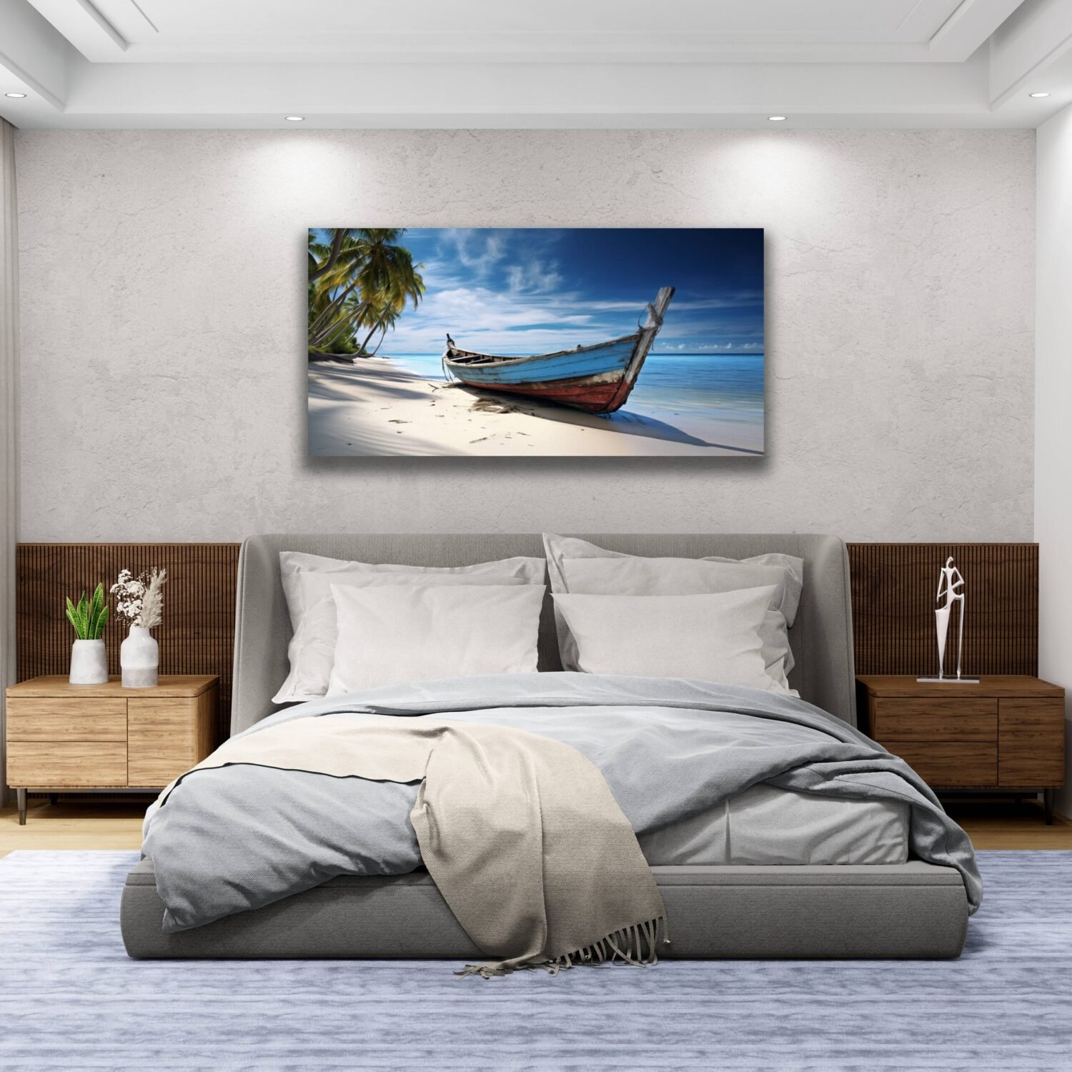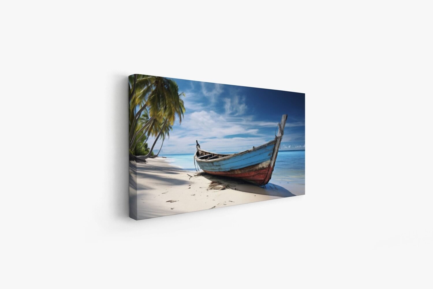 Nestled on the soft, sun-kissed sand, the row boat is positioned in a way that invites contemplation and serenity. The play of natural light and shadows adds depth and dimension to the photograph, emphasizing the boat's presence and creating a sense of peaceful solitude.