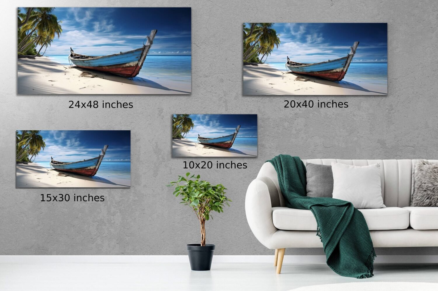 The focal point of the photograph is the row boat, which exudes an air of nostalgic allure. The weathered wood and rustic details of the boat's hull and oars tell a story of past adventures and evoke a sense of exploration. The artist's keen eye for composition brings out the boat's graceful lines, inviting viewers to imagine embarking on their own seaside journeys.