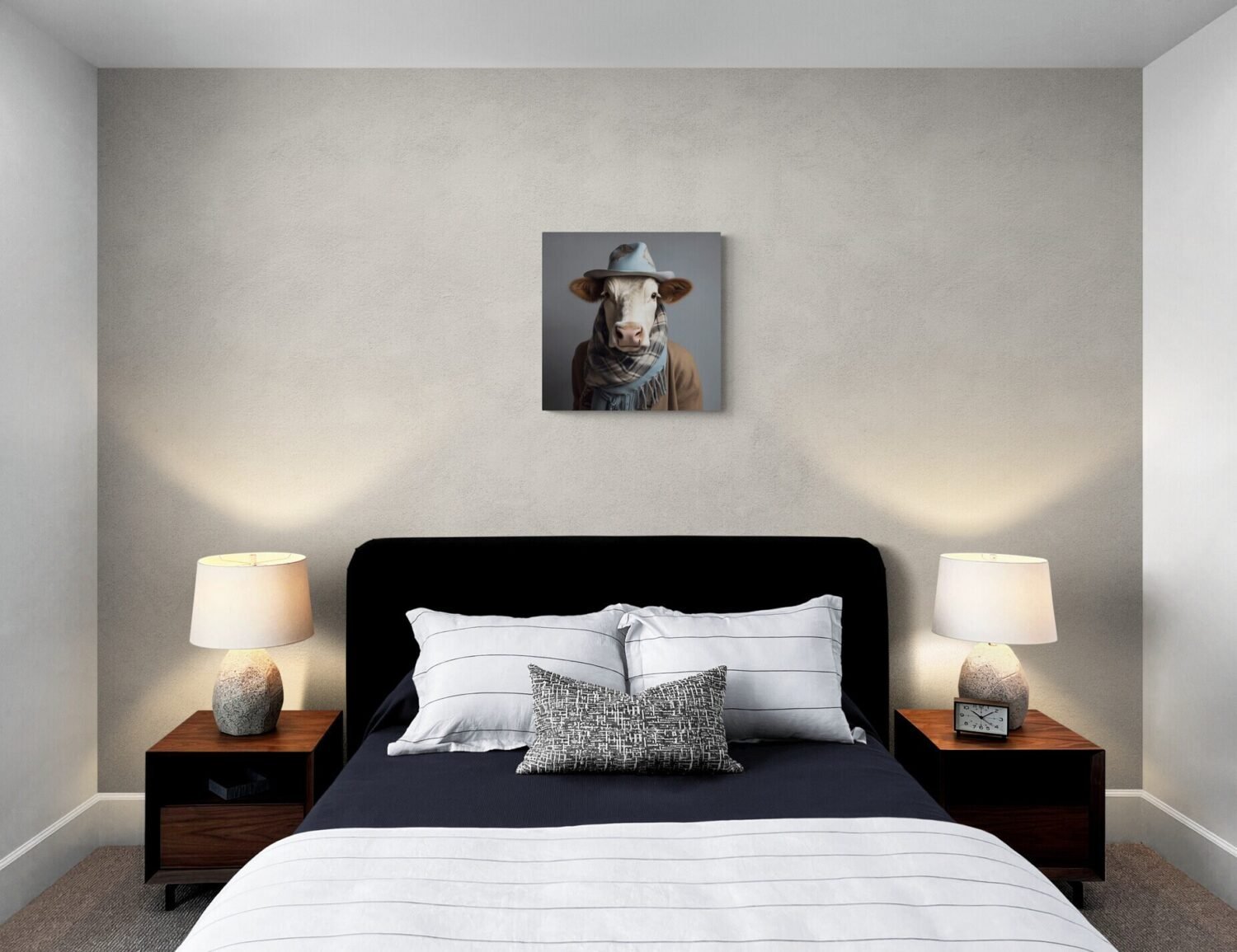 This cow is donning a human disguise, showcasing its humorous side. Dressed in human clothes, this delightful creature brings a smile with its playful charm and unexpected attire. A funny and endearing snapshot that adds a touch of laughter to your day!