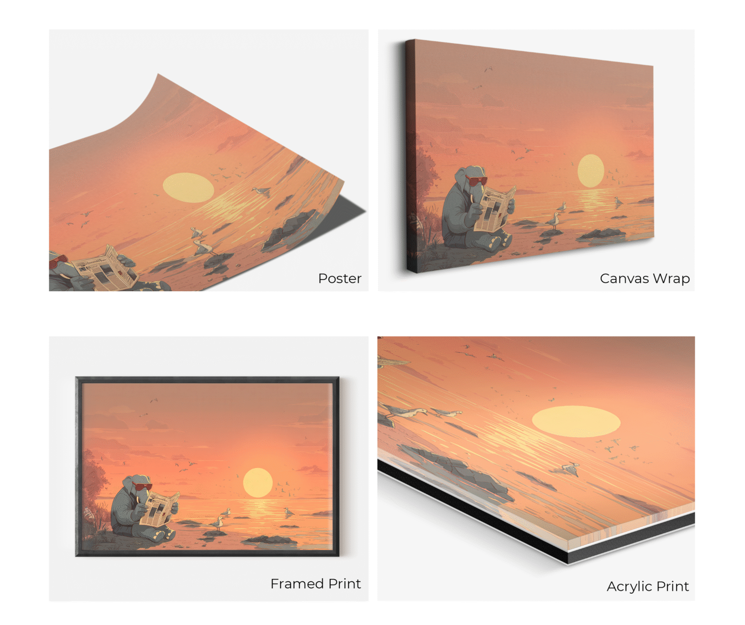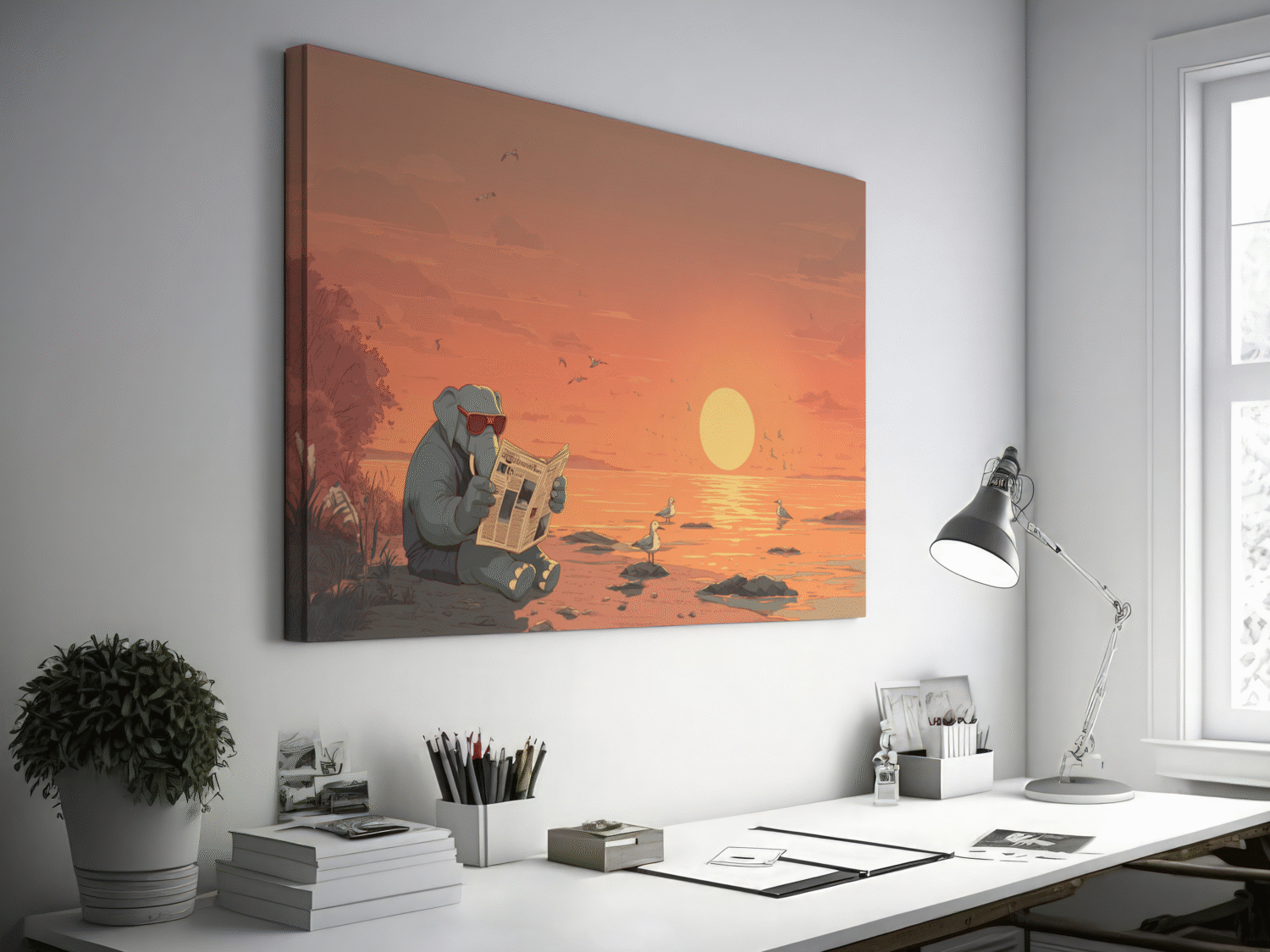 Whimsical elephant reading at sunset beach print — funny animal wall art with cute illustration, perfect for nurseries, kids rooms, or home decor.