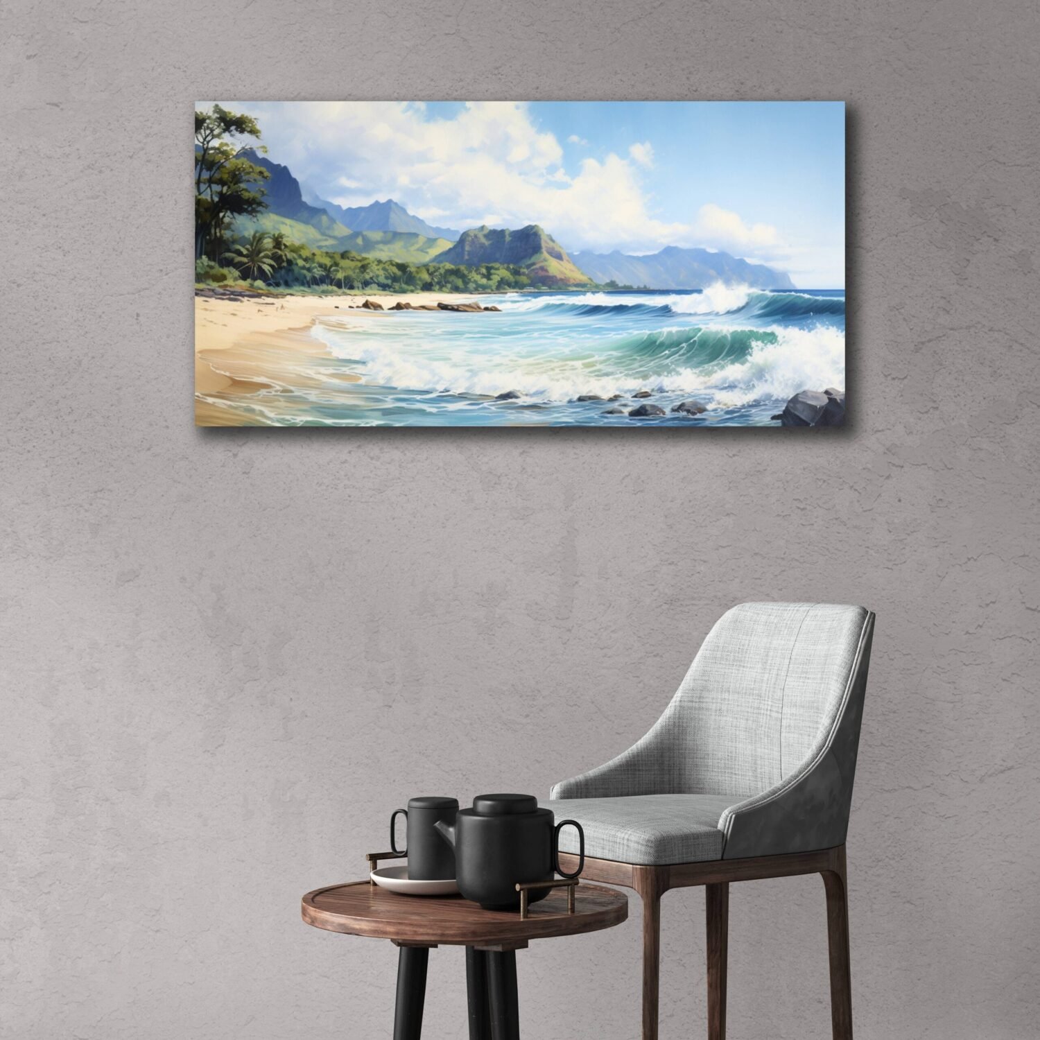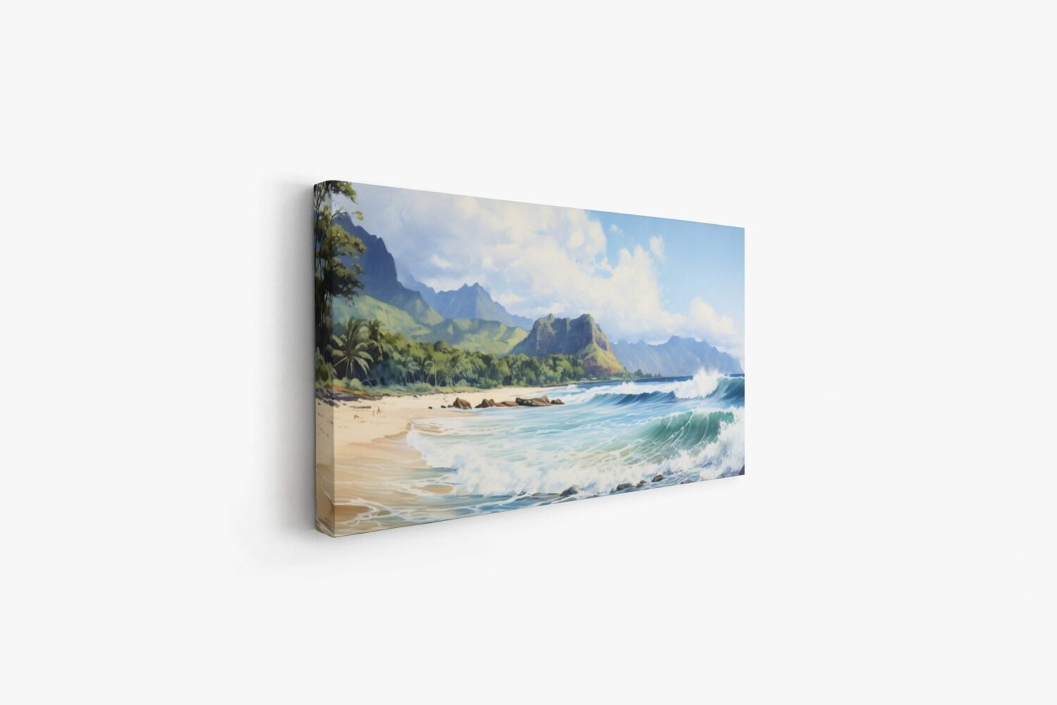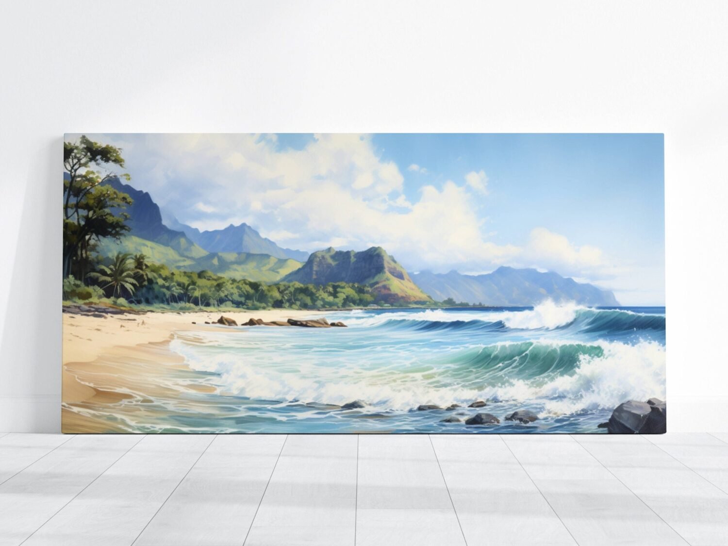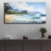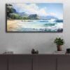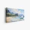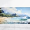 Capture the serene beauty of Hawaii's stunning beaches with this exquisite watercolor painting. Expertly crafted with meticulous attention to detail, this artwork brings the essence of tropical paradise right into your living space. Waves crashing, beautiful sandy shores, and tall mountains in the background capture the beauty of the landscape of Hawaii.