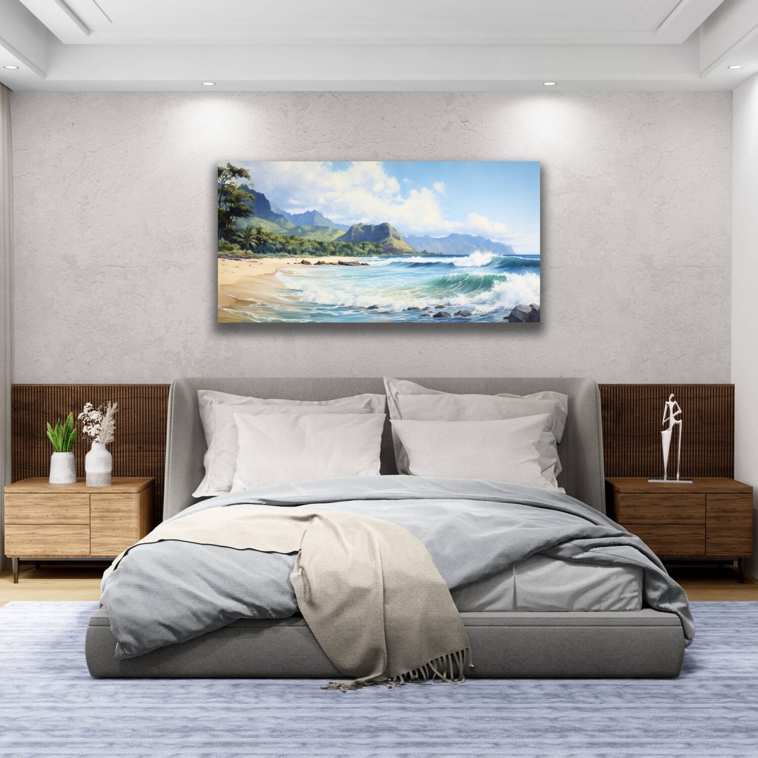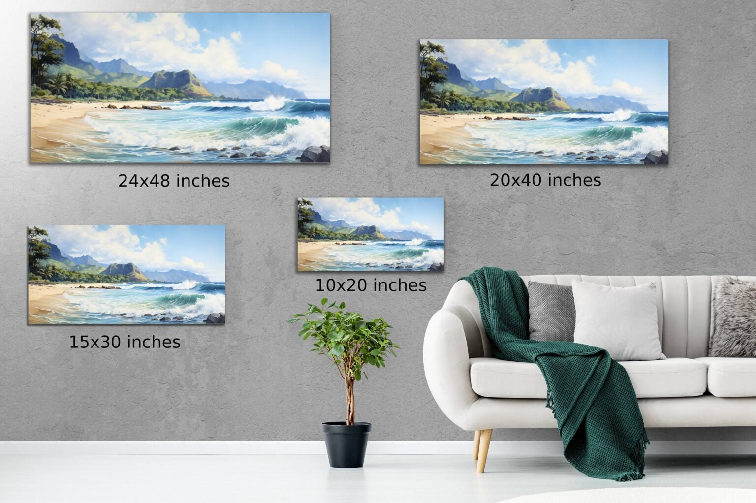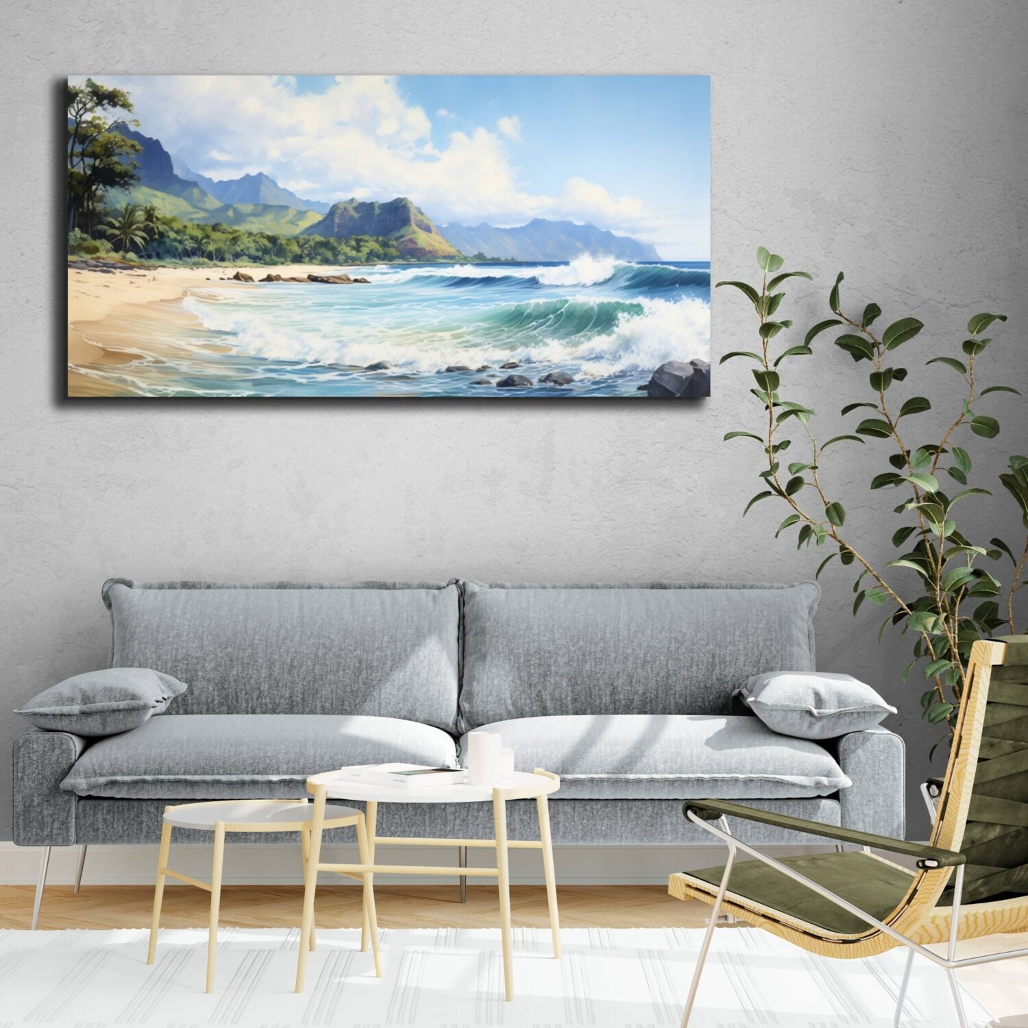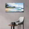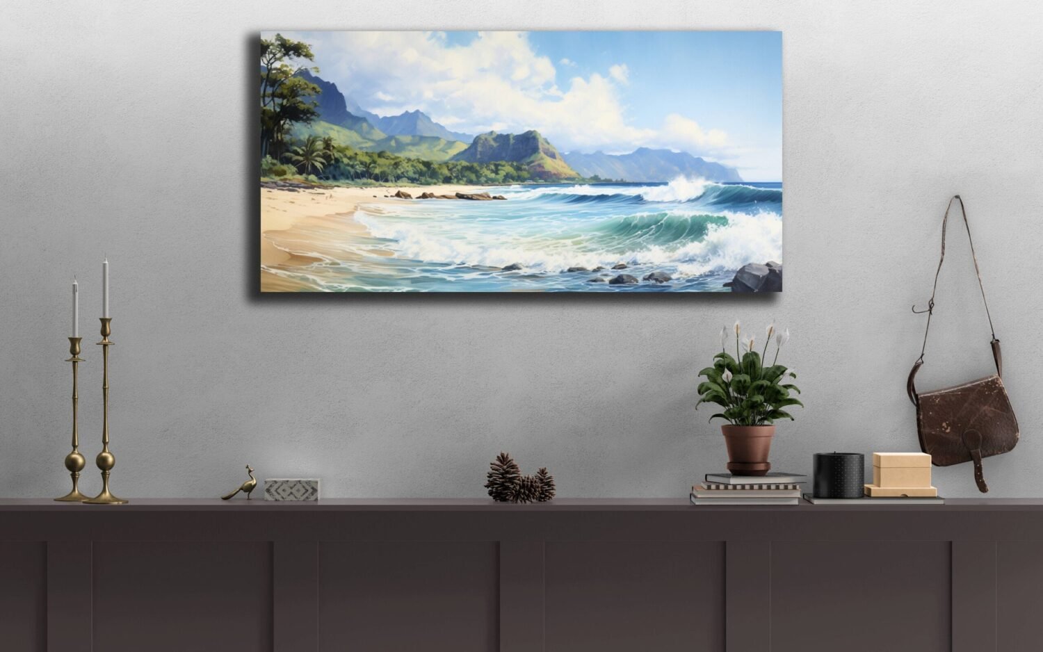 Capture the serene beauty of Hawaii's stunning beaches with this exquisite watercolor painting. Expertly crafted with meticulous attention to detail, this artwork brings the essence of tropical paradise right into your living space. Waves crashing, beautiful sandy shores, and tall mountains in the background capture the beauty of the landscape of Hawaii.