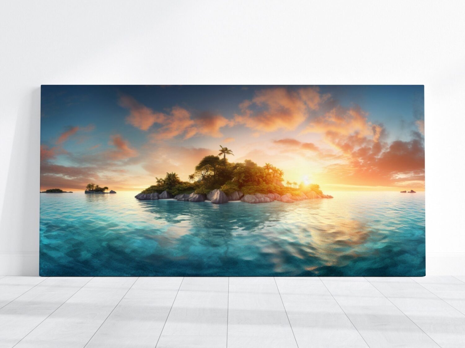 This art transports you to a secluded paradise where serenity and beauty converge. This stunning image captures the essence of an idyllic tropical getaway, with a mesmerizing sunset serving as a backdrop.