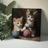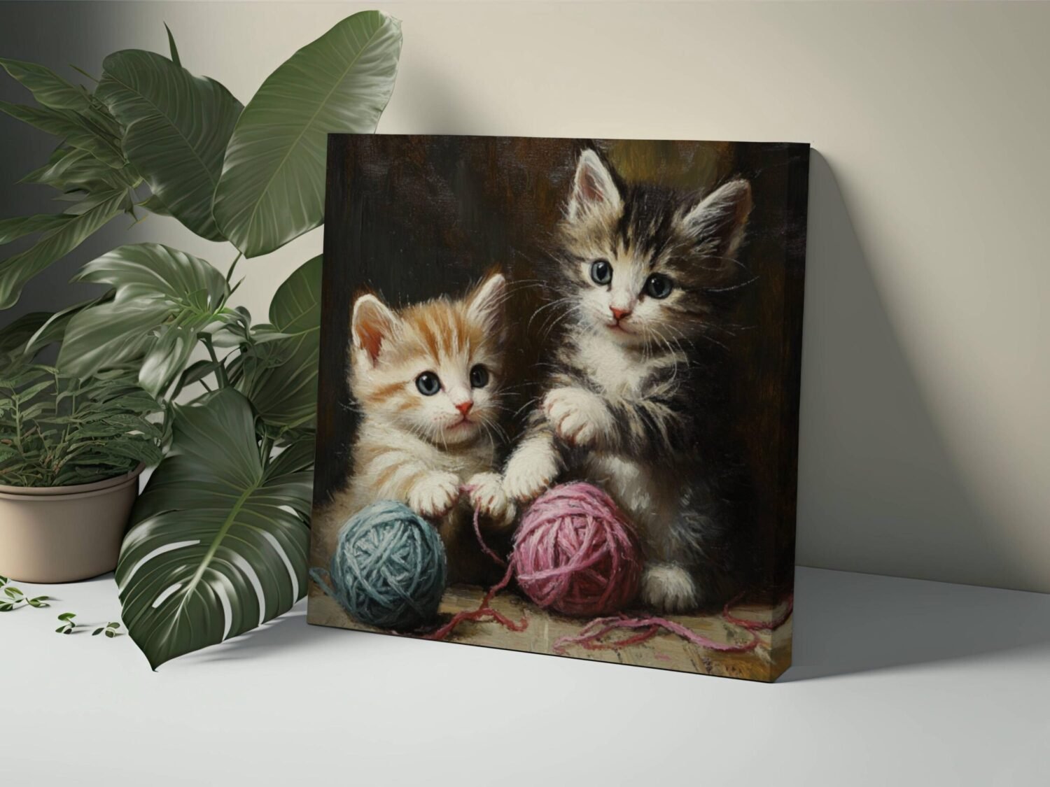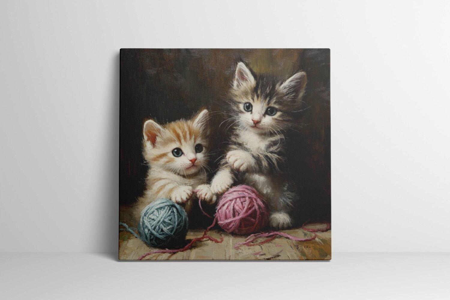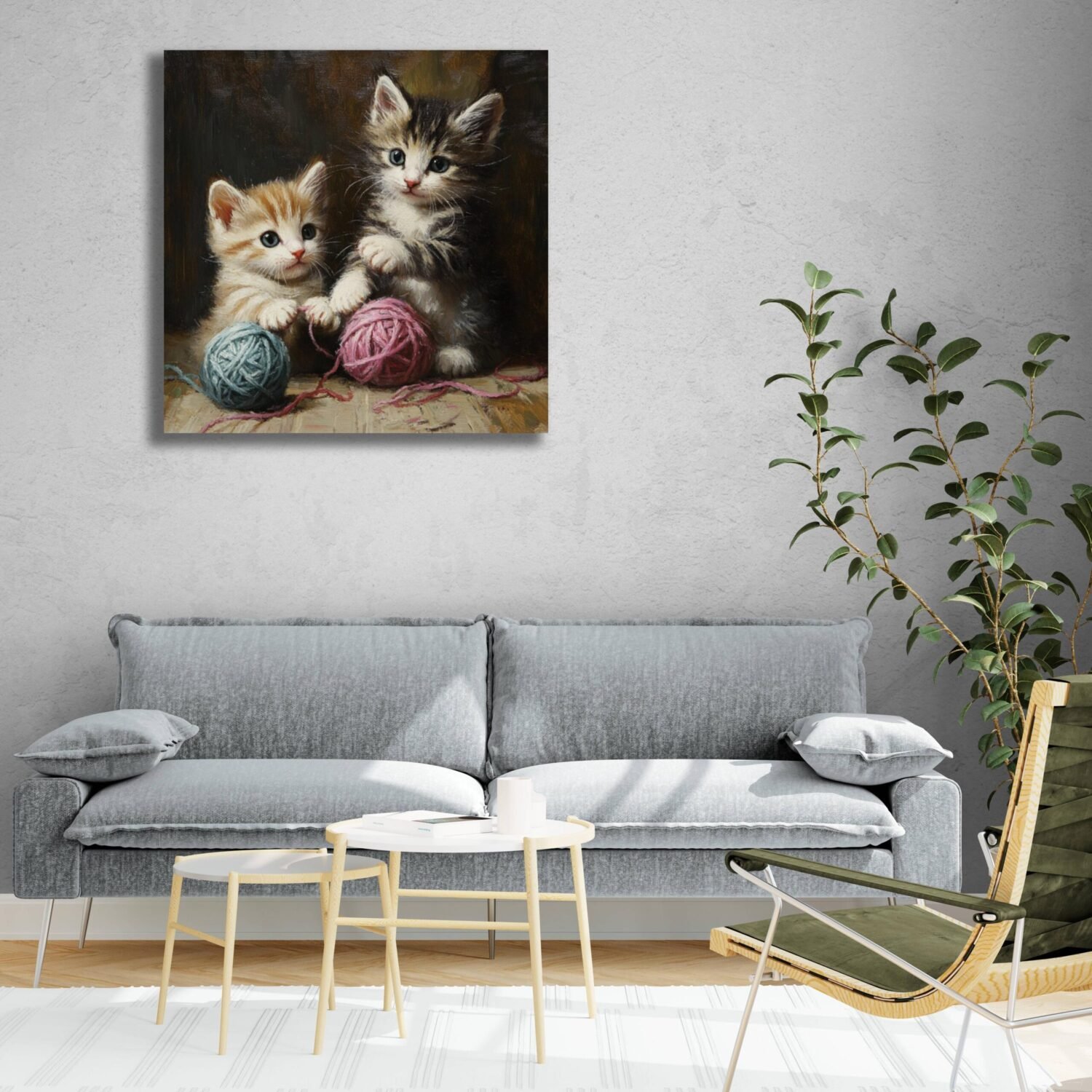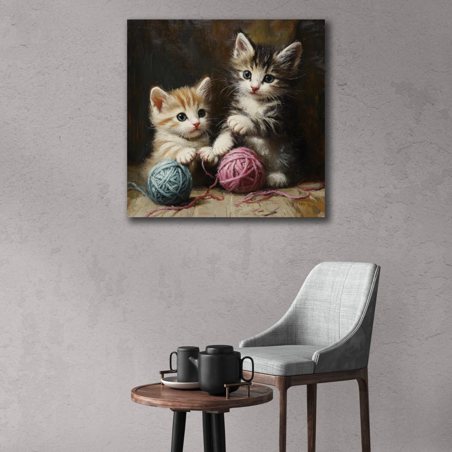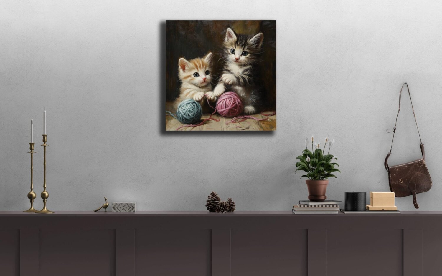 Adorable kittens playing with colorful yarn, perfect for adding a playful touch to any space. These curious felines are full of energy, tumbling and chasing balls of soft yarn.