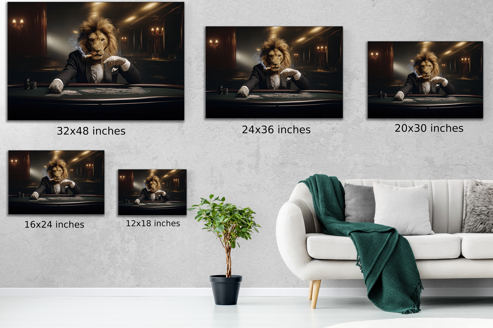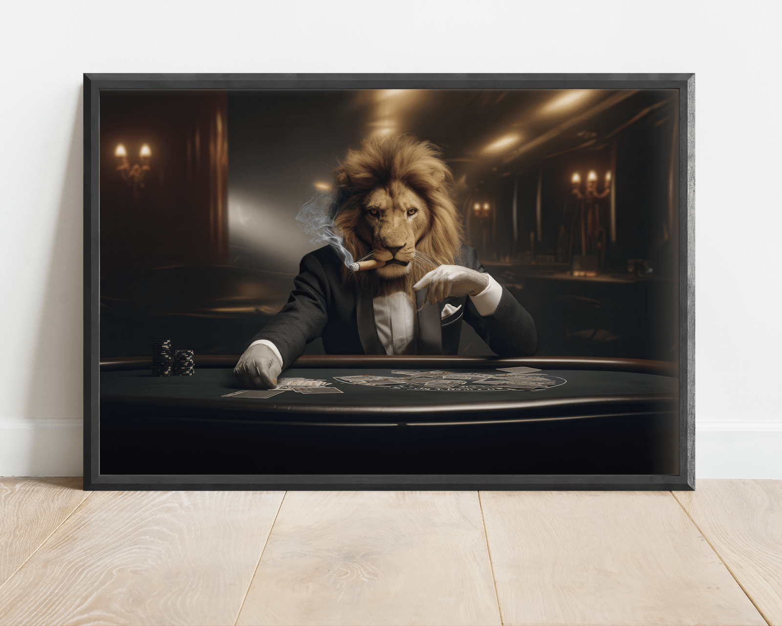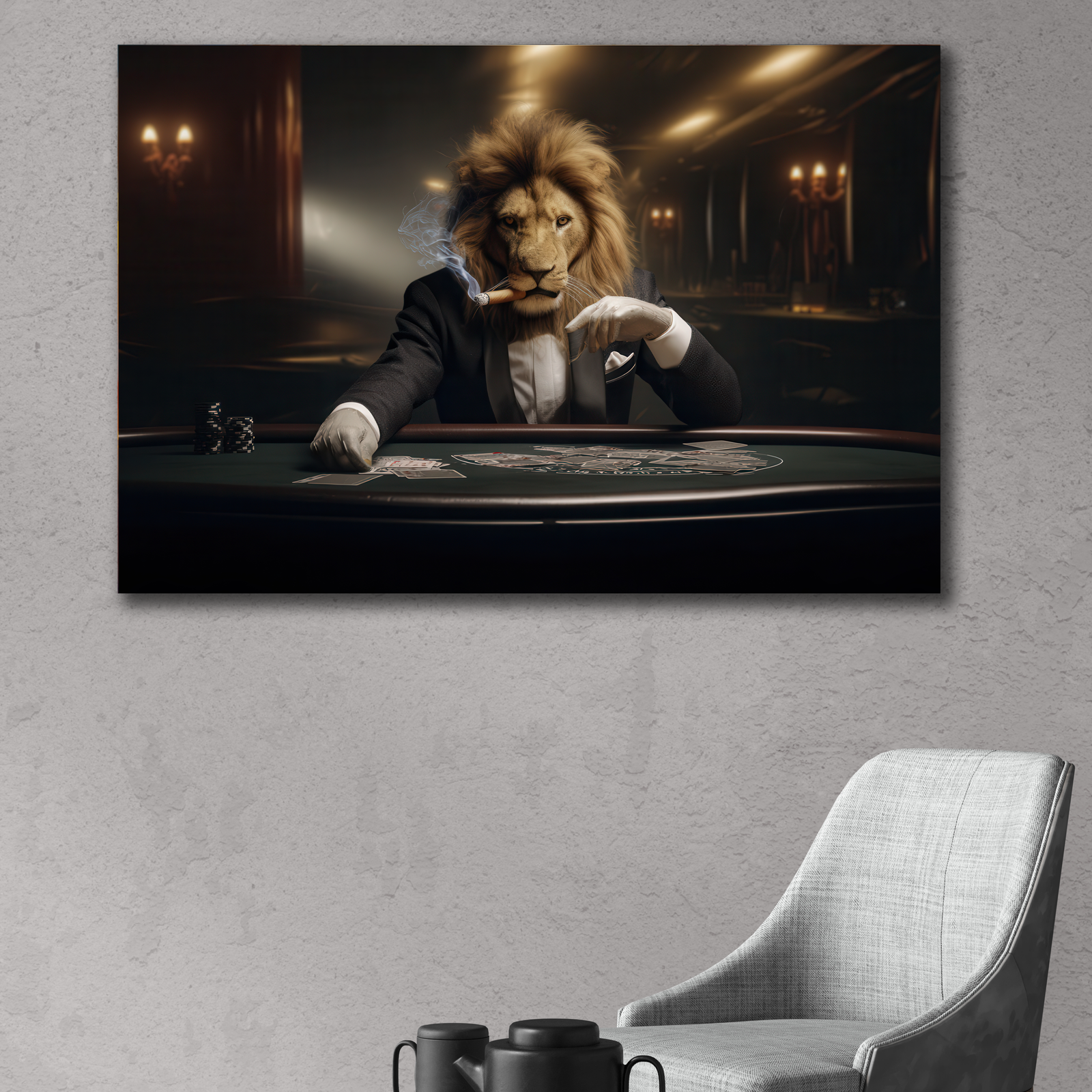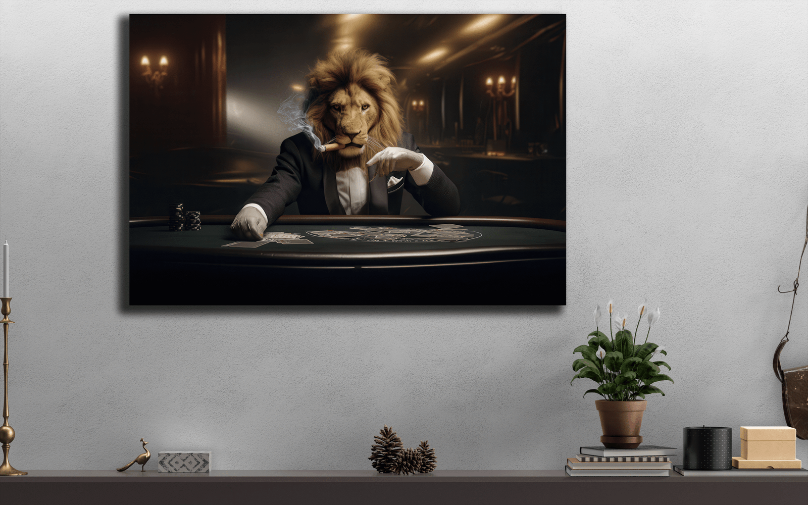 A commanding and stylish piece, this artwork features a majestic lion dressed in a tuxedo, confidently seated at a poker table while smoking a cigar. With a moody, cinematic backdrop and rich details, it blends power, class, and fantasy—ideal for game rooms, masculine decor spaces, or lovers of surreal animal portraits.