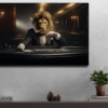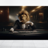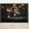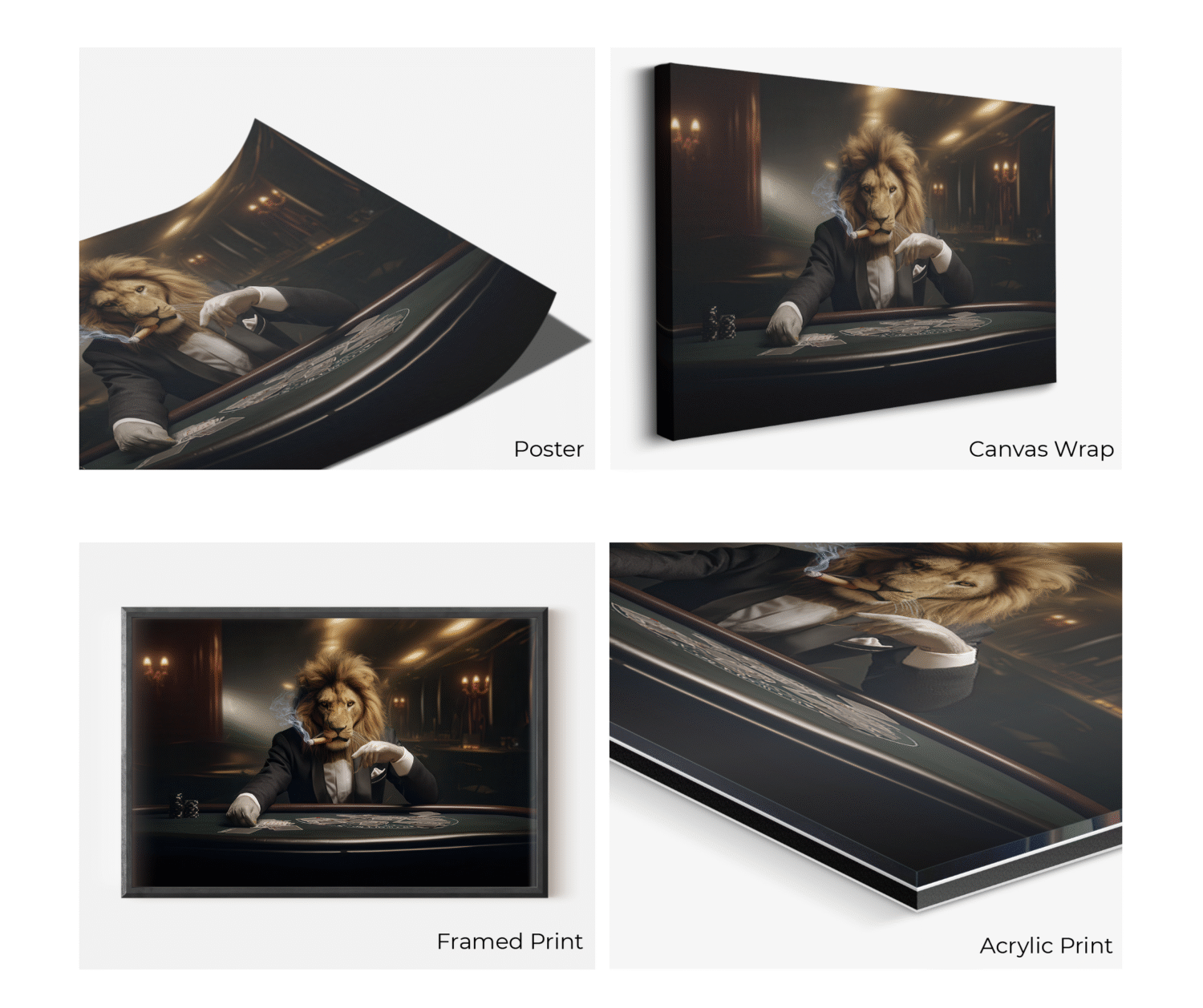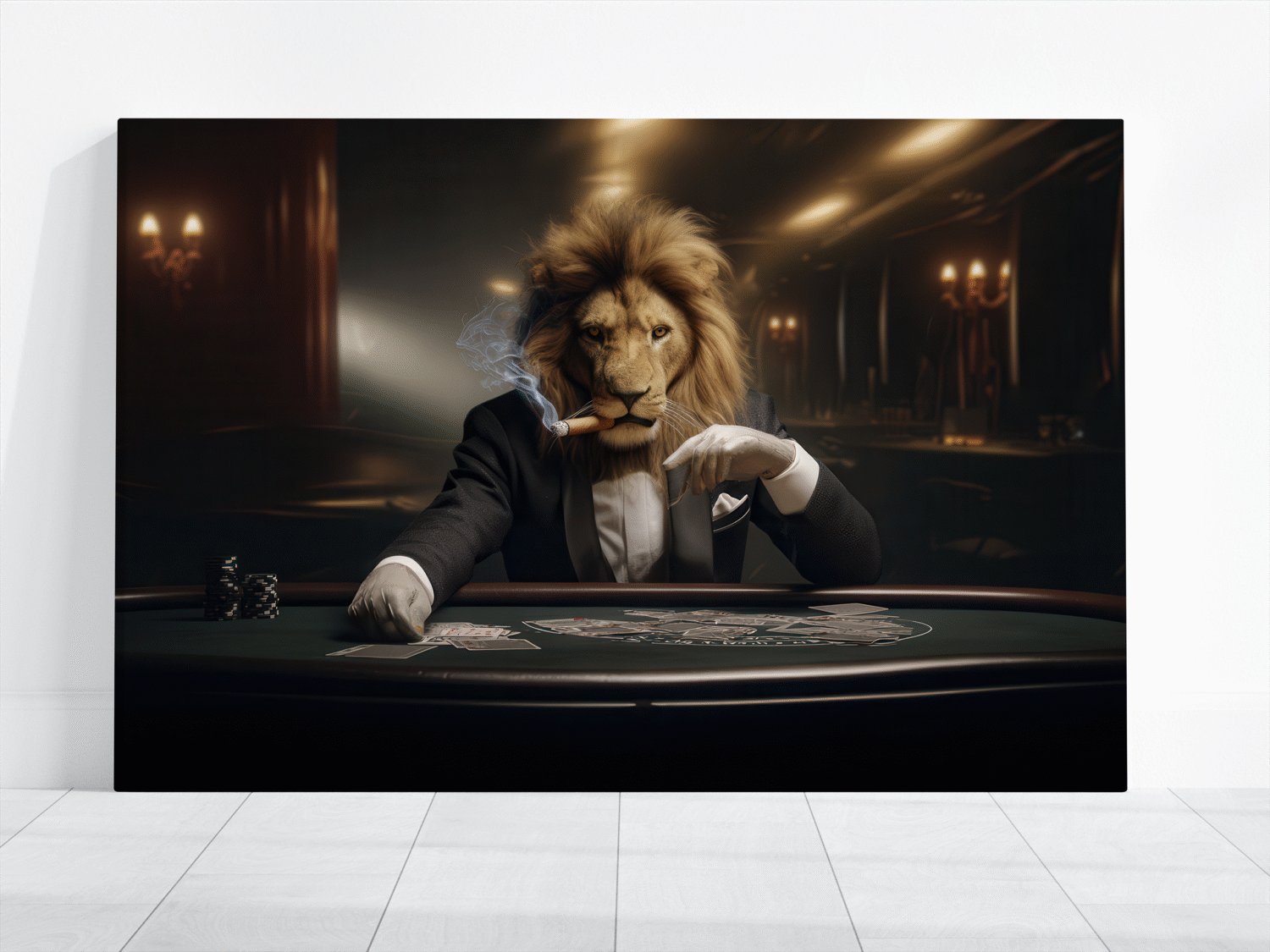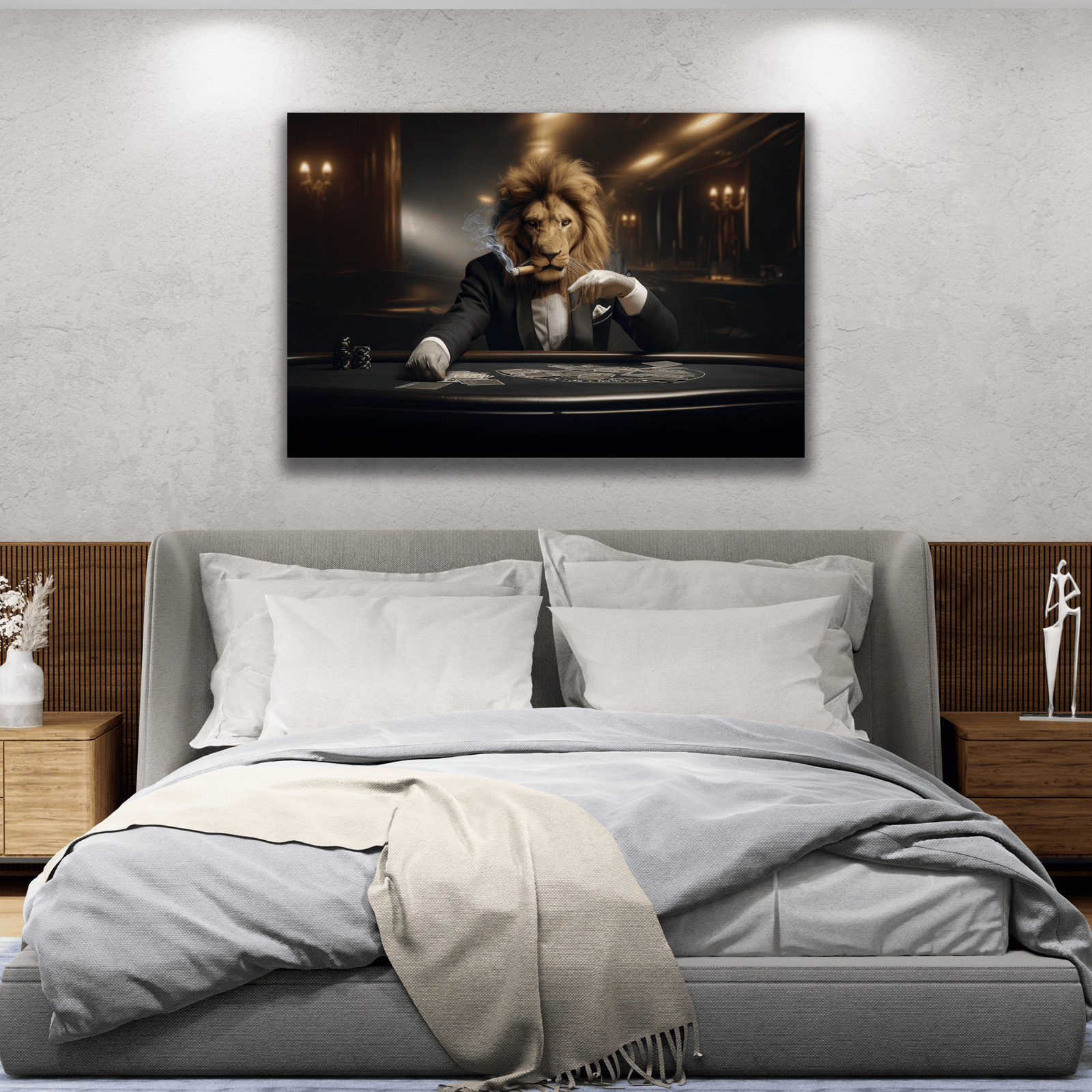 A commanding and stylish piece, this artwork features a majestic lion dressed in a tuxedo, confidently seated at a poker table while smoking a cigar. With a moody, cinematic backdrop and rich details, it blends power, class, and fantasy—ideal for game rooms, masculine decor spaces, or lovers of surreal animal portraits.