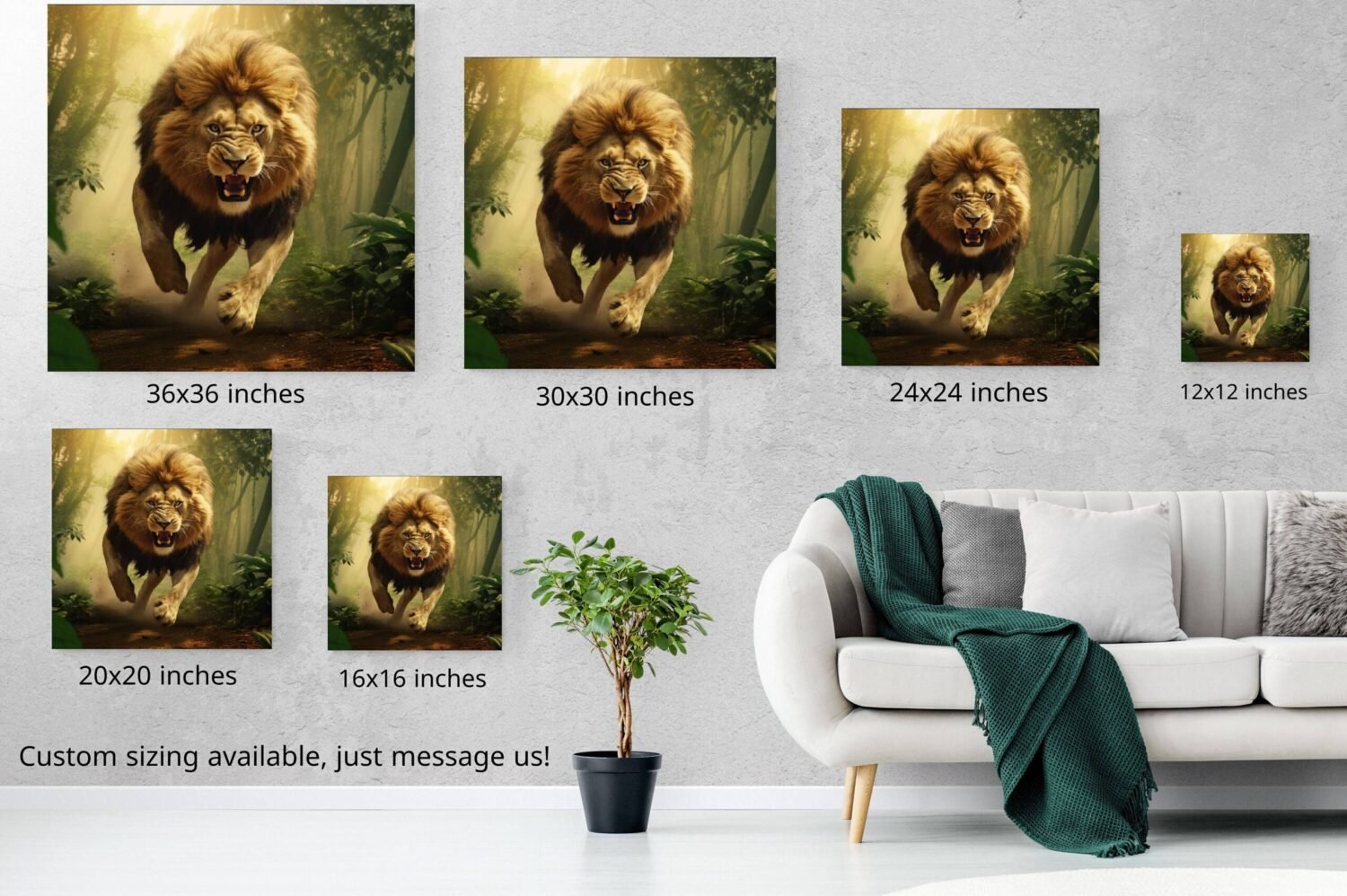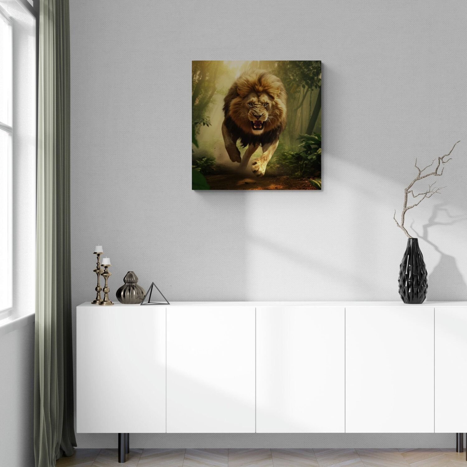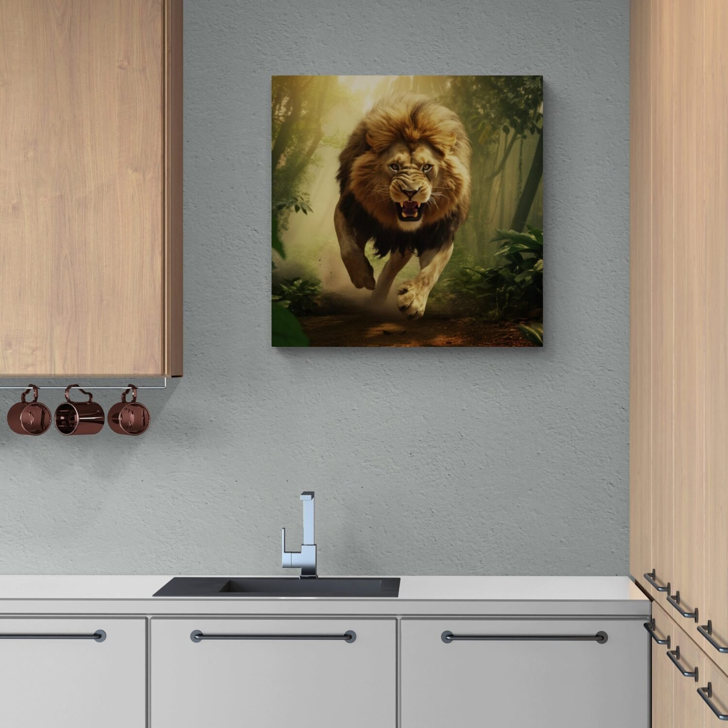 A captivating art piece that captures the raw power and beauty of the king of the jungle as it fearlessly traverses its natural habitat. This artwork showcases the untamed spirit of the lion and transports viewers to the heart of the lush and vibrant jungle. The canvas portrays a dynamic scene with rich, lush foliage enveloping the surroundings, creating a sense of depth and immersion. The artist has skillfully utilized a combination of vibrant greens, earthy browns, and pops of colorful flowers to depict the diverse and vibrant flora of the jungle.