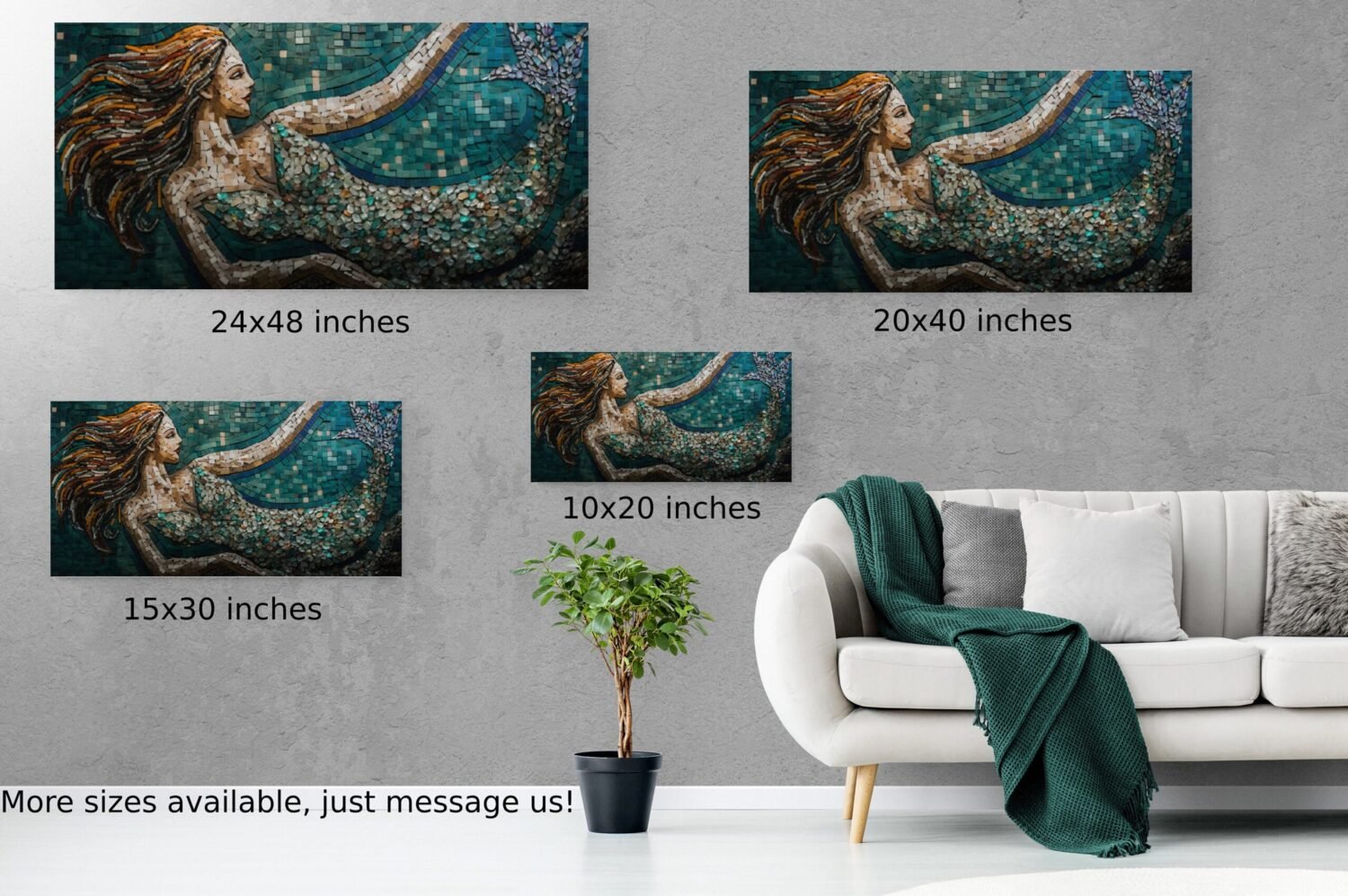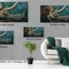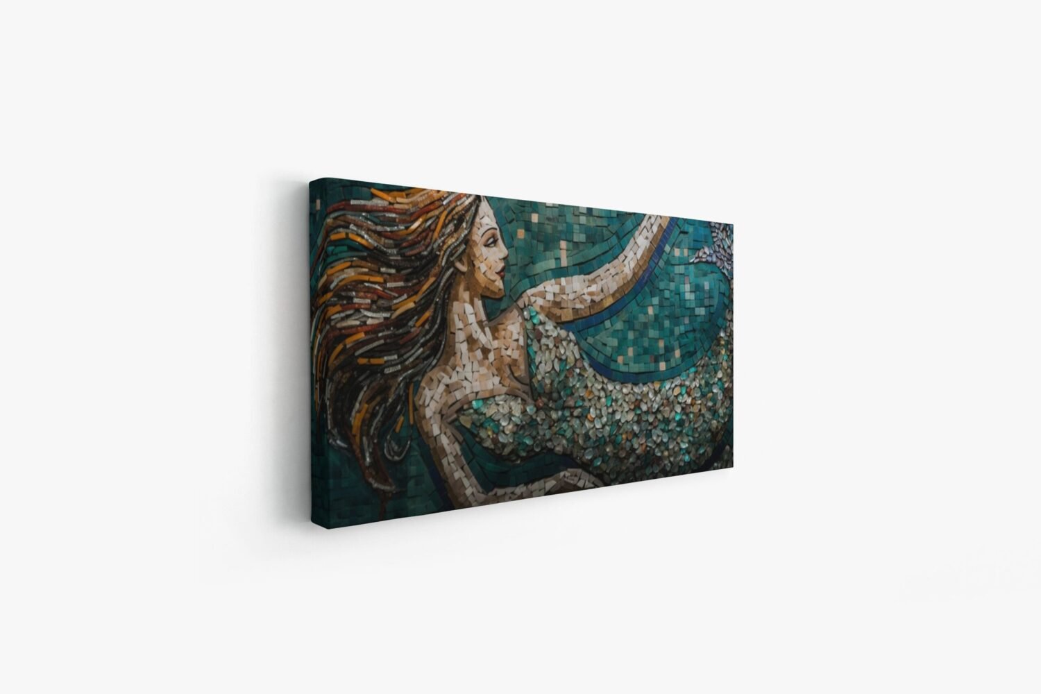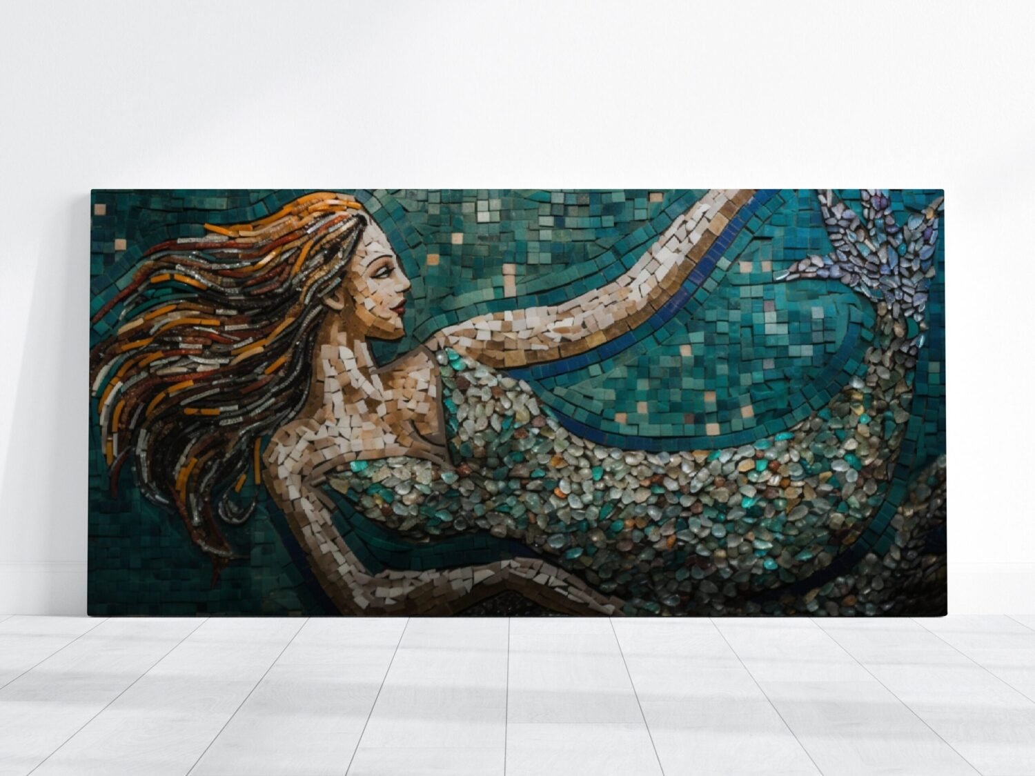 Mesmerizing artwork that combines the allure of mermaids with the intricate beauty of mosaic design. This stunning piece captures the essence of the mythical mermaid, while showcasing a unique mosaic-themed composition.