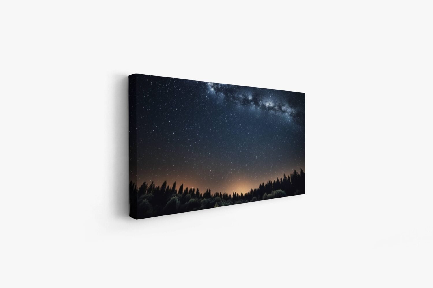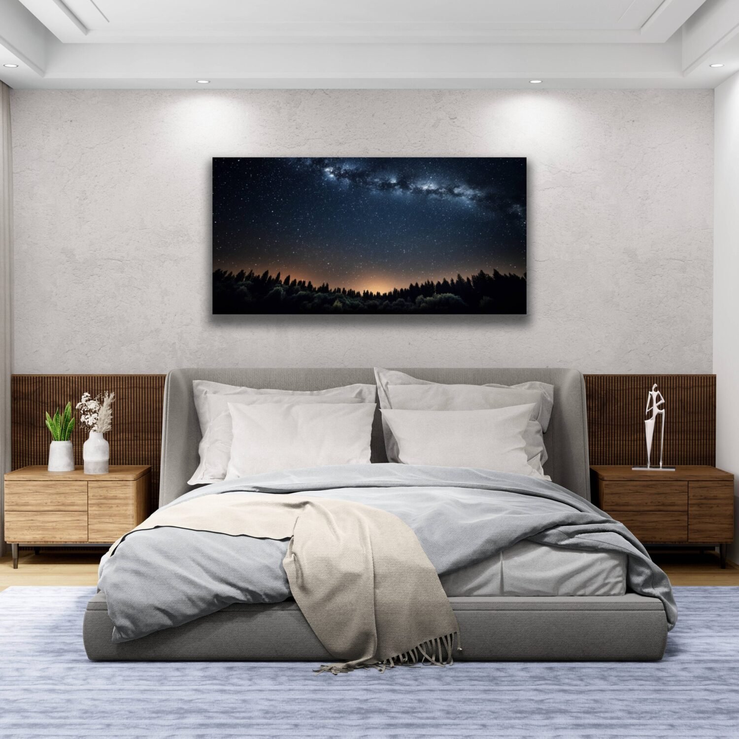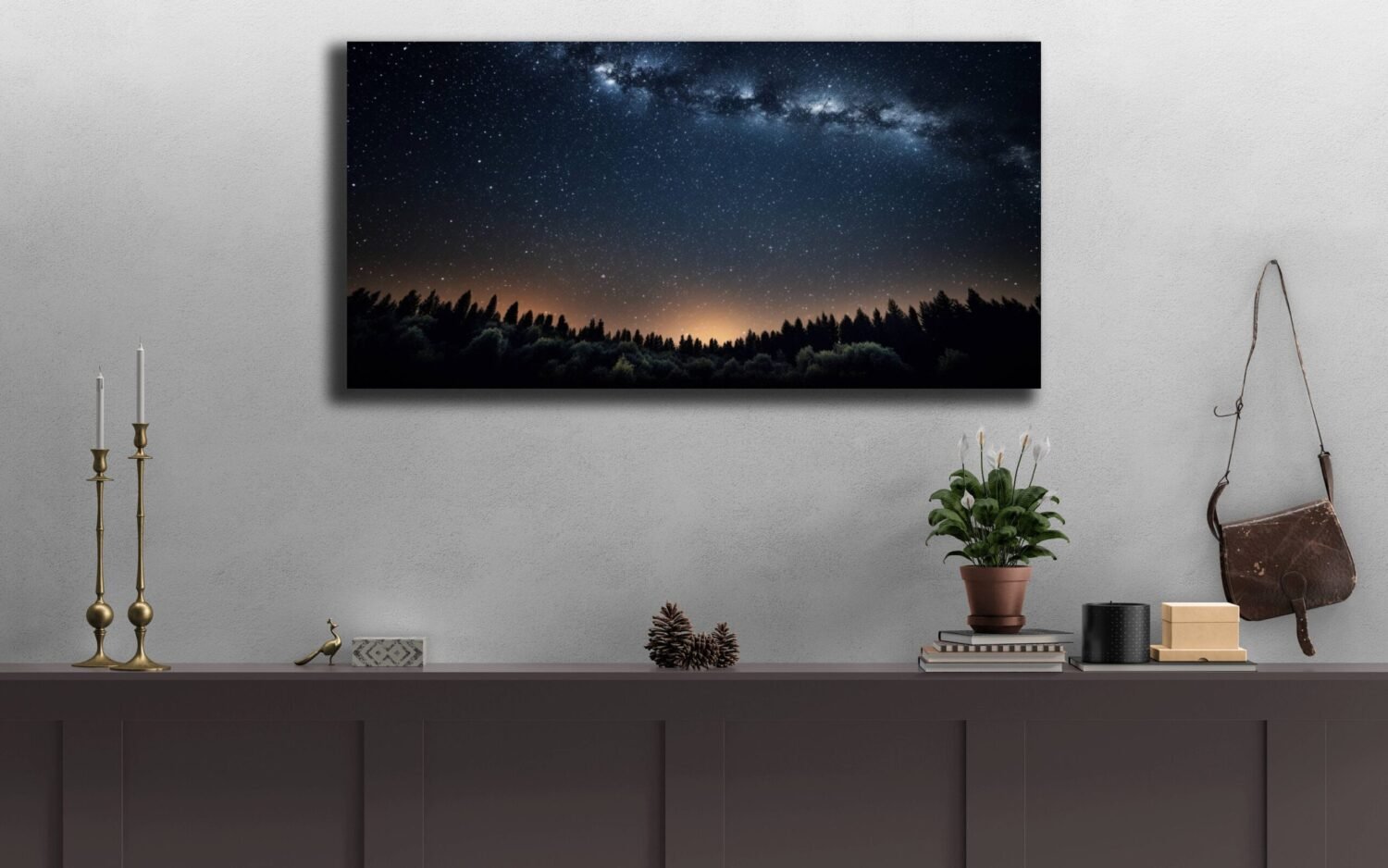 Starry Serenity: HD capture of the Milky Way gracing the night sky above a tranquil forest, a breathtaking celestial vista in nature's embrace.