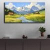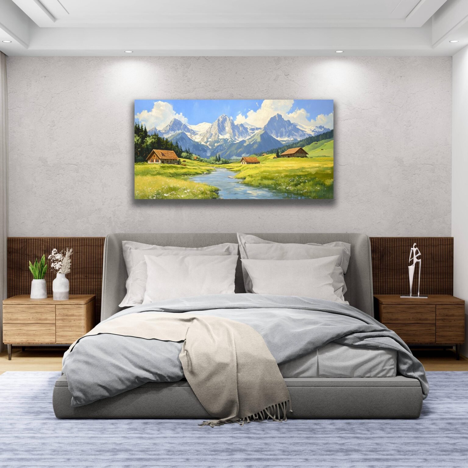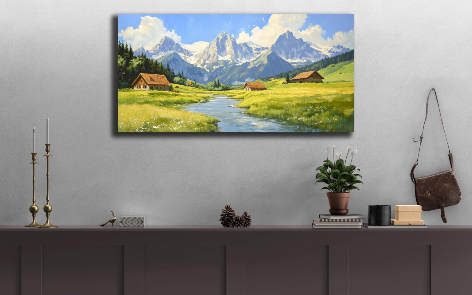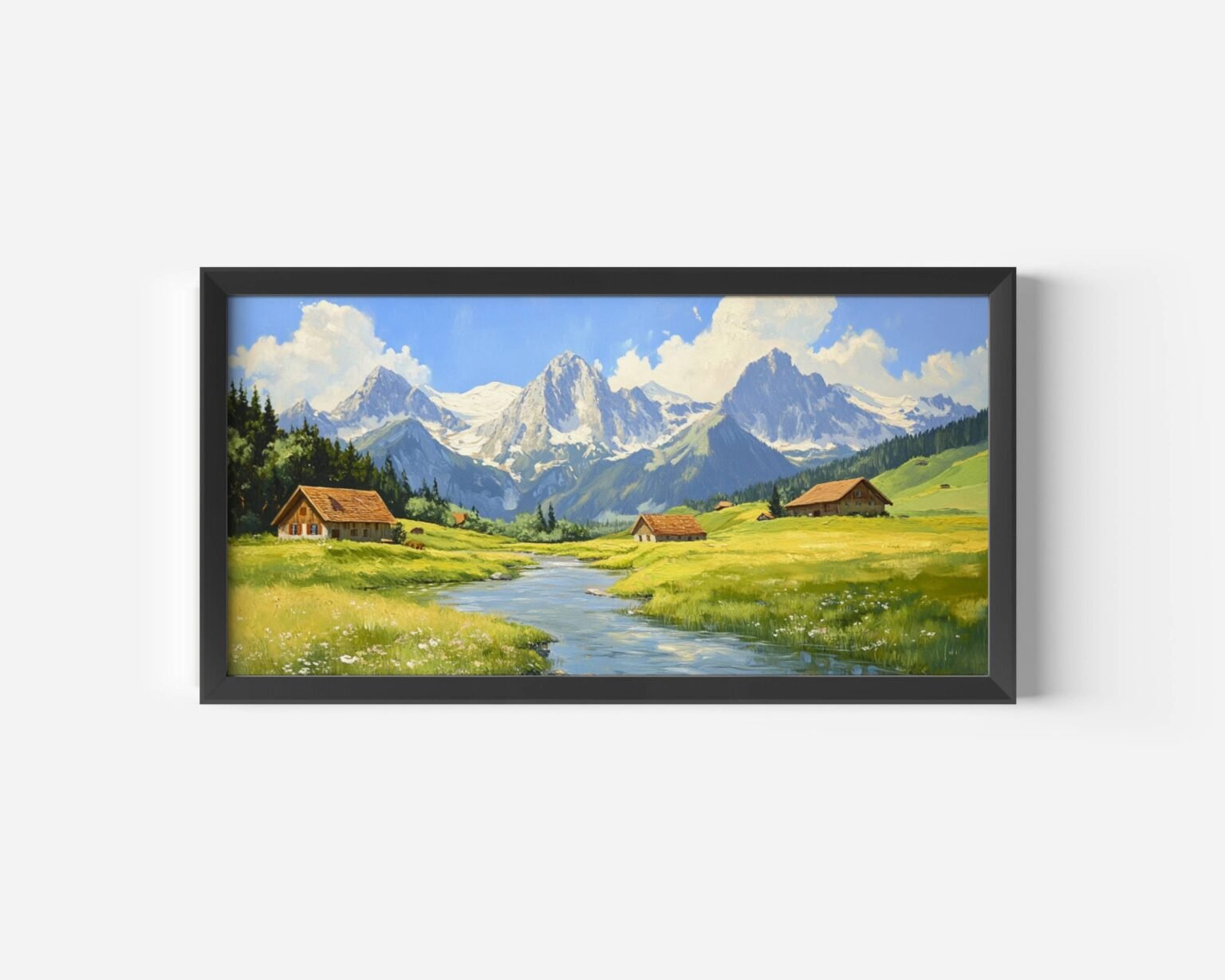 Beautiful painting of the breathtaking Switzerland mountains, featuring a serene river winding through the foreground and charming homes nestled below the peaks.