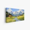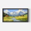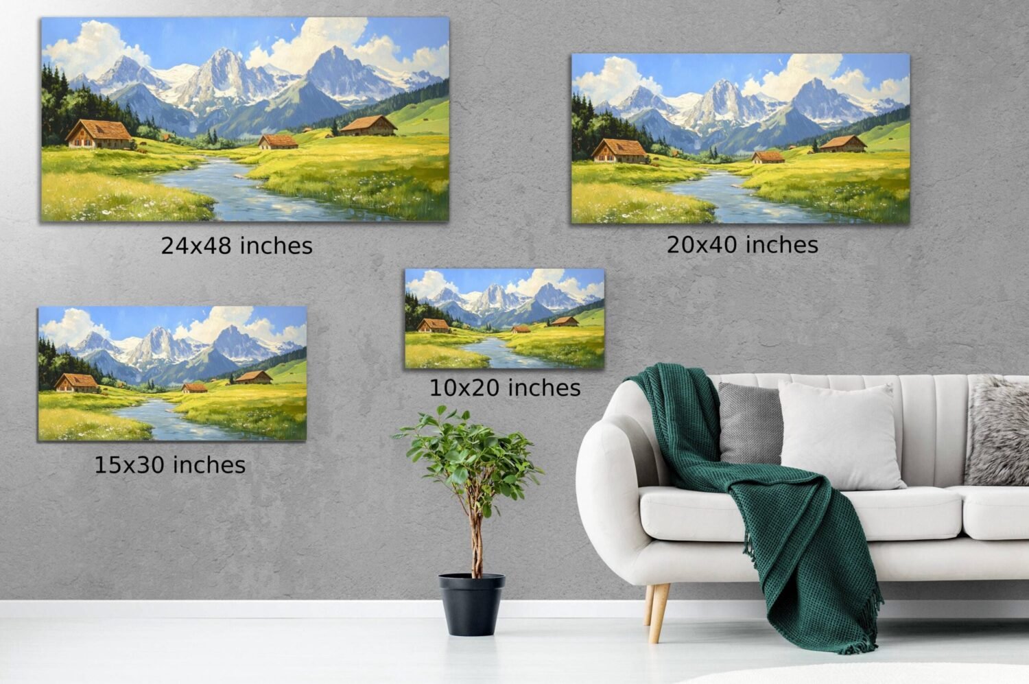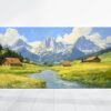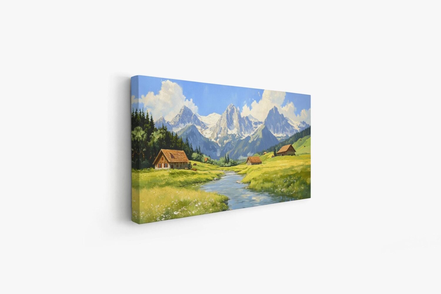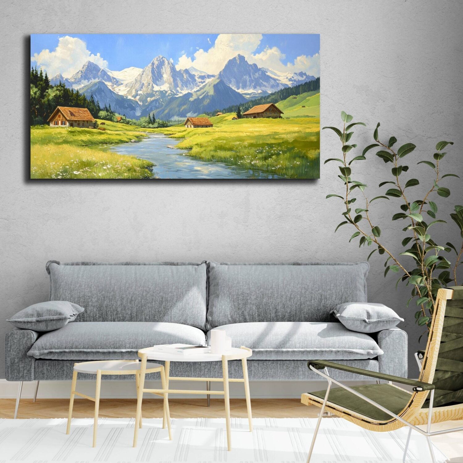 Beautiful painting of the breathtaking Switzerland mountains, featuring a serene river winding through the foreground and charming homes nestled below the peaks.