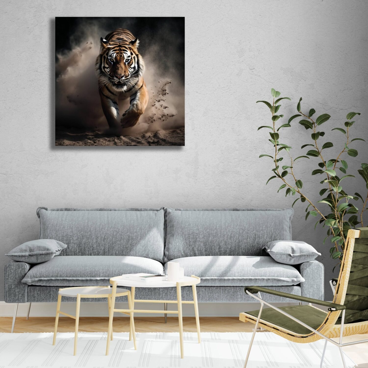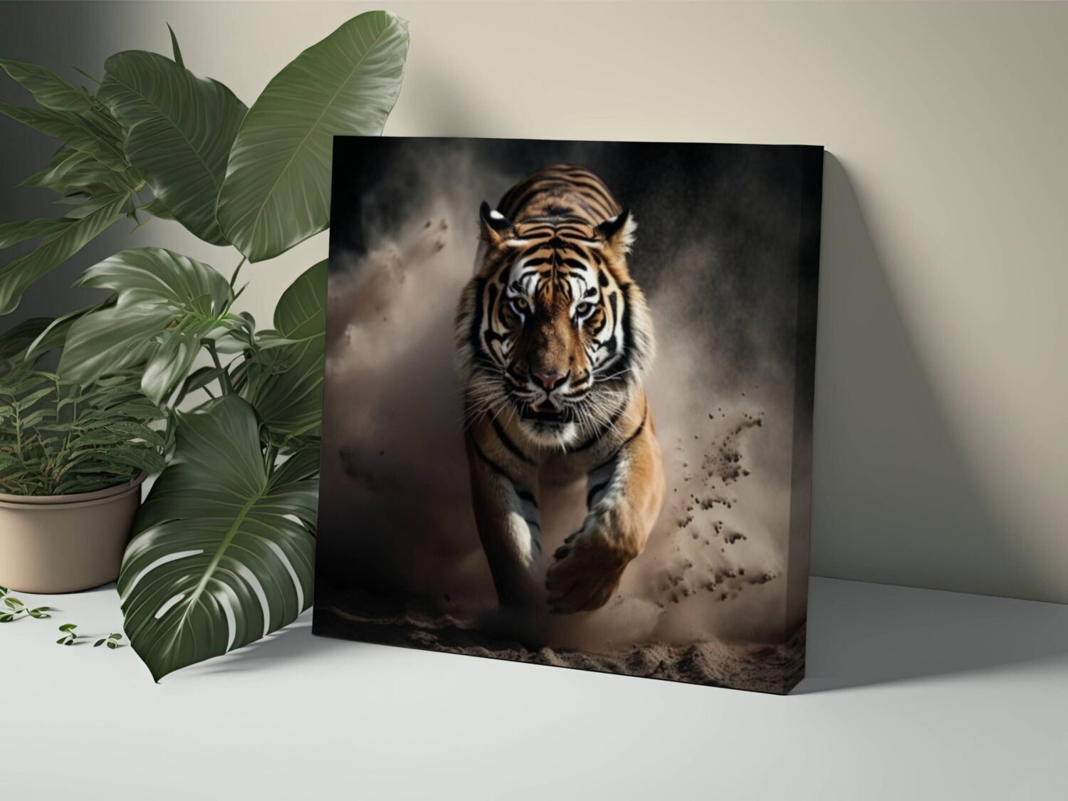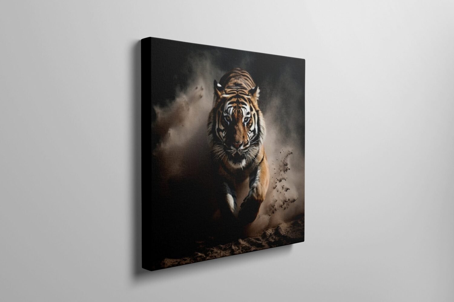 Witness the raw power and untamed spirit of the jungle with this photo of a tiger in full stride, emanating an aura of breathtaking intimidation. This remarkable scene captures the essence of the tiger's majestic presence as it surges forward, showcasing its unparalleled strength and grace.