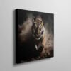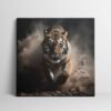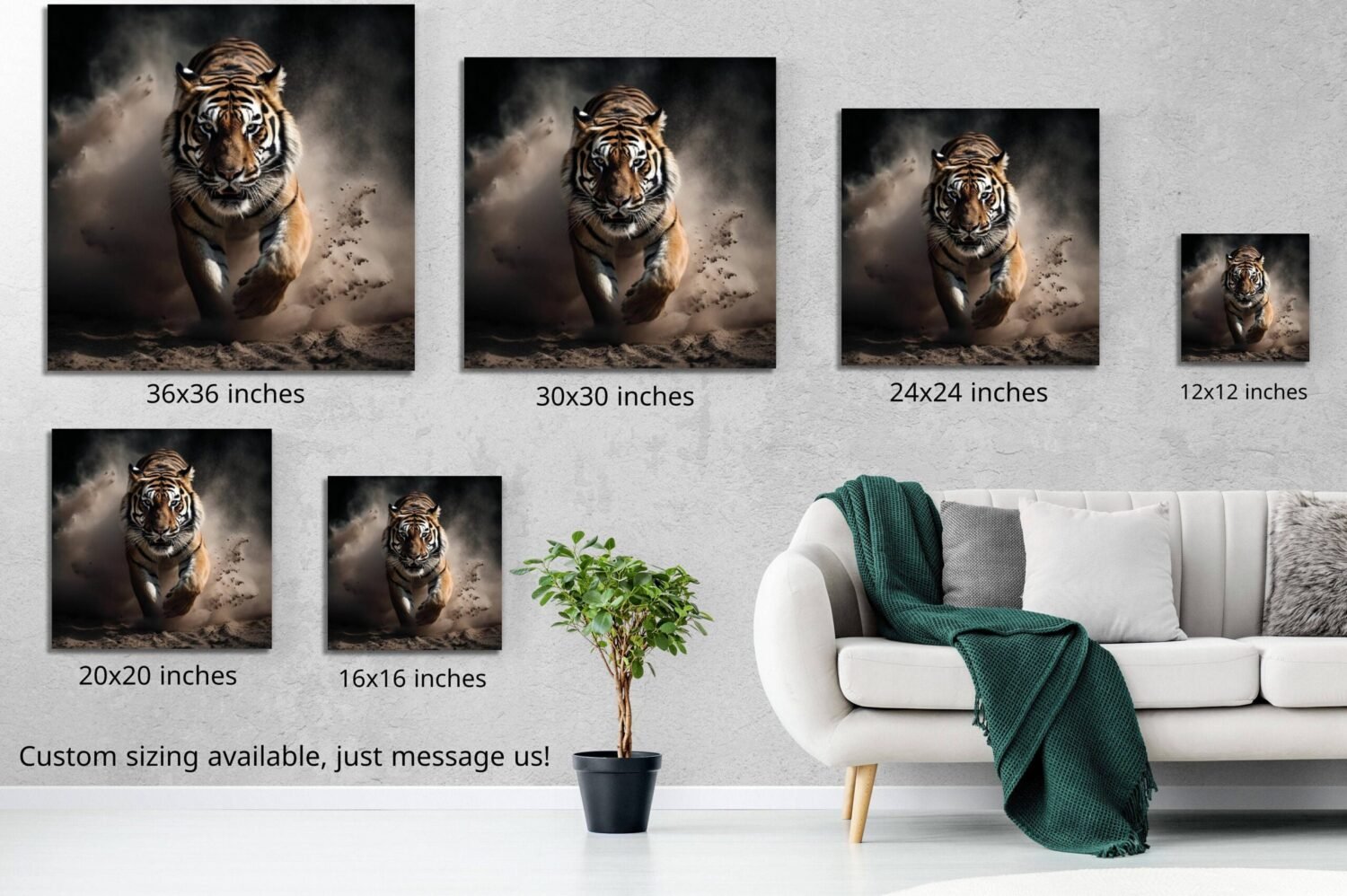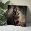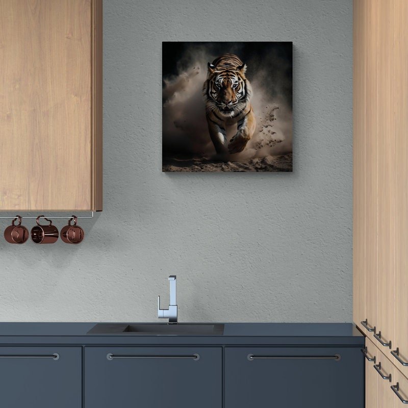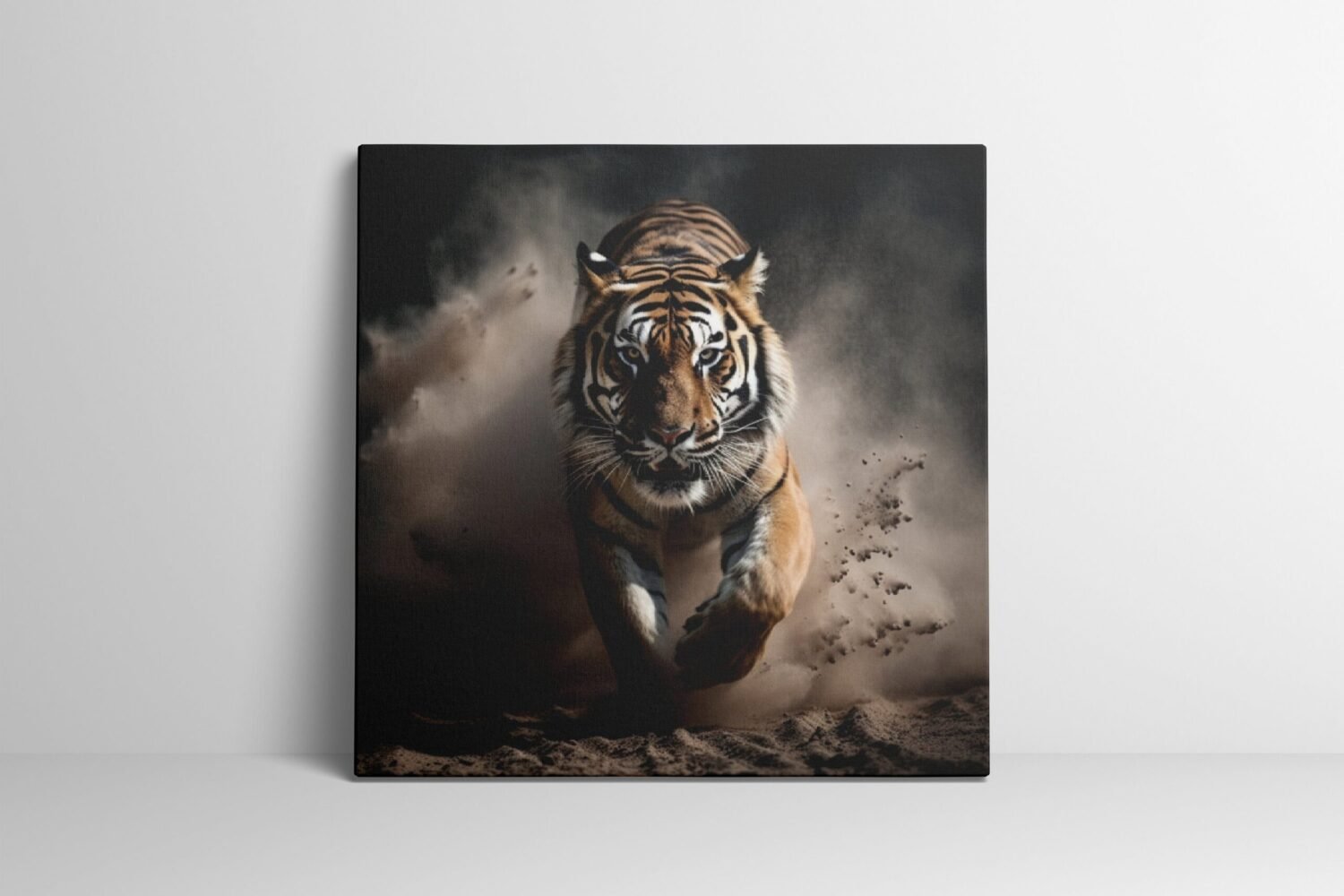 Witness the raw power and untamed spirit of the jungle with this photo of a tiger in full stride, emanating an aura of breathtaking intimidation. This remarkable scene captures the essence of the tiger's majestic presence as it surges forward, showcasing its unparalleled strength and grace.
