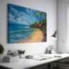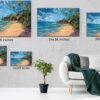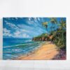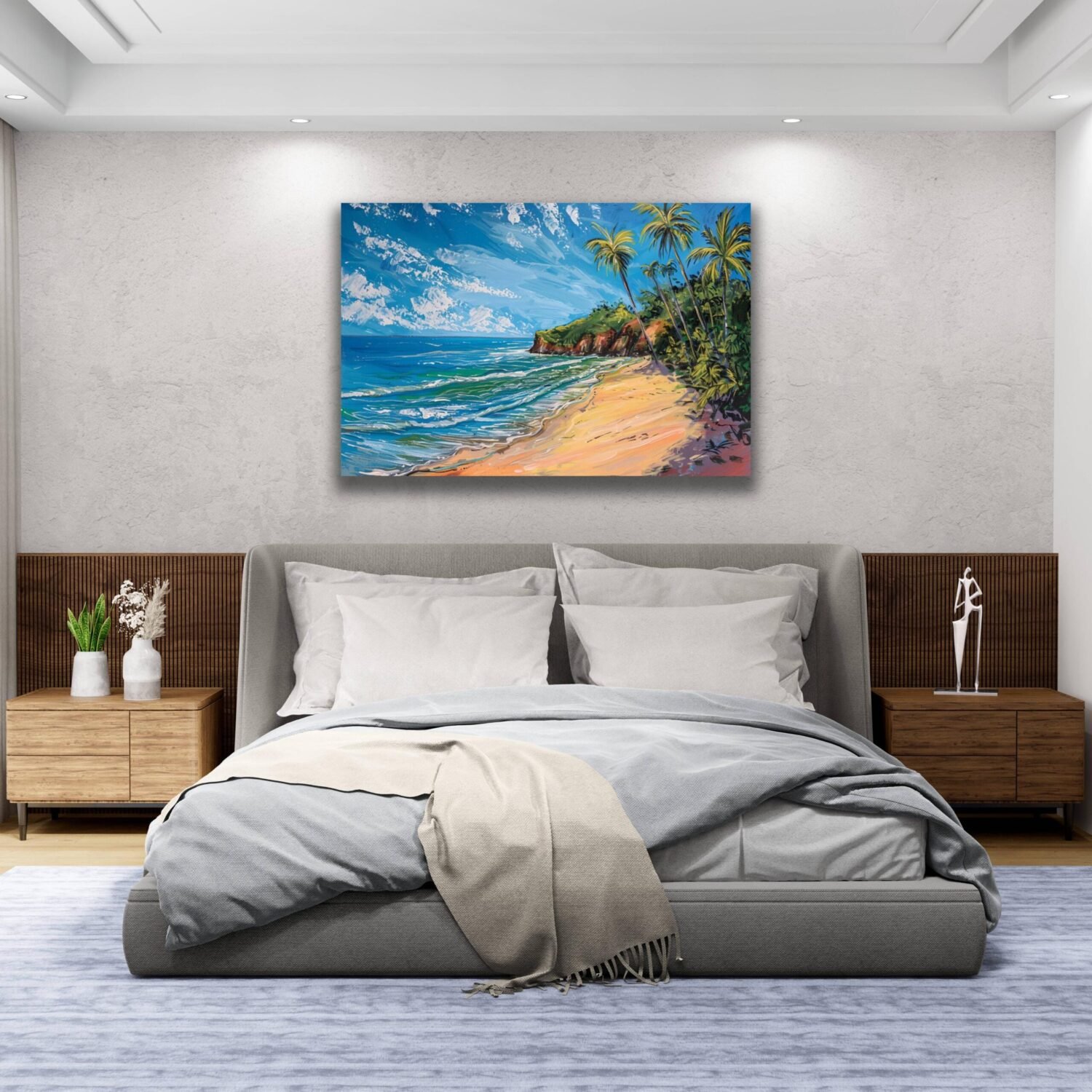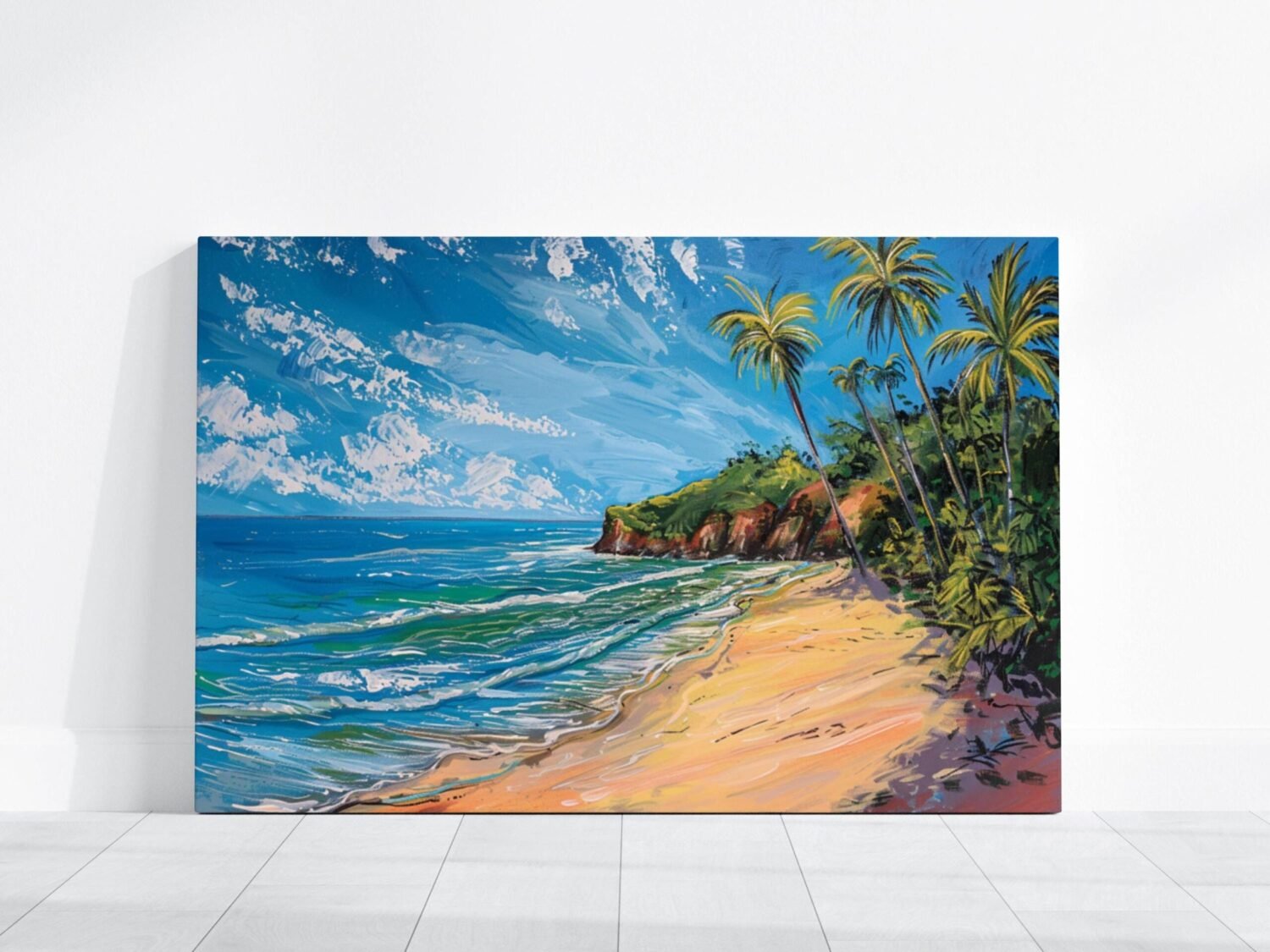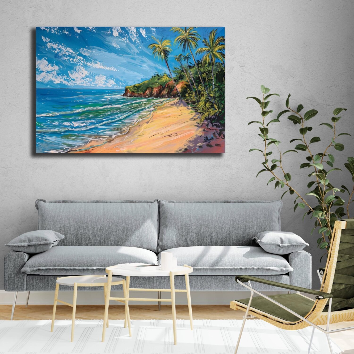 Tropical Beach Oil Painting, Coastal Landscape Wall Art with Palm Trees, Ocean Waves, Sandy Shoreline, Sunny Beach Vibes Canvas Large Print