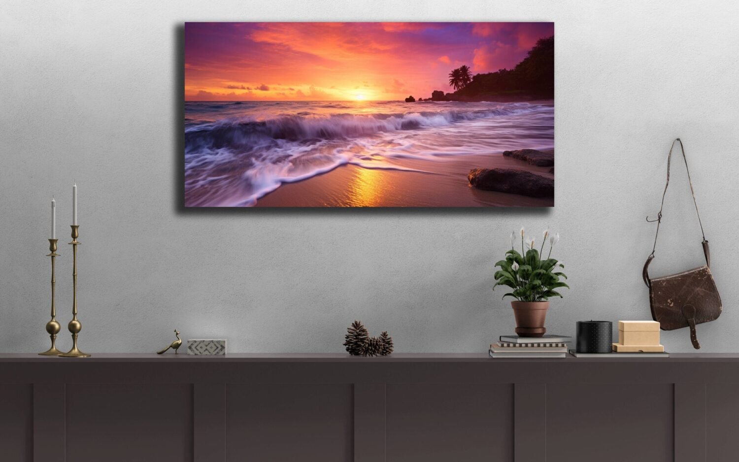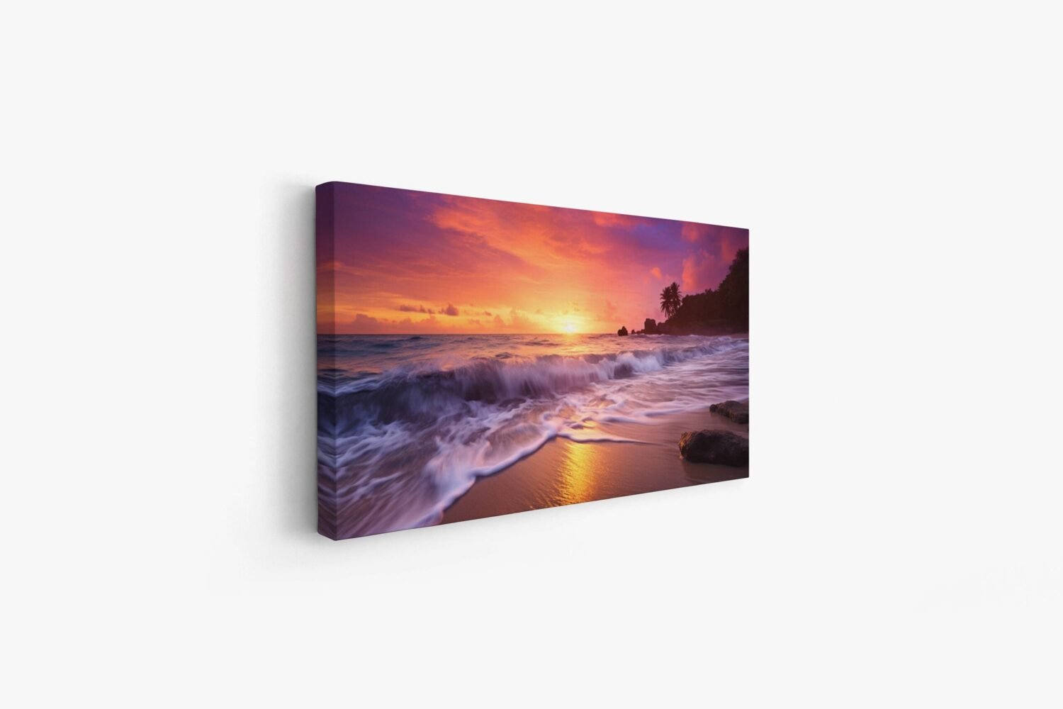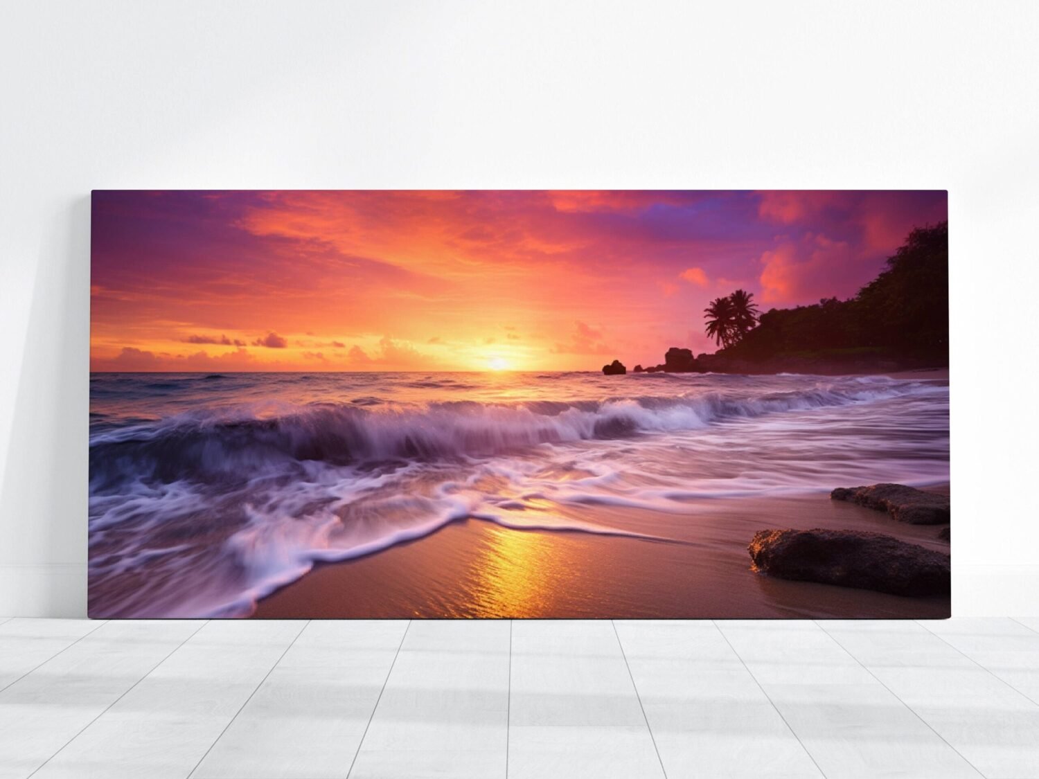 Elevate your space with this vibrant Hawaii beachscape featuring colorful skies, palm trees, and a serene ocean view. Perfect for adding a touch of coastal charm to your home decor. Available in various sizes. Bring the beauty of the beach into your living space!