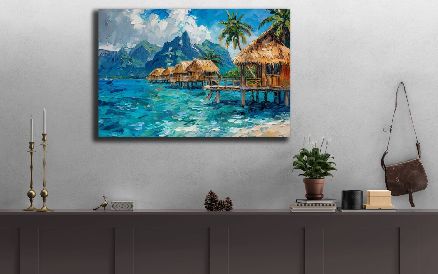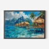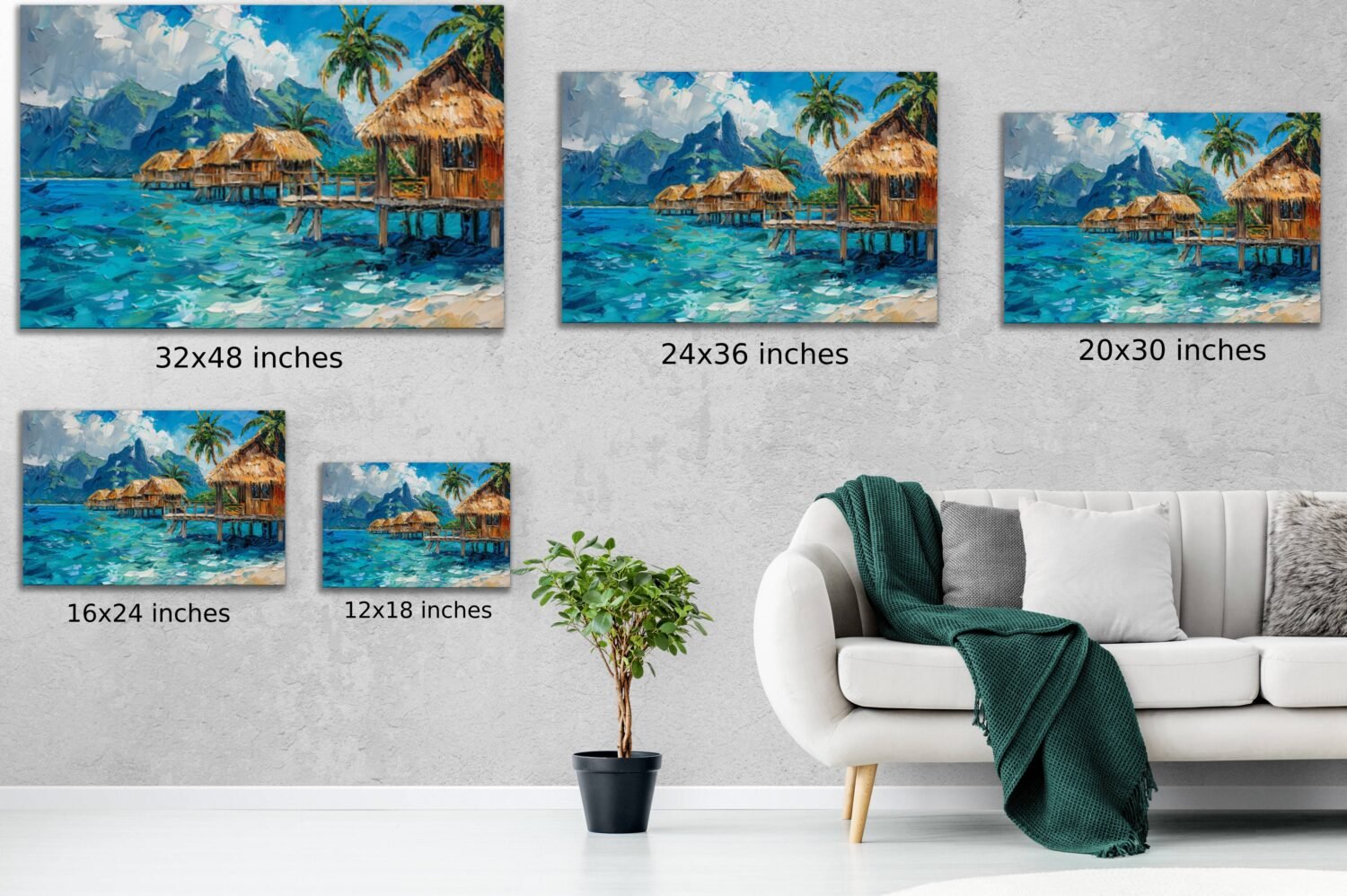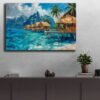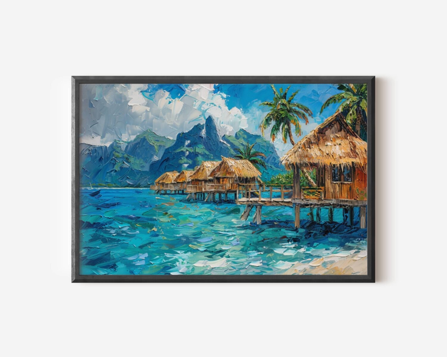 Escape into paradise with this tropical bungalow seascape print, featuring palm trees, turquoise waves, and overwater huts set against lush island mountains. This vibrant artwork captures the relaxing spirit of an exotic getaway and makes a stunning centerpiece for any home. Ideal for coastal living rooms, vacation homes, or modern interiors with a tropical touch, this print adds warmth, color, and serenity to your space.