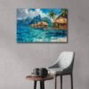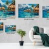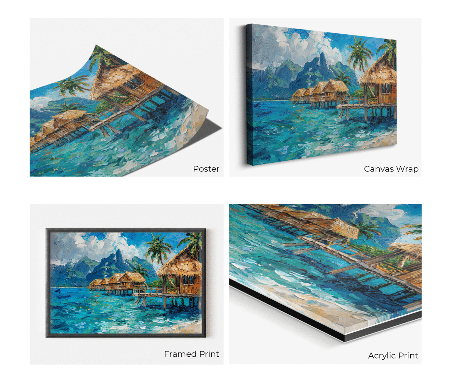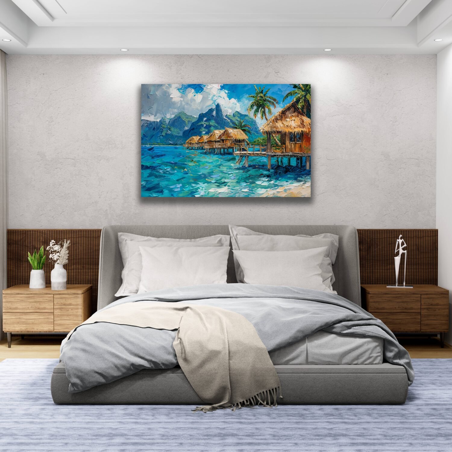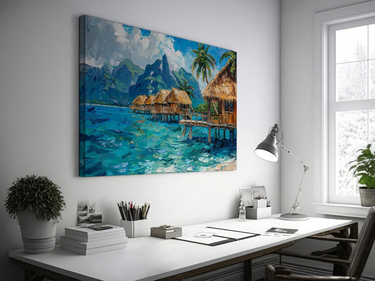 Escape into paradise with this tropical bungalow seascape print, featuring palm trees, turquoise waves, and overwater huts set against lush island mountains. This vibrant artwork captures the relaxing spirit of an exotic getaway and makes a stunning centerpiece for any home. Ideal for coastal living rooms, vacation homes, or modern interiors with a tropical touch, this print adds warmth, color, and serenity to your space.