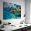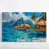 Tropical overwater bungalows wall art with ocean waves and palm trees — vibrant coastal seascape print perfect for beach houses and island decor.
