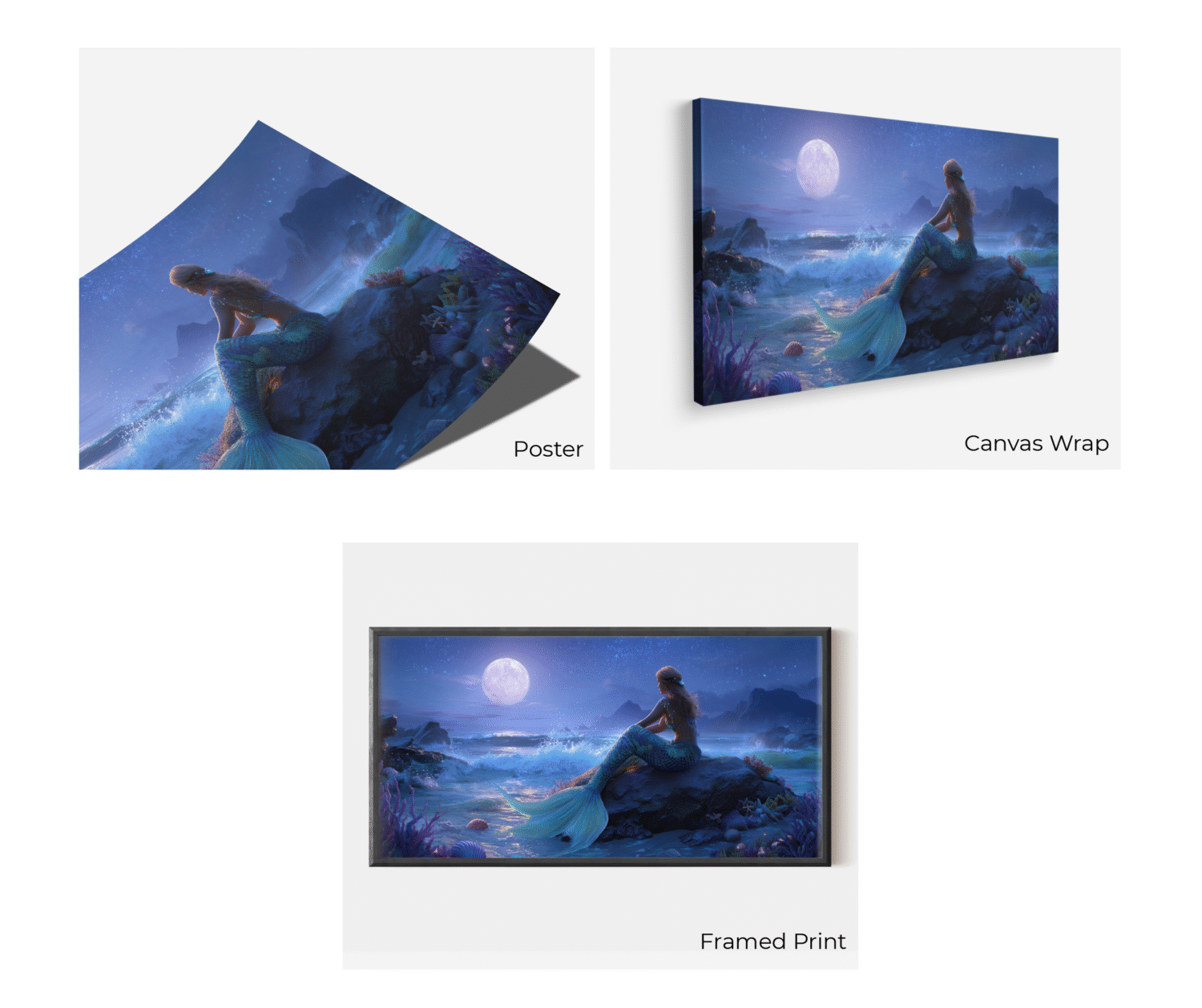 – Framed Prints: MDF frames, satin paper, covered with plexiglass. All orders default to a Black Wooden Frame, however Walnut and White are available as well. Comes ready to hang with mounted sawtooth hardware.