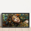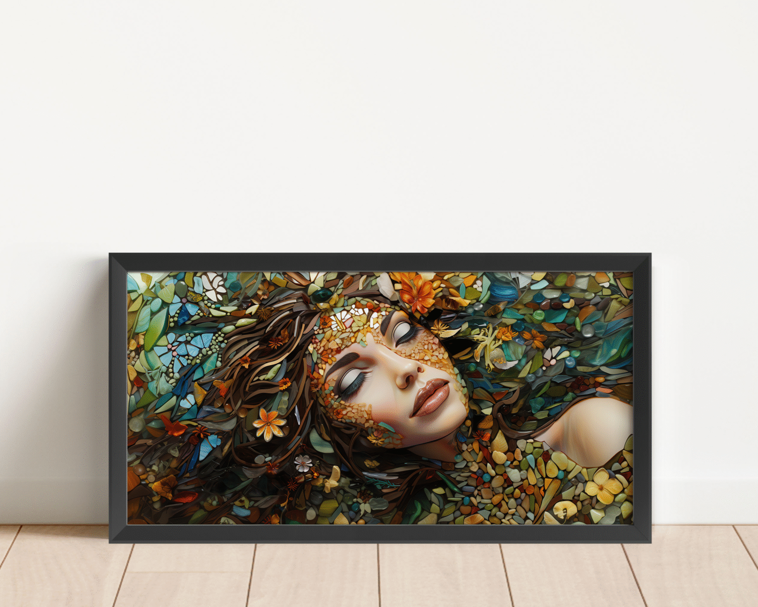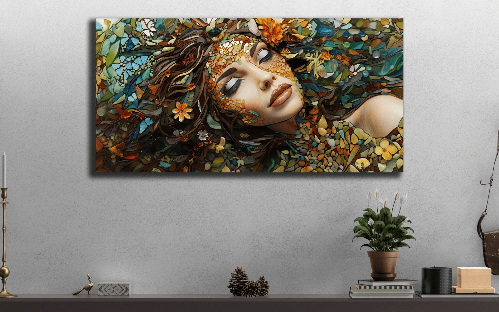 The pebbles and flowers, carefully arranged, create a mesmerizing mosaic pattern that adorns the womans face and body, forming a unique and intricate work of art.